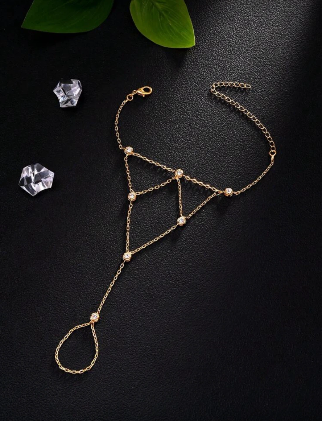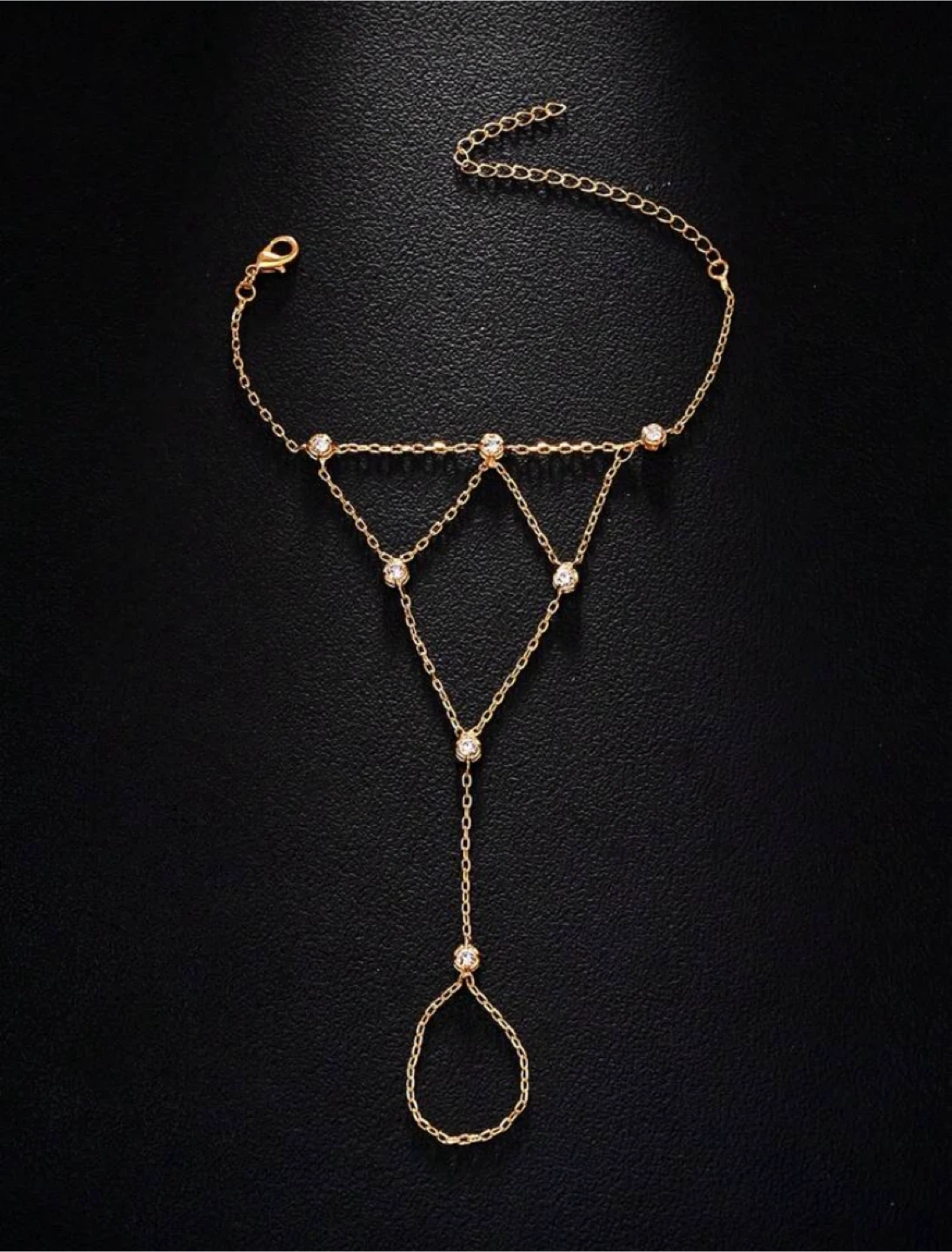 This is a beautiful gold hand chain slave bracelet. It's perfect for adding a touch of elegance to any outfit!