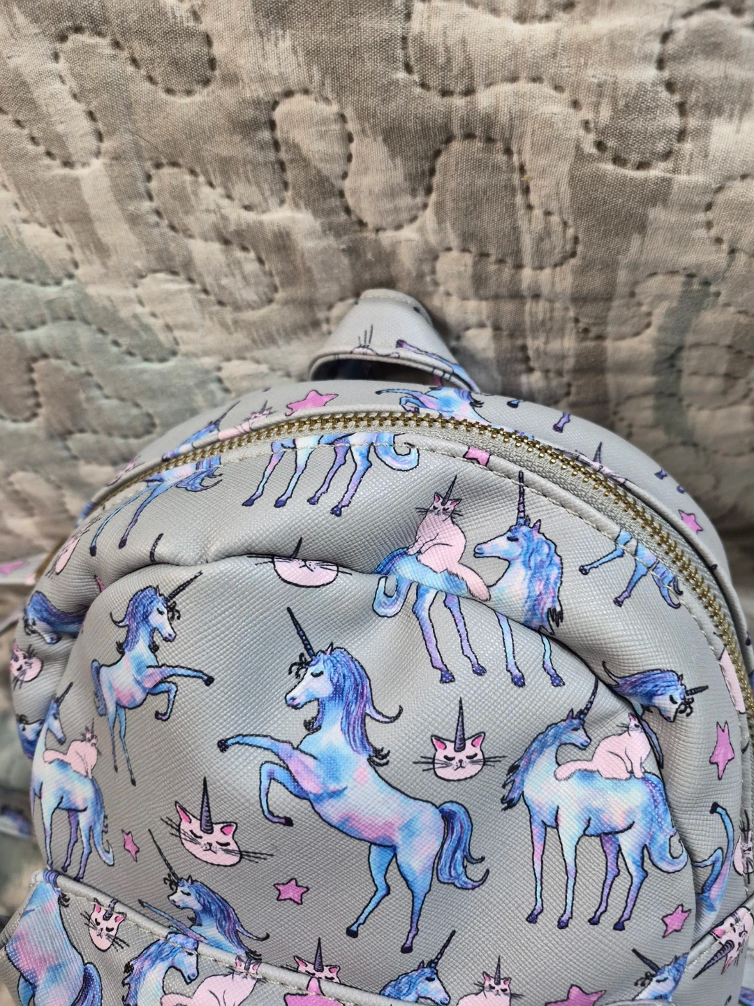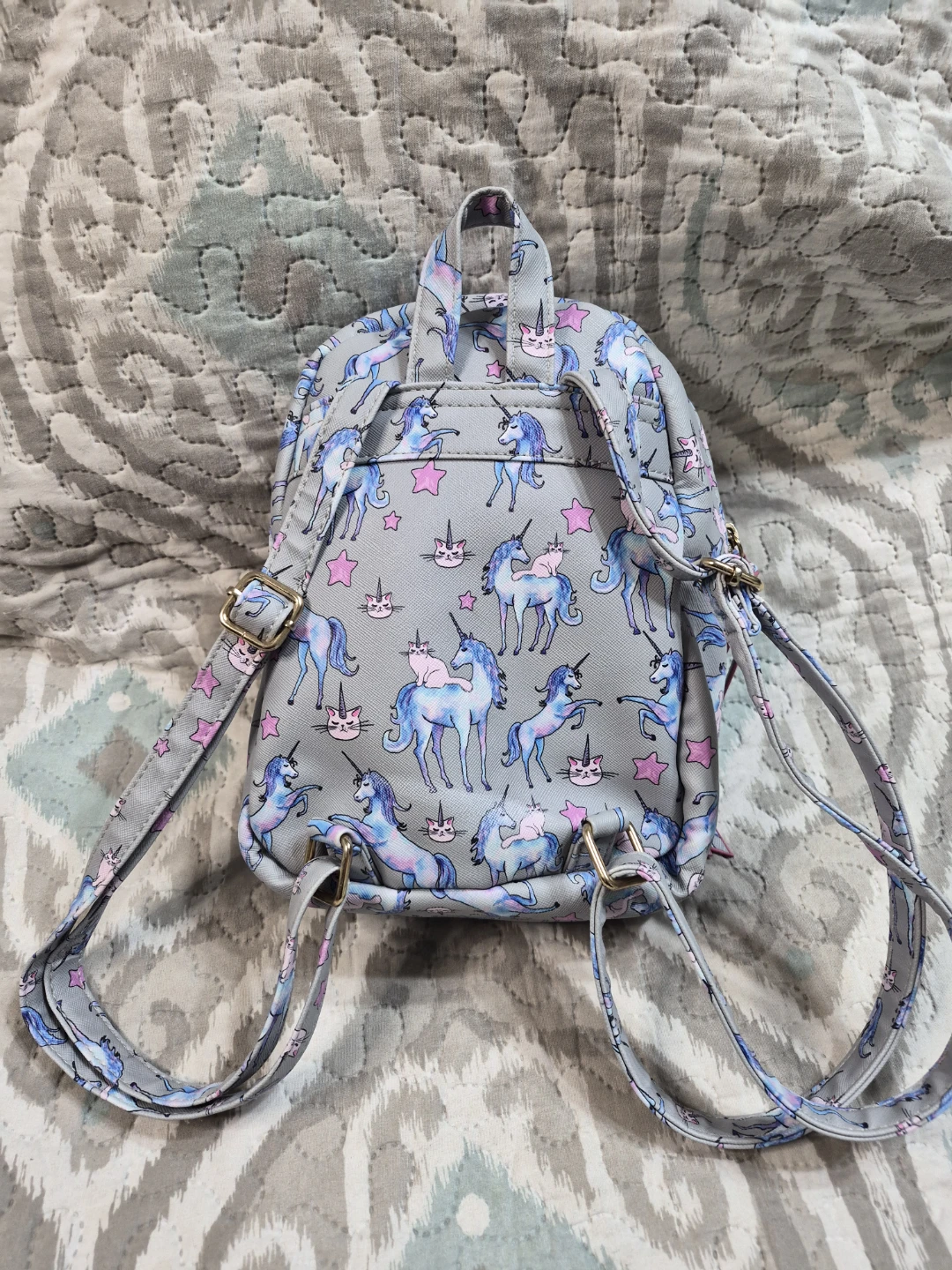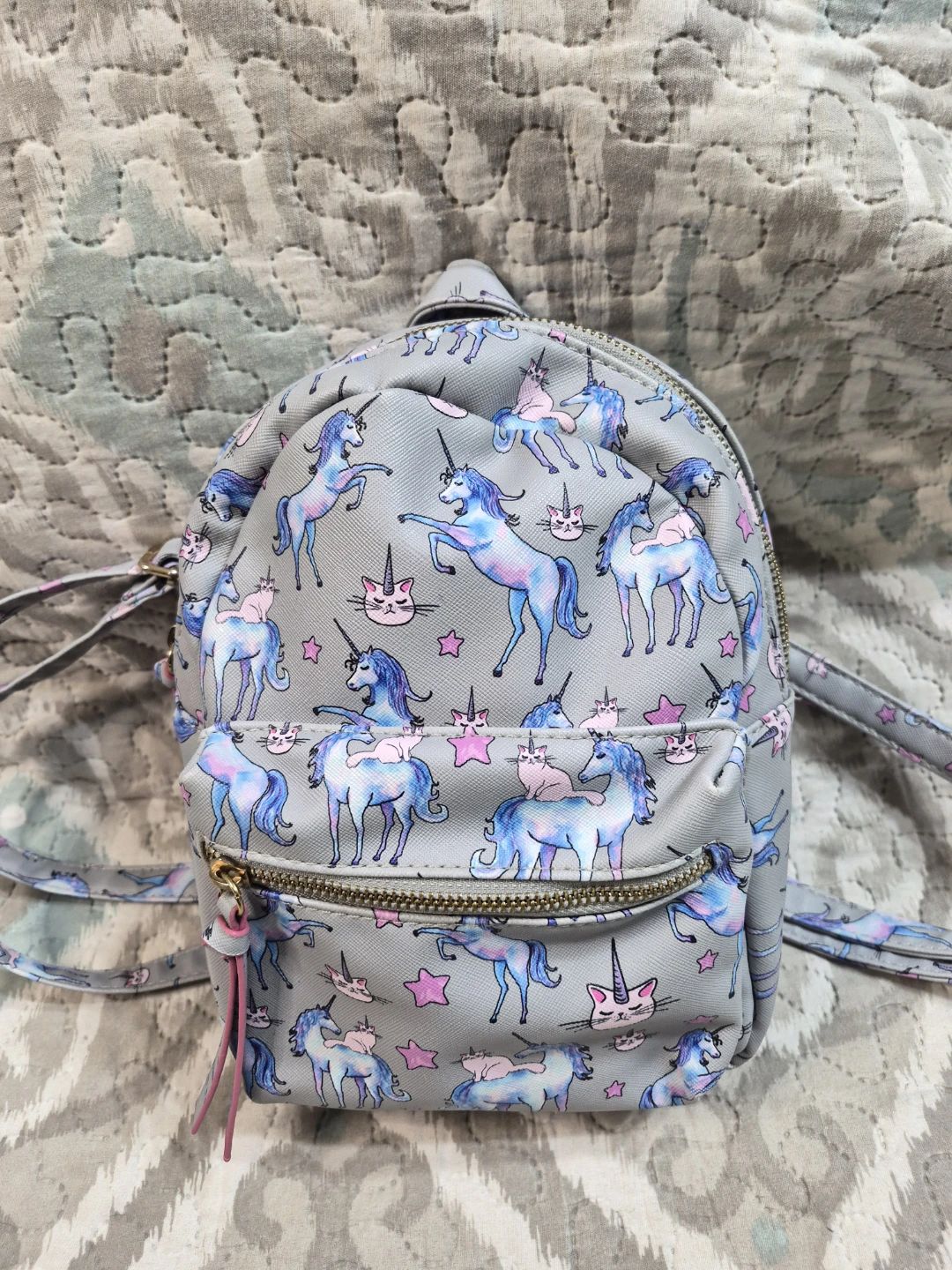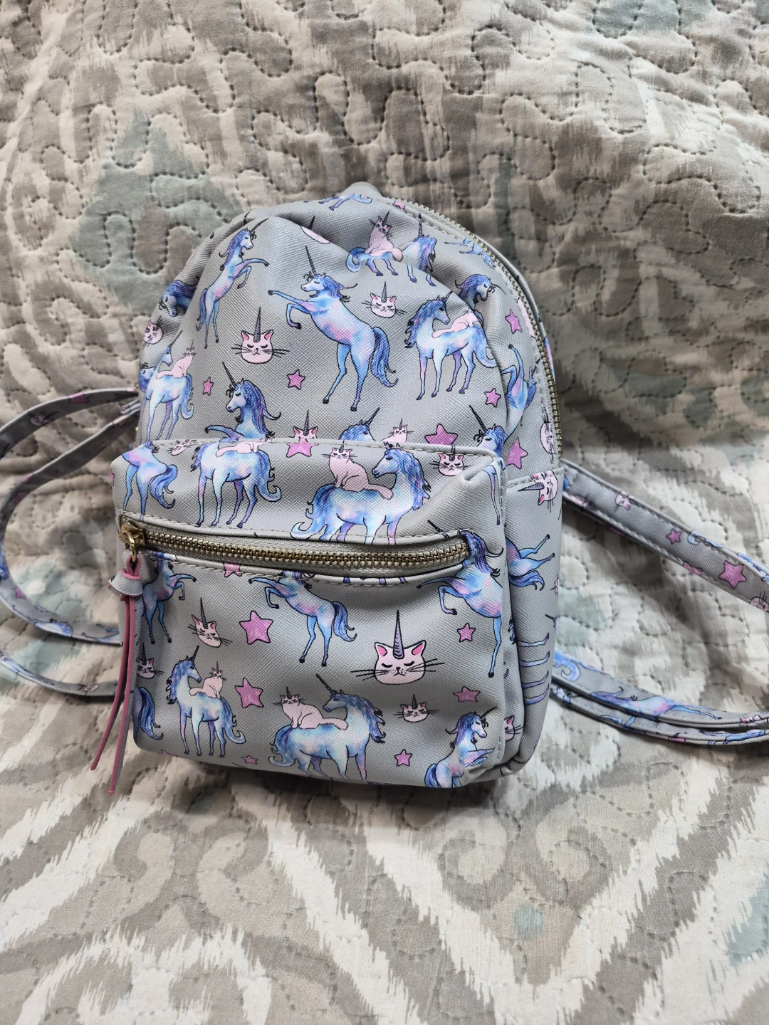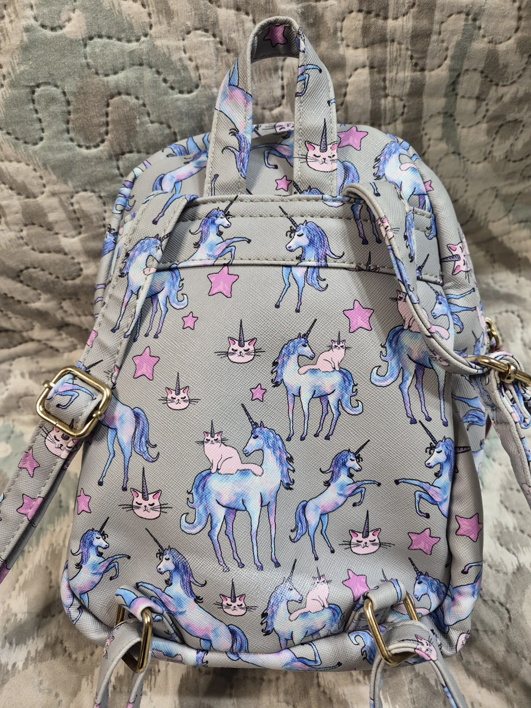 So Cute Under One Sky Unicorn & Cats Kitties Mini Backpack Grey & Pink Zippered Closure & 1 In Front Approx 10" x 9" Excellent Used Condition please see all pictures