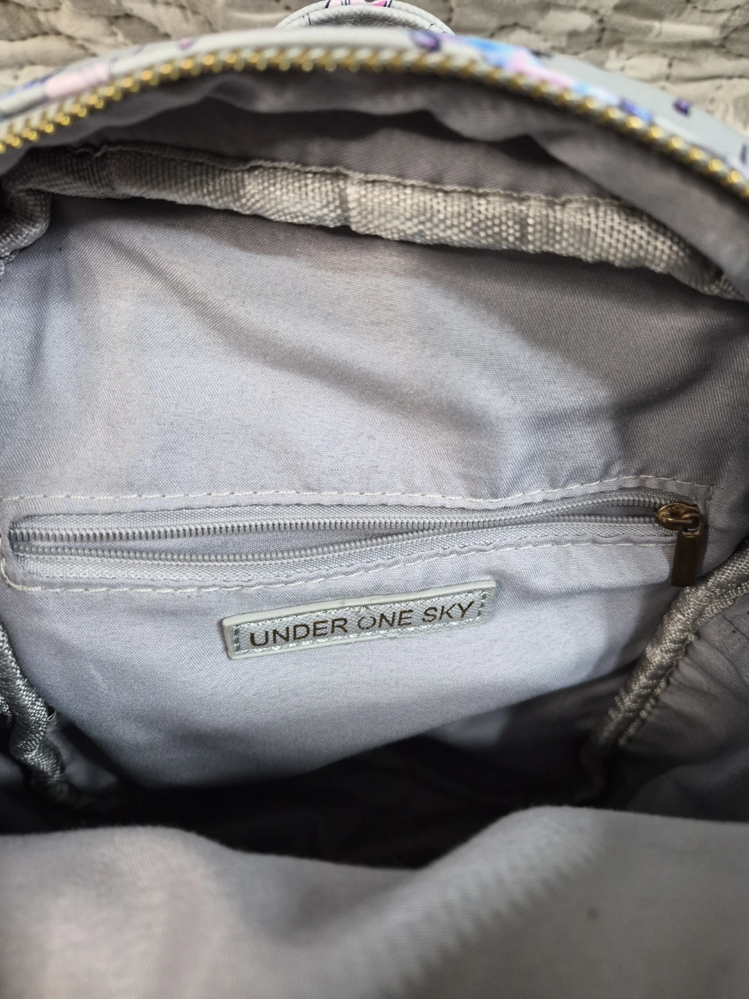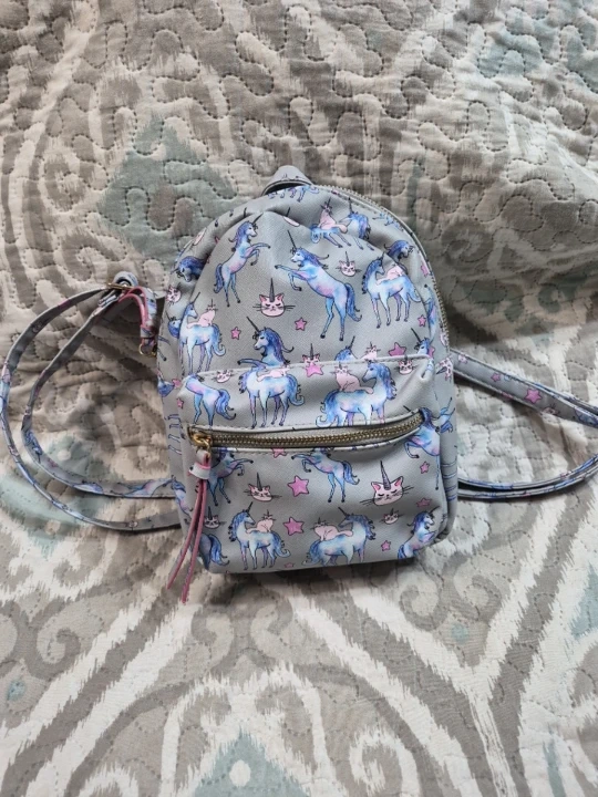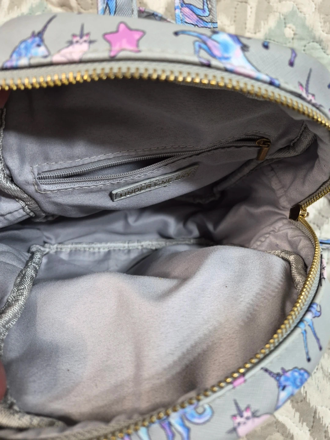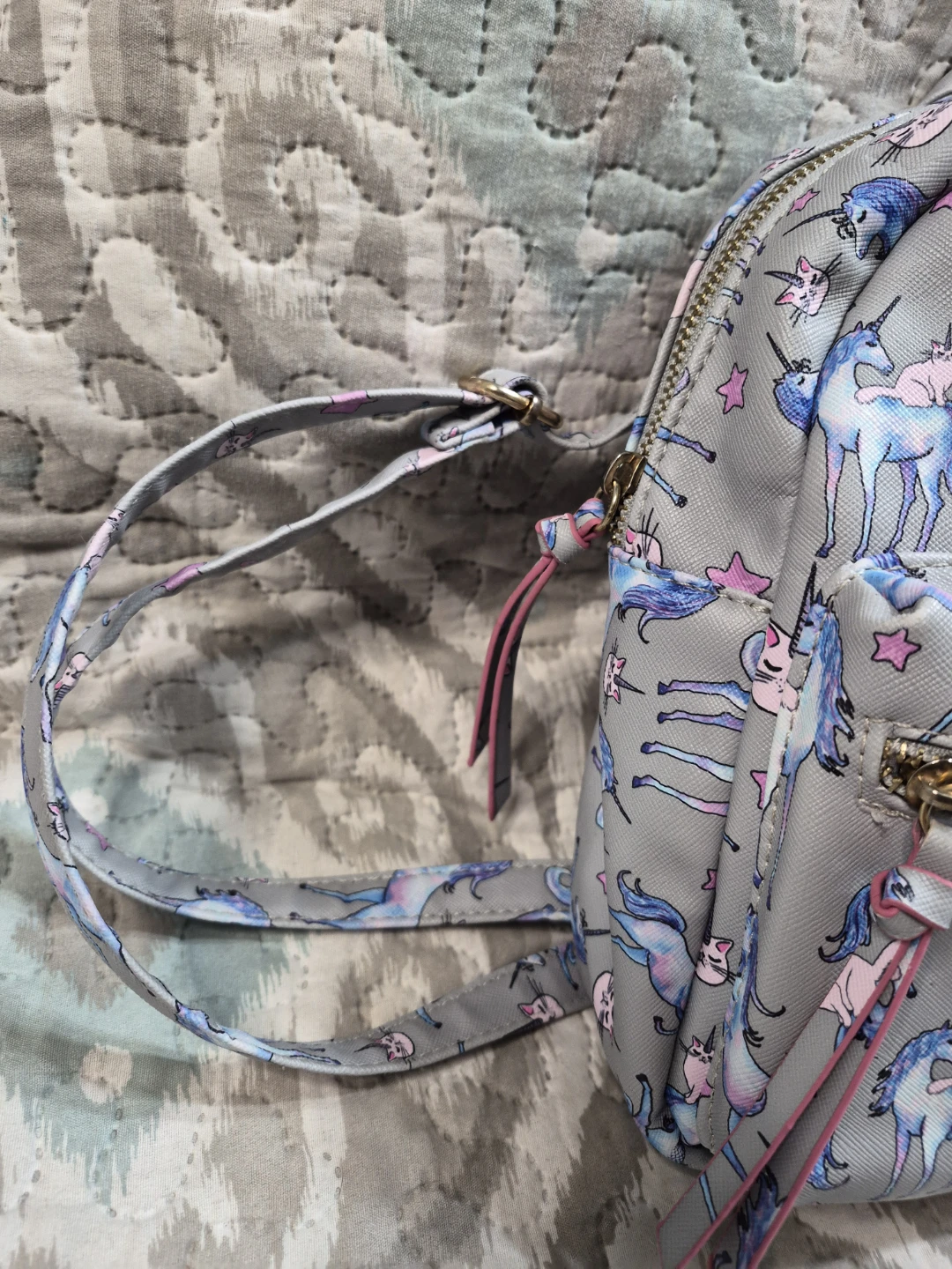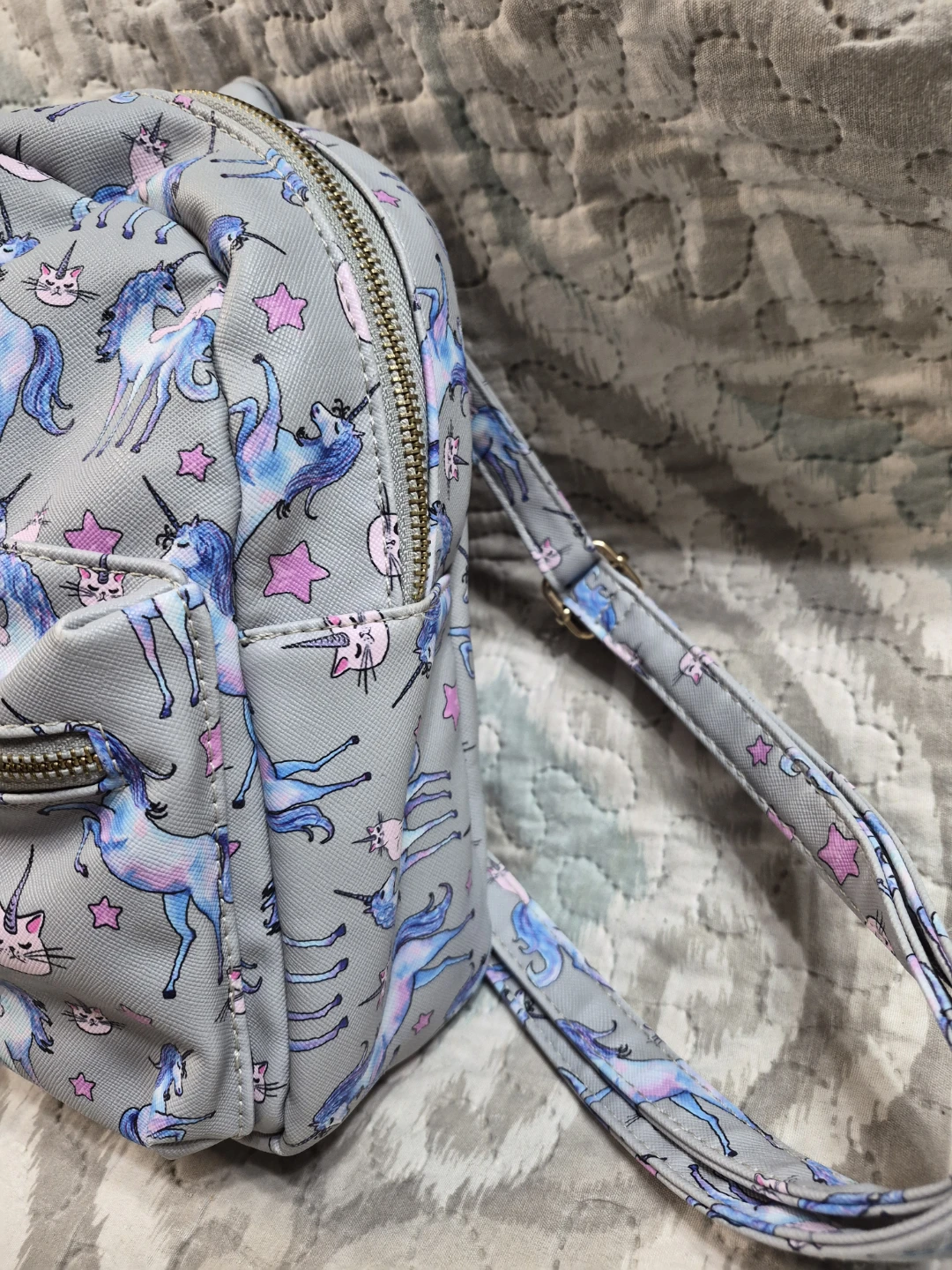 So Cute Under One Sky Unicorn & Cats Kitties Mini Backpack Grey & Pink Zippered Closure & 1 In Front Approx 10" x 9" Excellent Used Condition please see all pictures