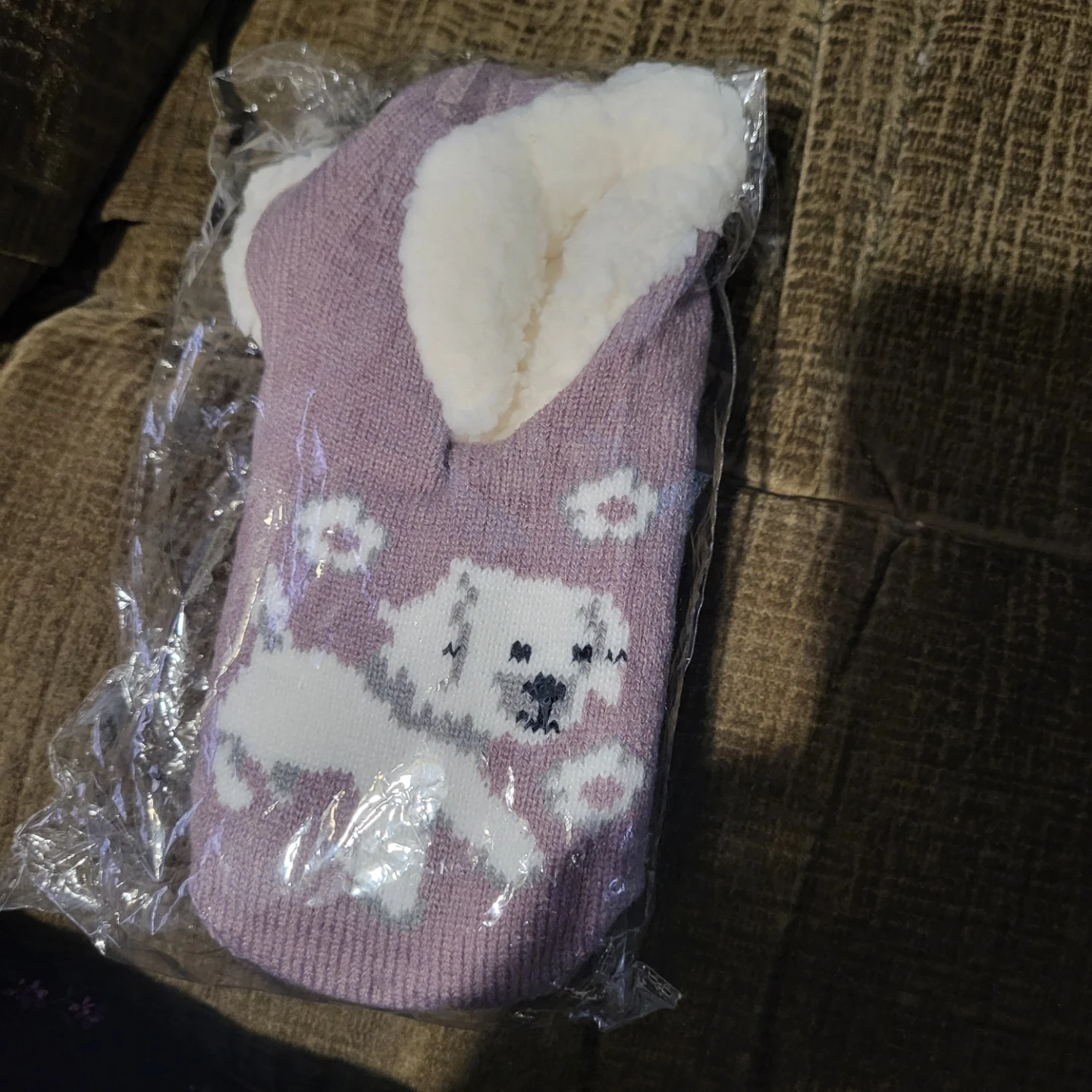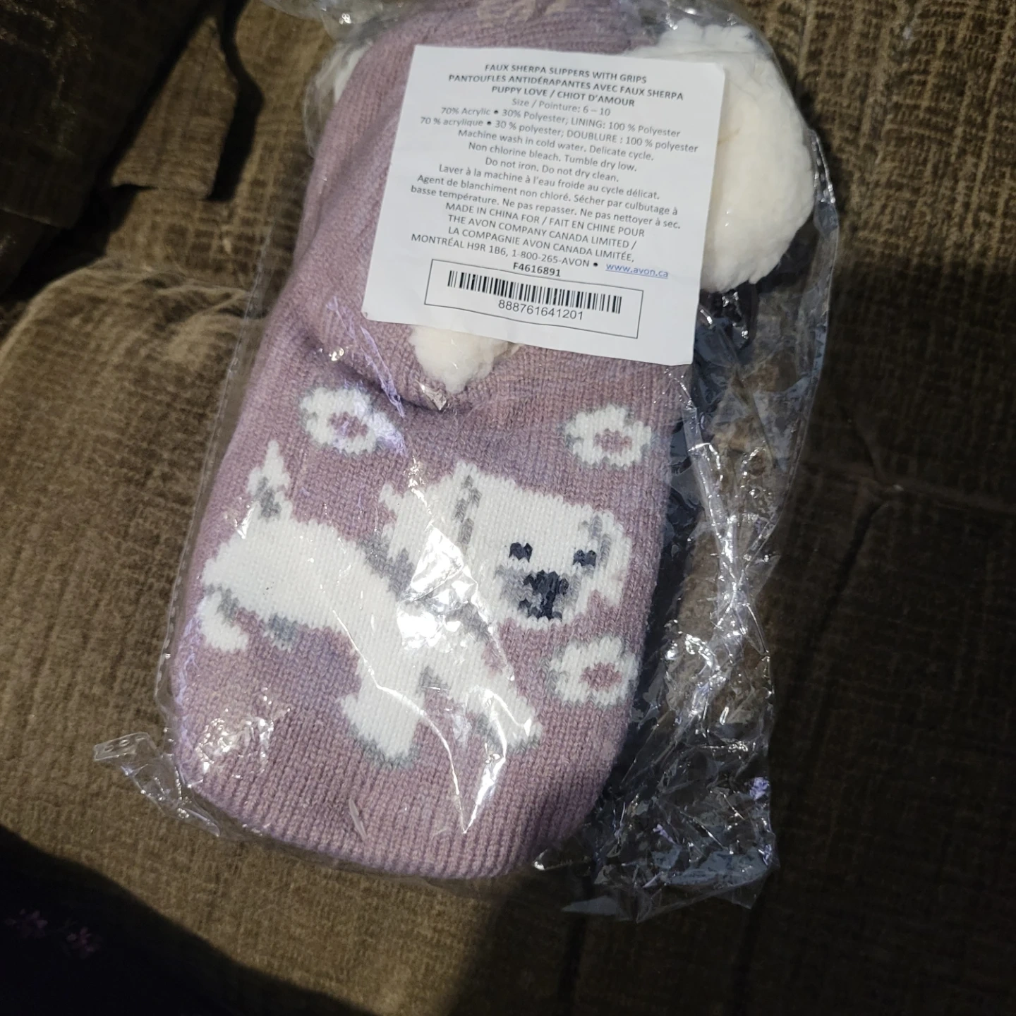 These adorable Avon Puppy Love Faux Sherpa Slippers with Grips are brand new and still in their original packaging! They're a size 8-10 and feature a cute puppy design on a soft, lilac-coloured knit. The lining is a cozy faux sherpa material, perfect for keeping your feet warm and comfy around the house
