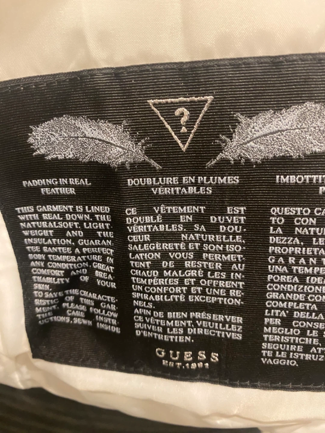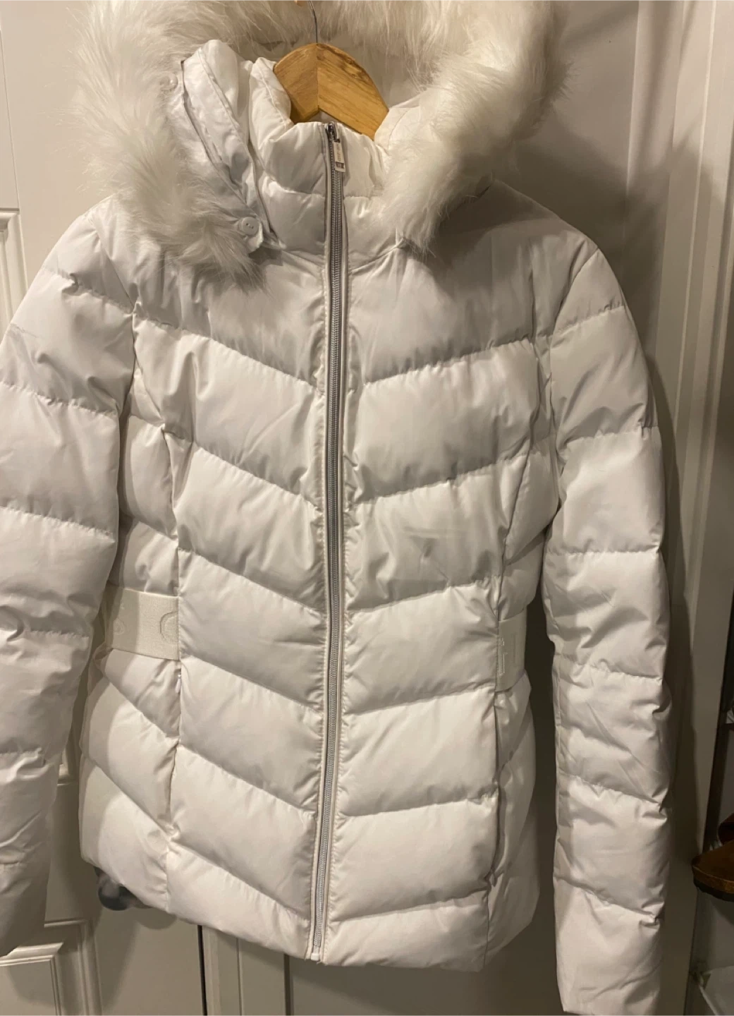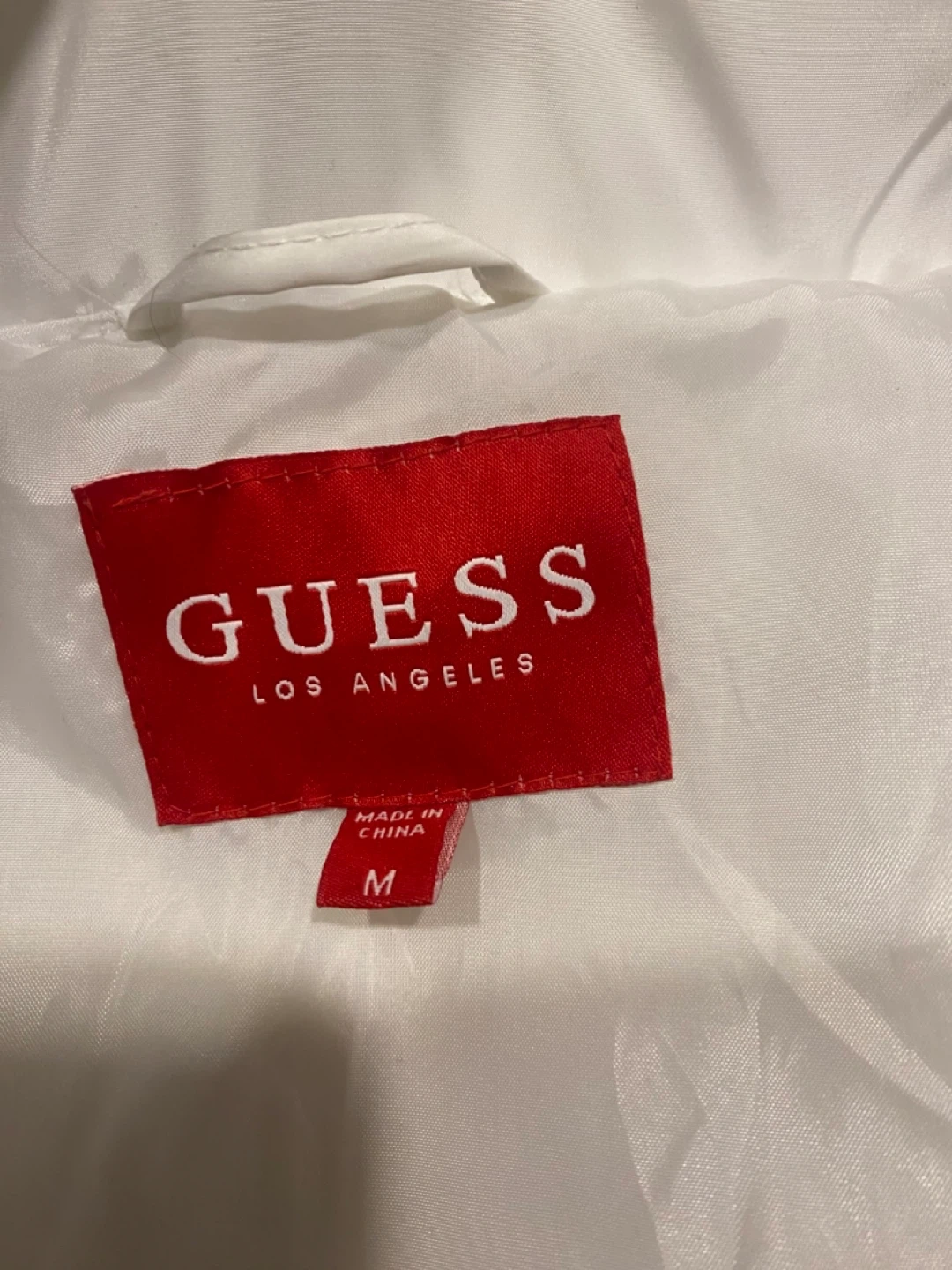 Selling a Guess white puffer jacket in size medium. It's in great condition and features a faux fur hood. The jacket is lined with real down, making it lightweight and warm. Perfect for the
