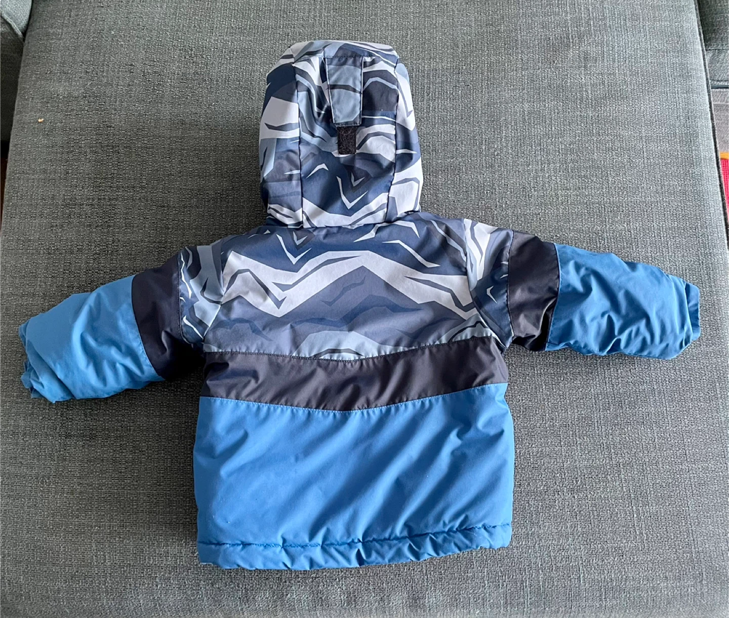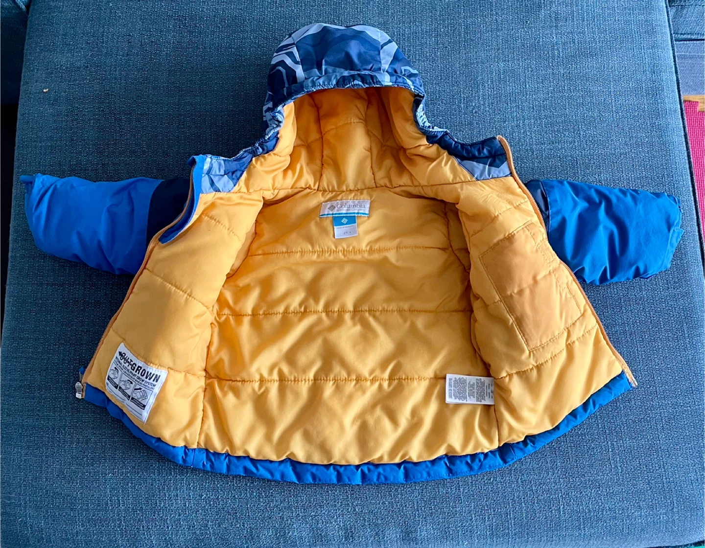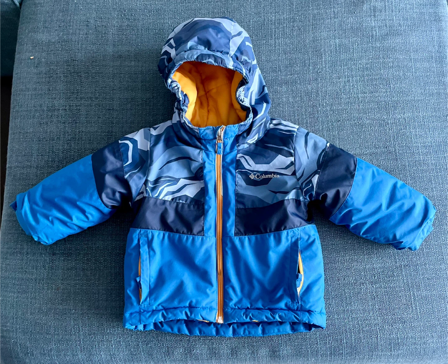 Keep your little one warm with this Columbia toddler winter jacket! It's in great condition and ready for snowy adventures. The jacket features a cozy hood and a bright blue colour with a fun pattern, perfect for staying visible on those winter days