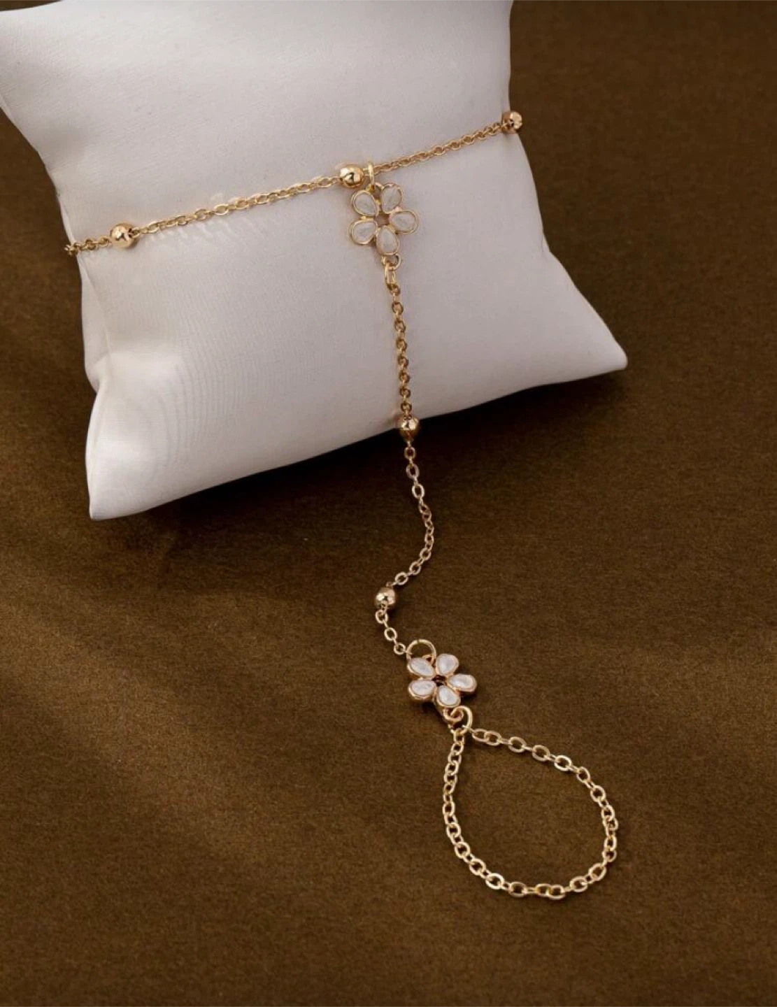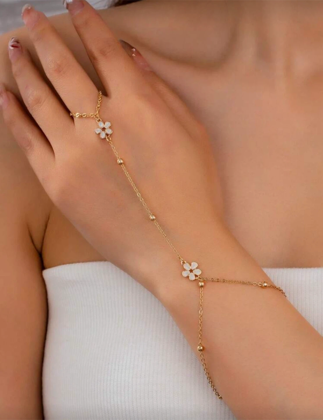 Selling a beautiful gold hand chain bracelet featuring delicate flower accents. It measures 18+5cm around the wrist and 3.5cm for the finger loop. It's a lovely piece to add a touch of elegance to any outfit!
