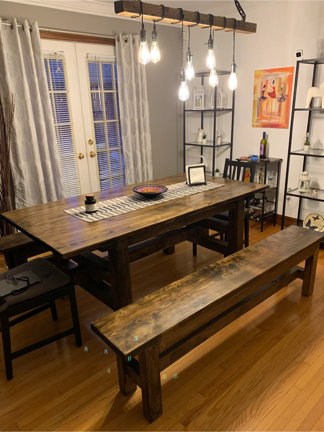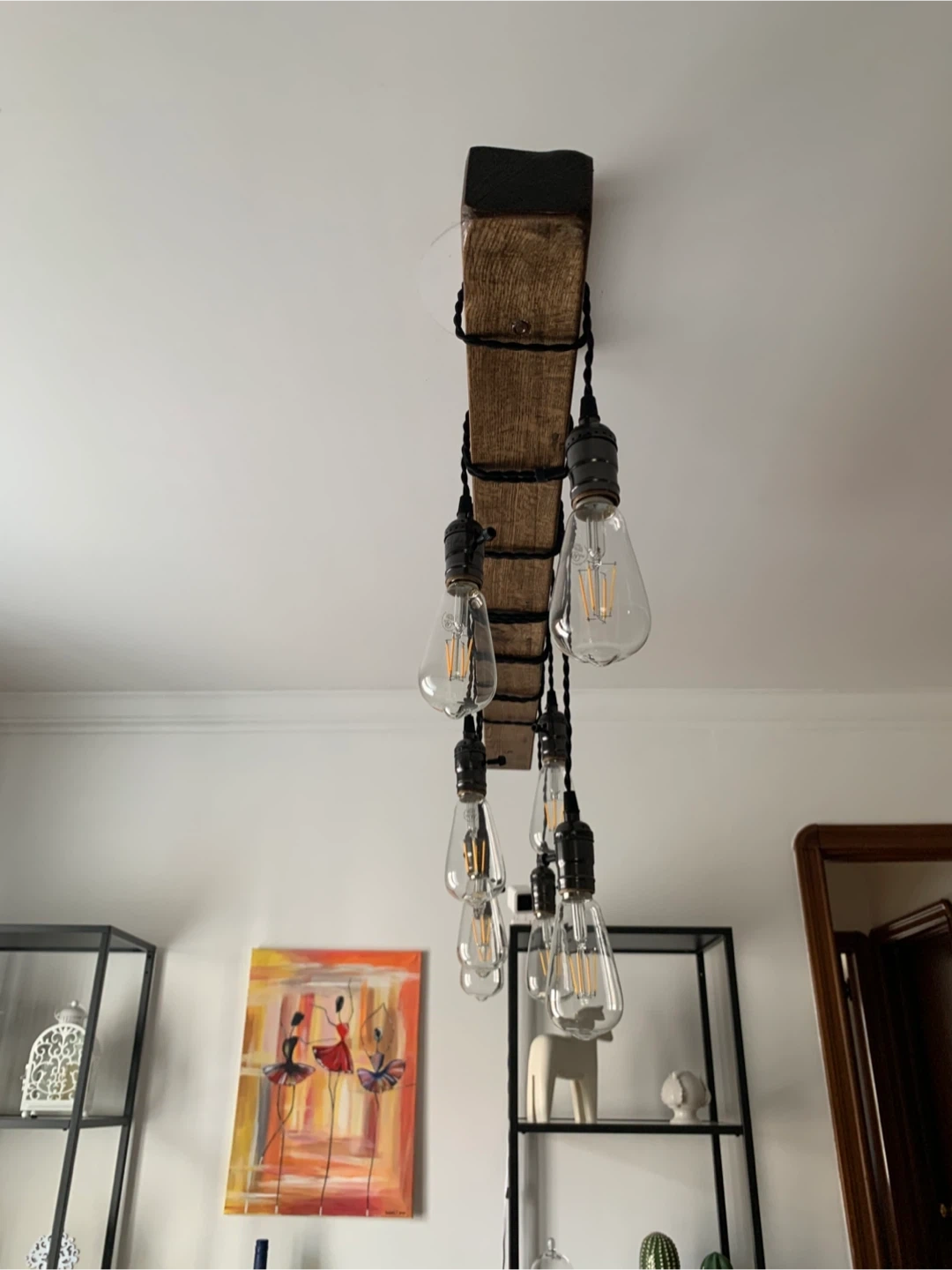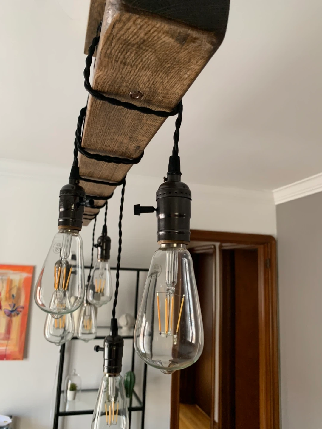 Here's a beautiful rustic chandelier that would look great in a dining room or living room! It features a wooden beam and Edison-style bulbs for a warm and inviting glow. It's in great condition and ready to brighten up your space