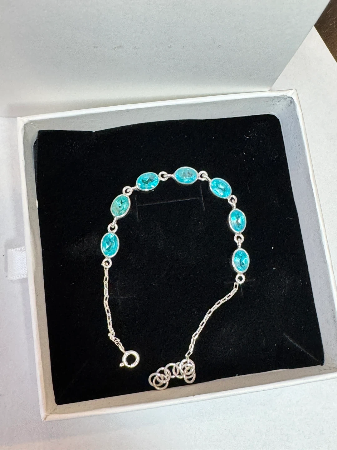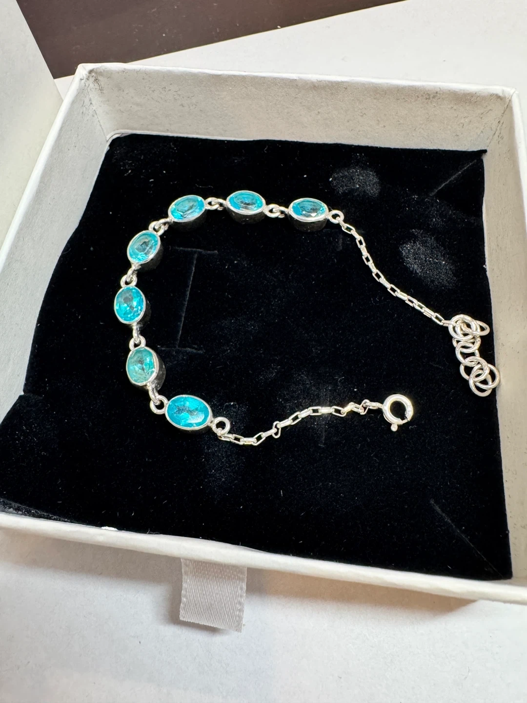 πΈπΈHere's a lovely silver bracelet featuring beautiful blue stones. It comes in its original box, ready to be worn or gifted! paraiba topaz bracelet. Length 16cm - 18cm.πΈπΈ