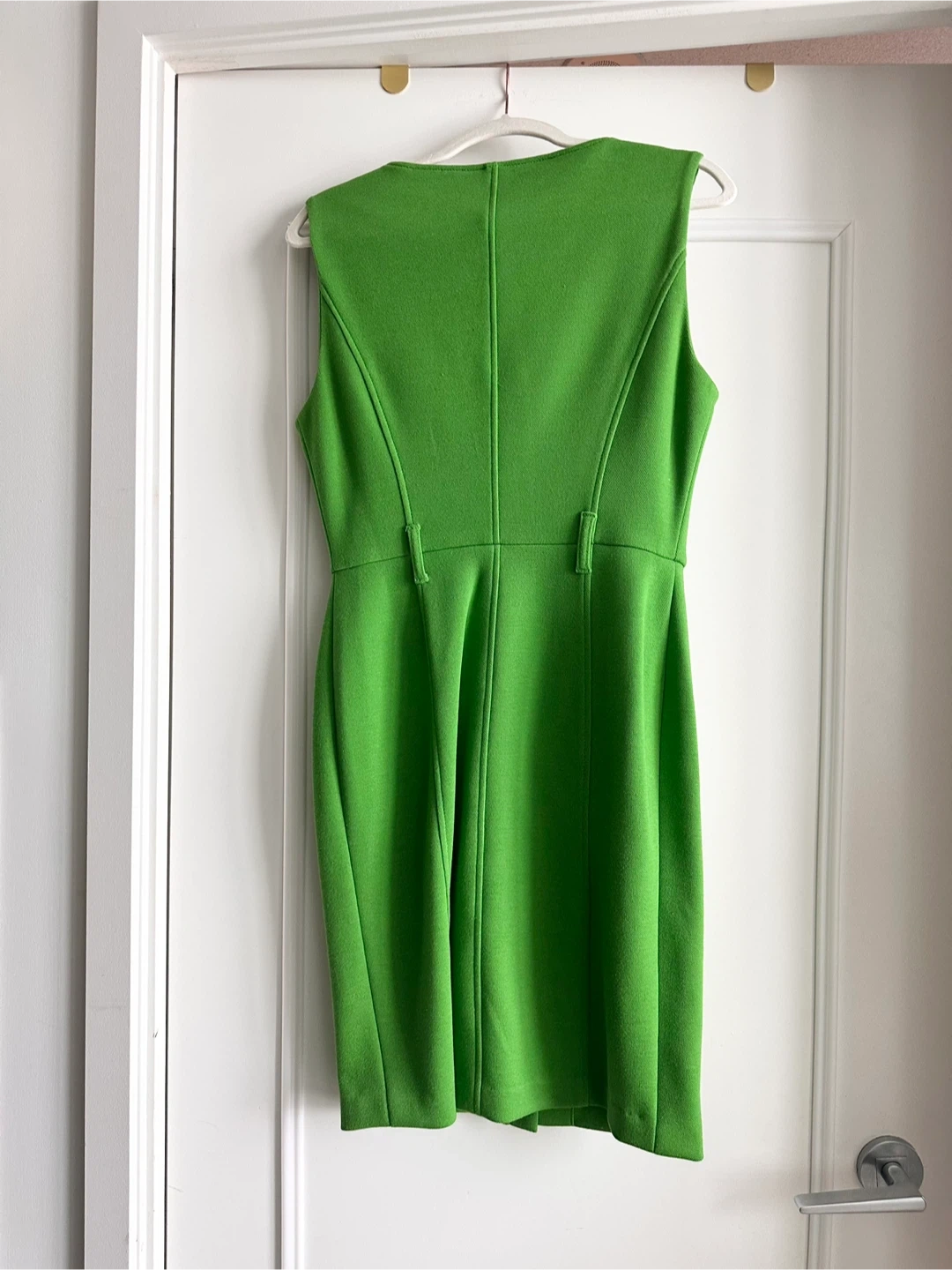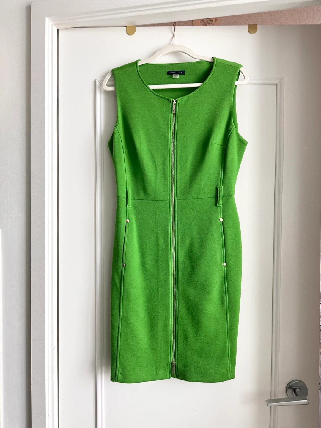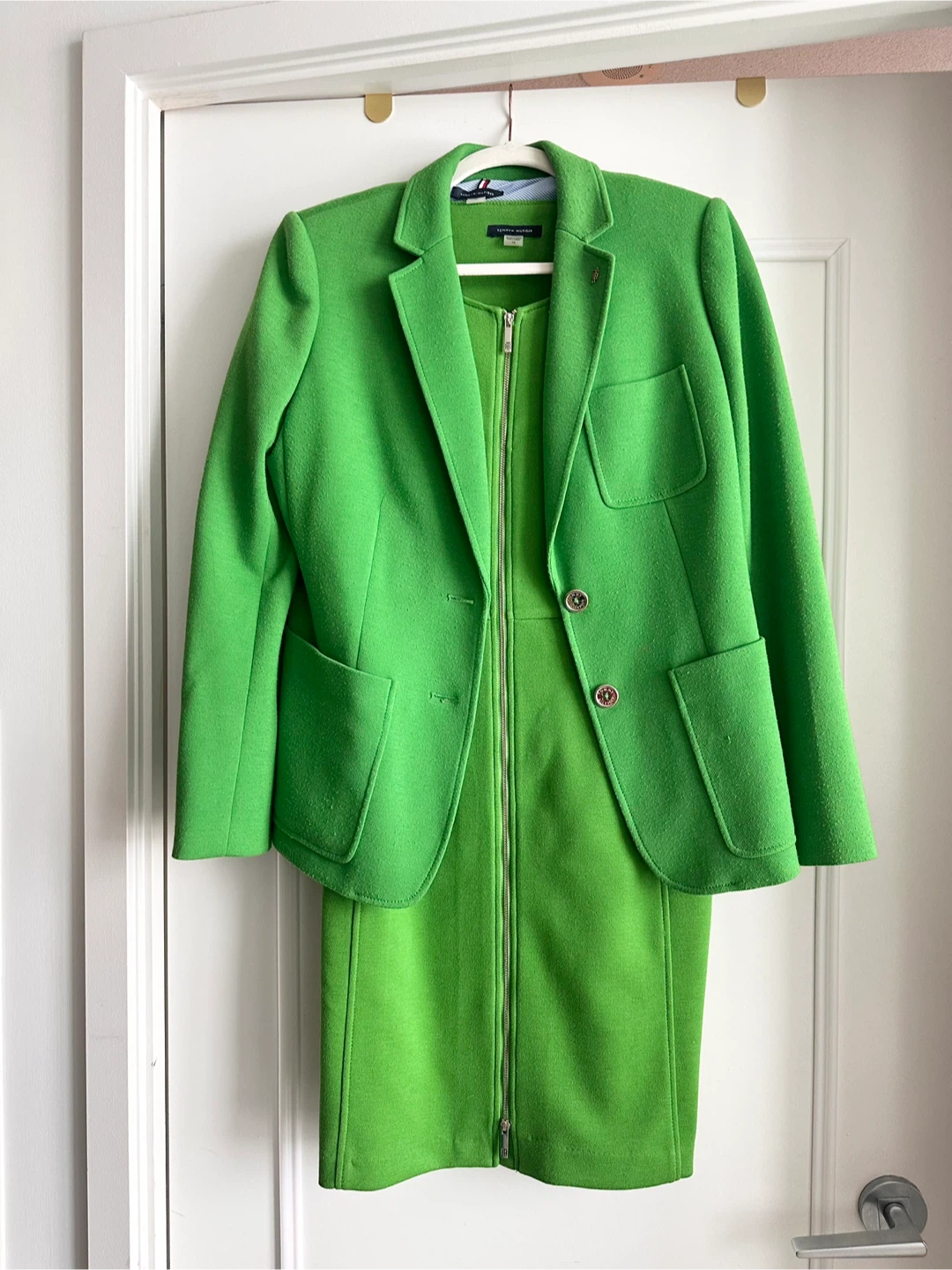 Selling a vibrant green dress suit from Tommy Hilfiger! This set includes a sleeveless dress with a zipper front and a matching blazer. Both pieces are in excellent condition and are a size 10. Perfect for adding a pop of colour to your wardrobe!