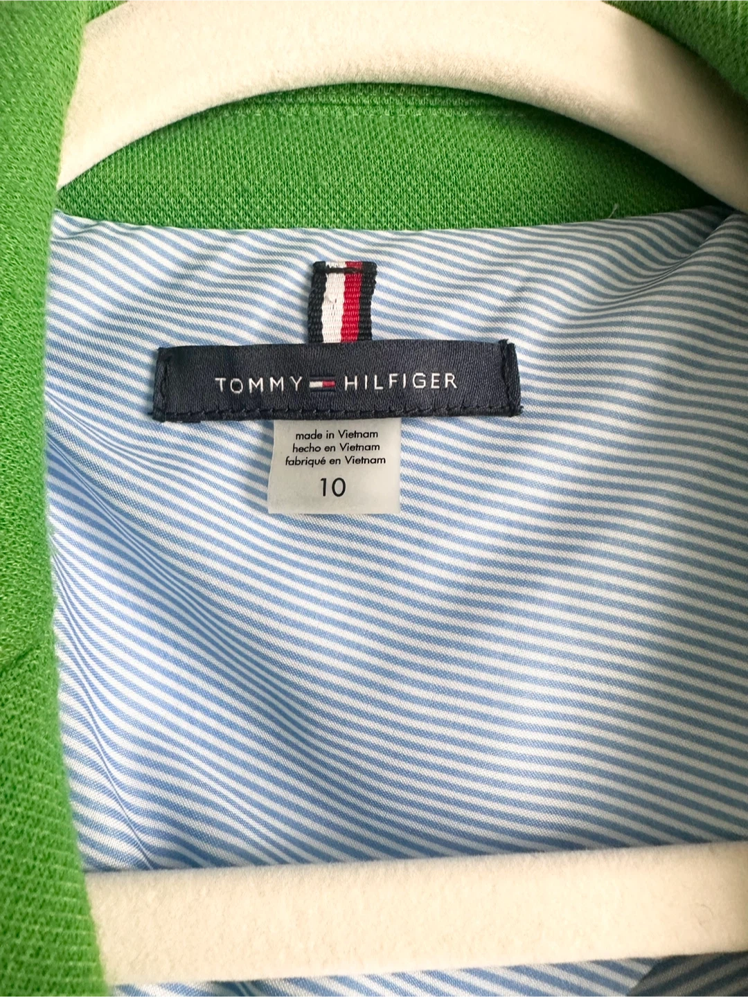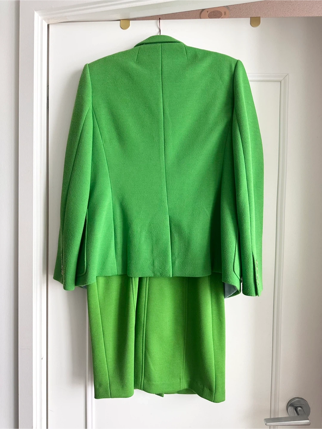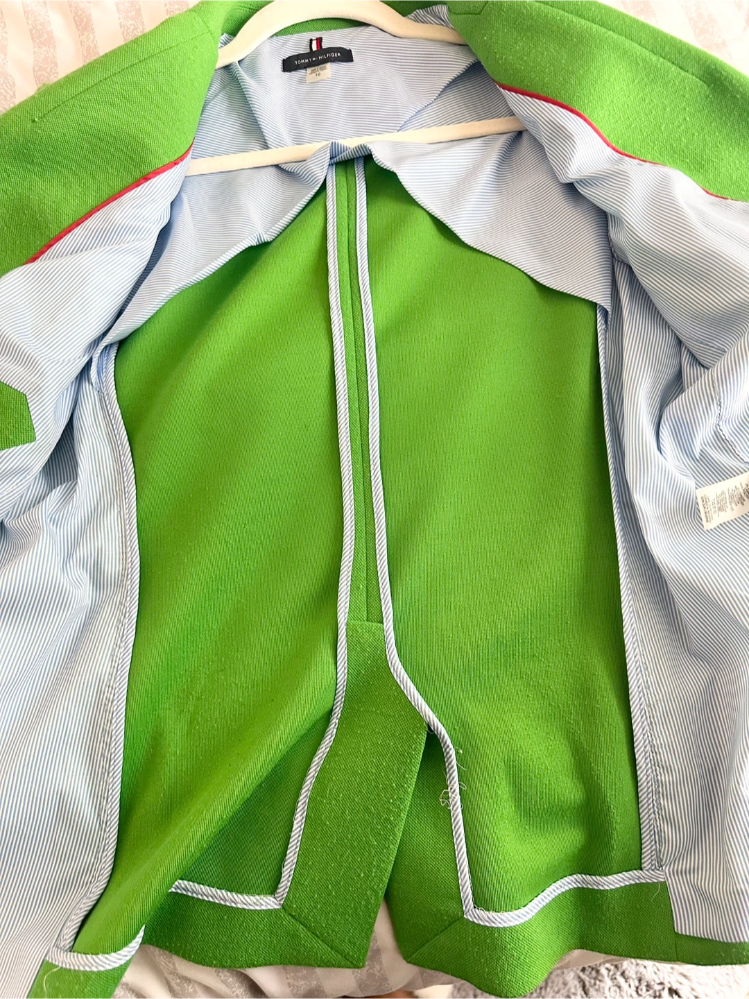 Selling a vibrant green dress suit from Tommy Hilfiger! This set includes a sleeveless dress with a zipper front and a matching blazer. Both pieces are in excellent condition and are a size 10. Perfect for adding a pop of colour to your wardrobe!
