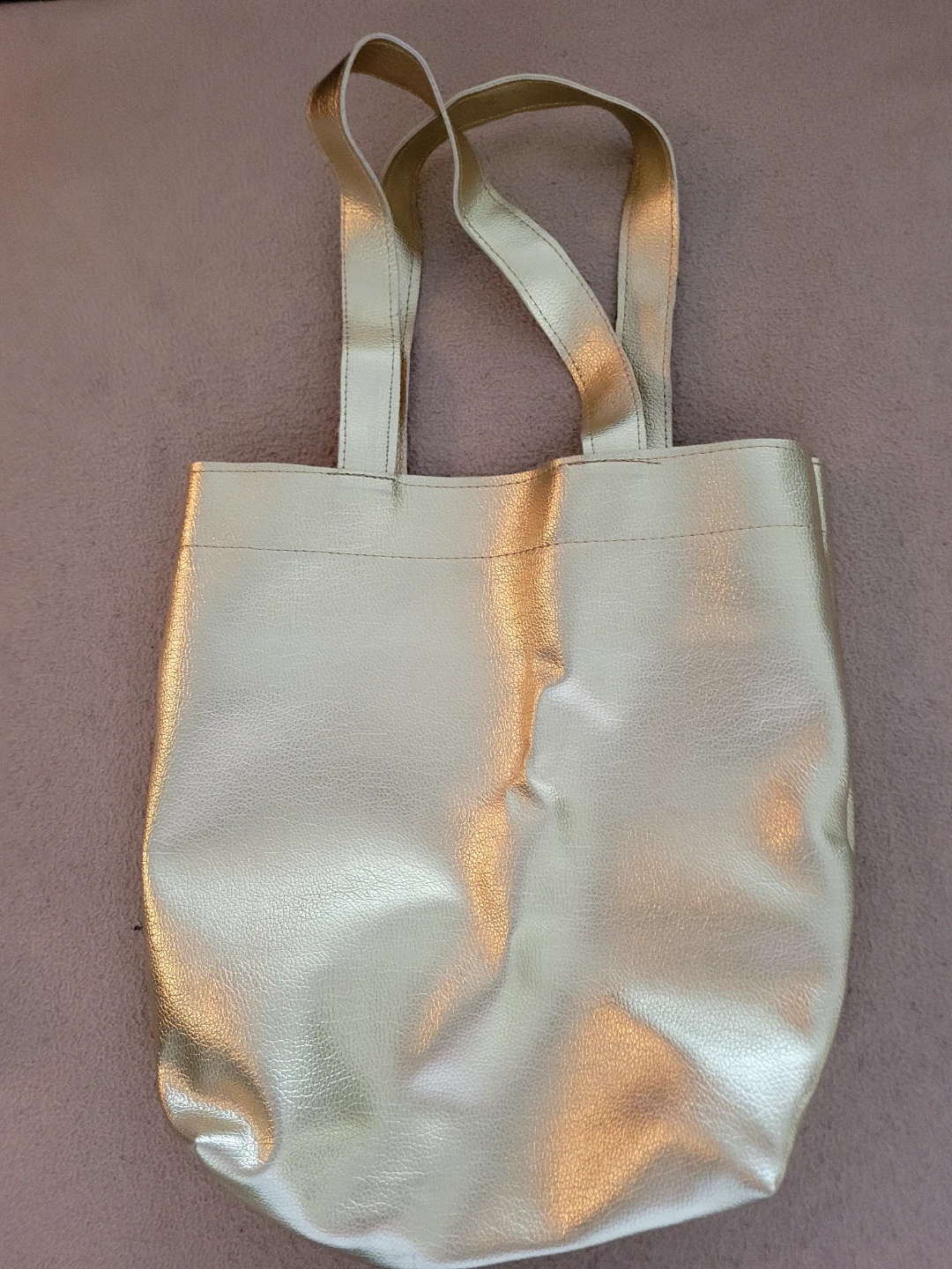 Selling a gold tote bag! This bag is in good condition and would be great for carrying your everyday essentials. The material has a nice sheen and the handles are sturdy.