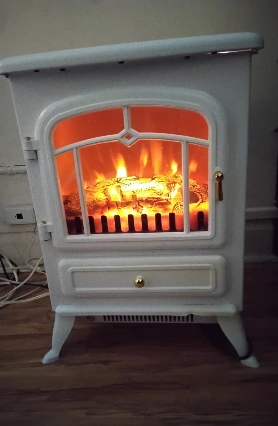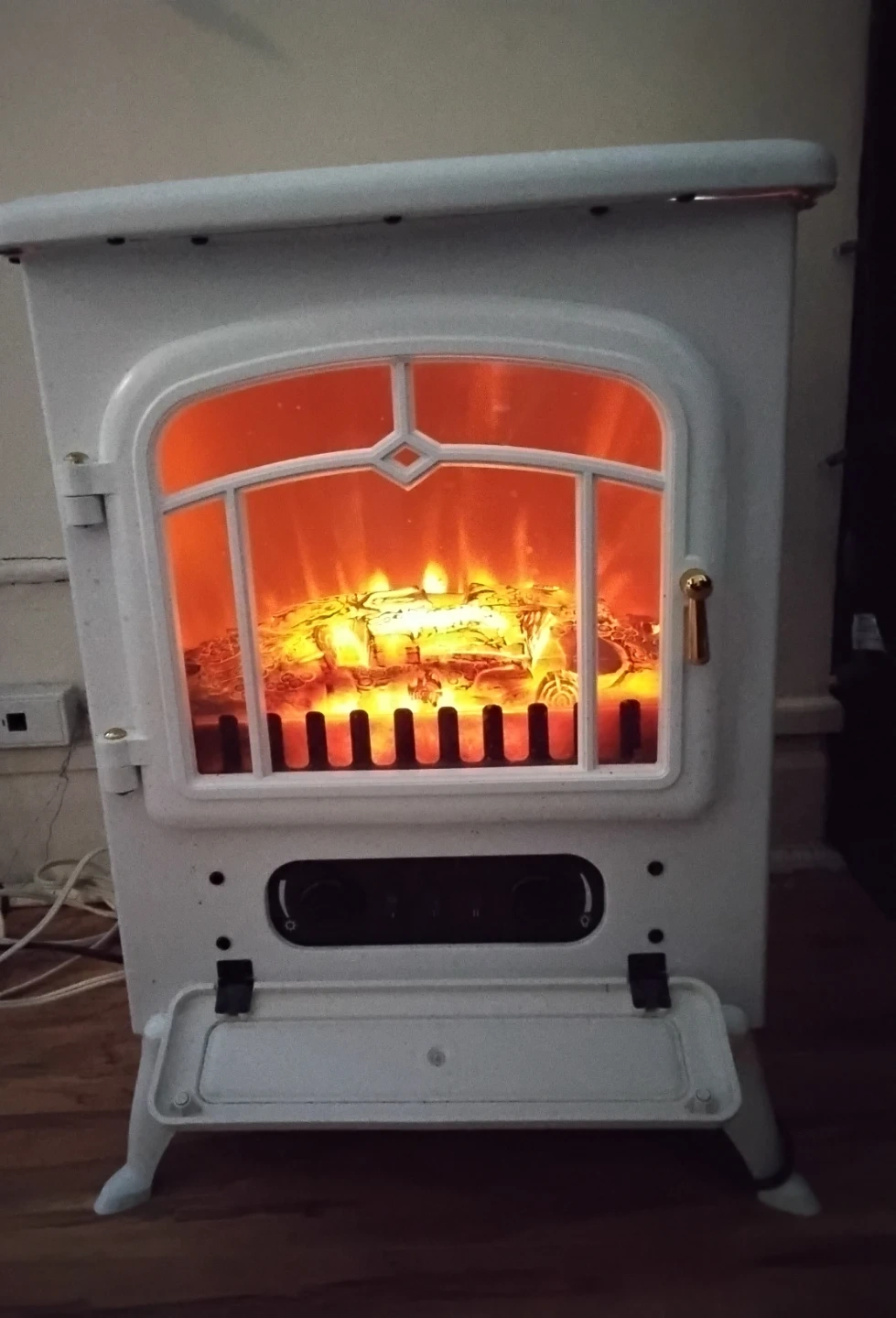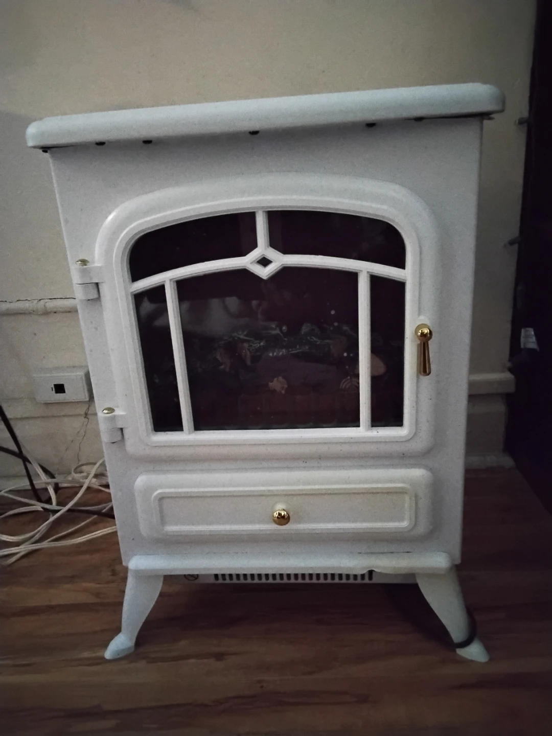 white electric fireplace heater in great condition and ready to keep you warm (: has a dial for dimming and increasing the light and another to relegate heat. Cute and cozy and provides a ton of warmth.
