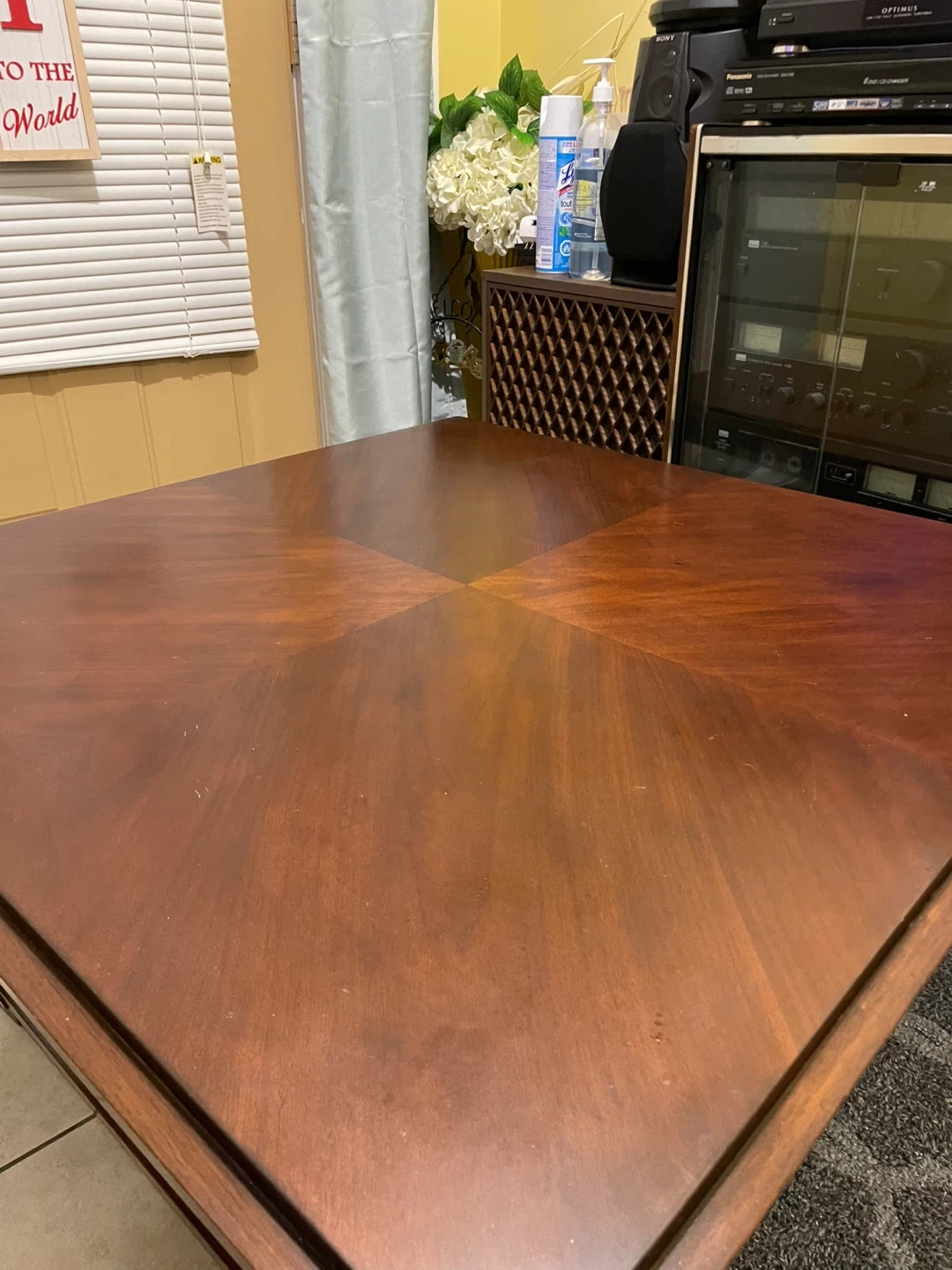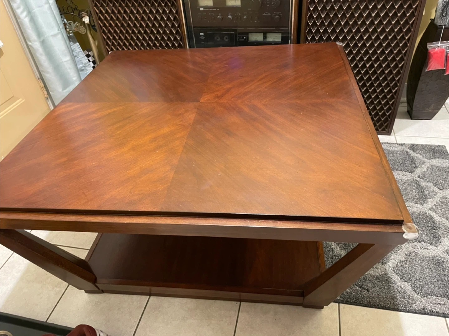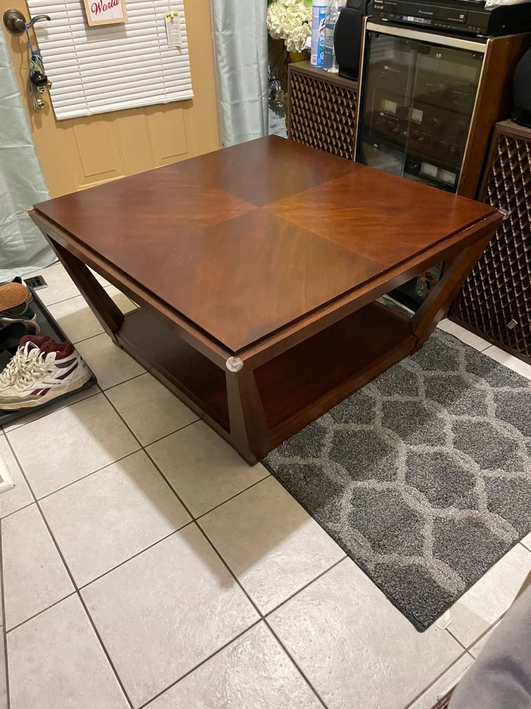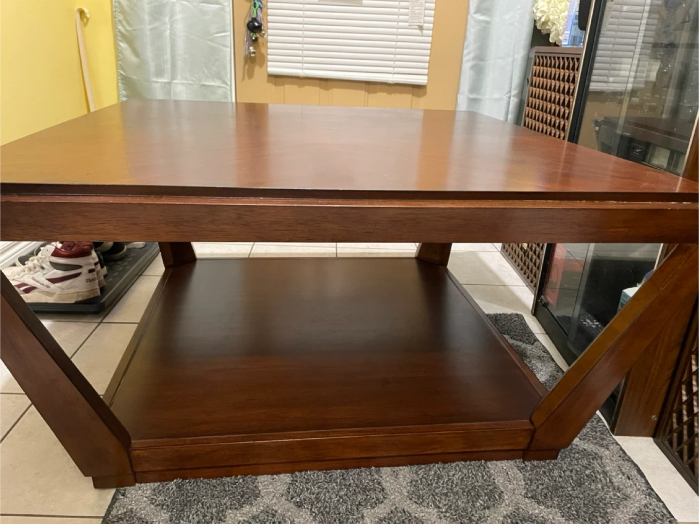 A lovely wooden coffee table with a square design! It has a shelf underneath for extra storage or decor. It's in great condition and ready for a new living room.