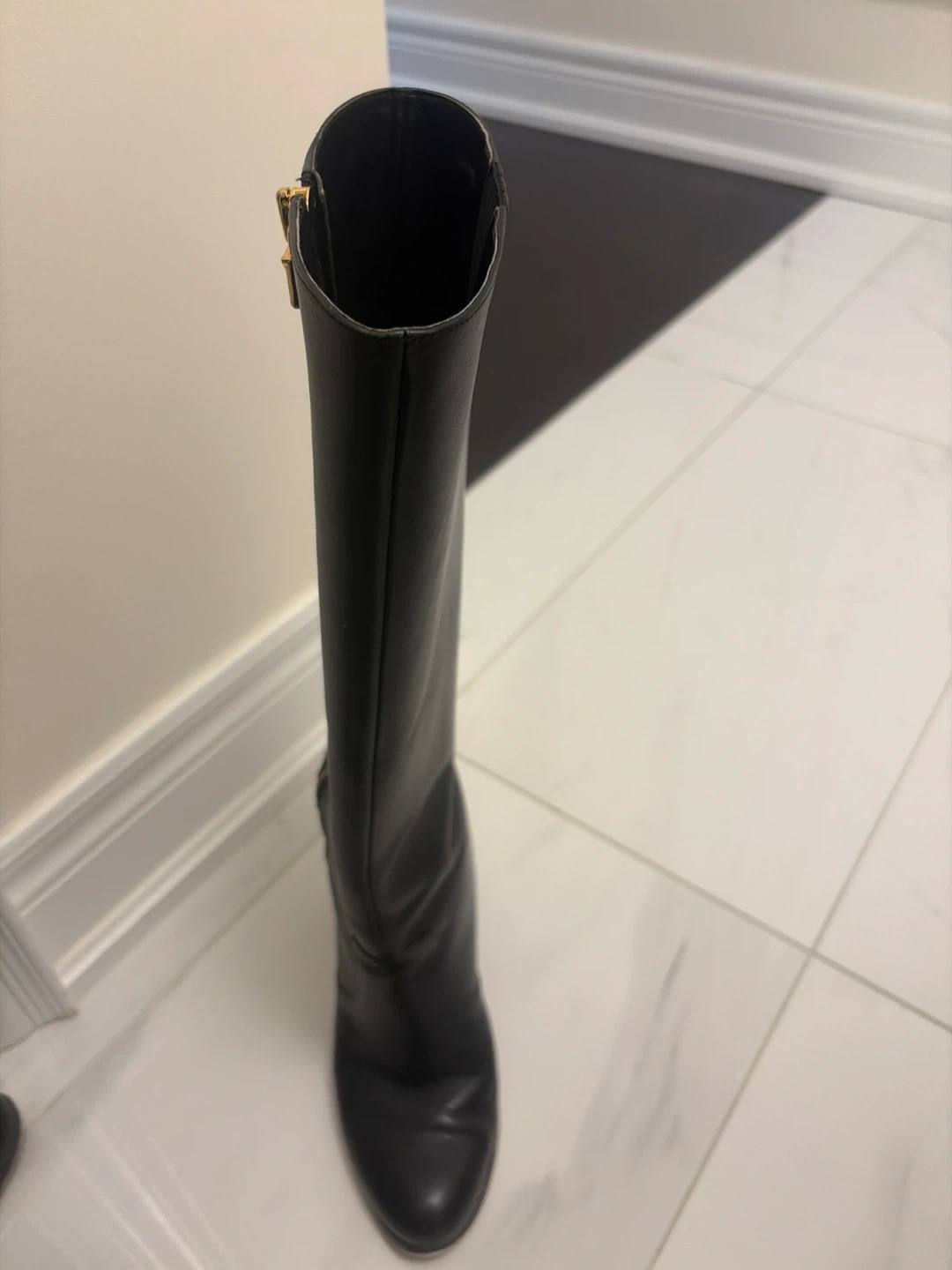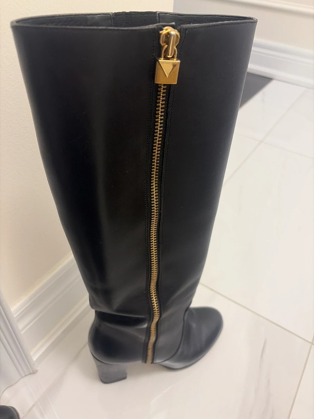 Here are some Michael Kors knee-high boots in black leather! They feature a gold zipper and the Michael Kors logo on the zipper pull. They are in good condition and ready for a new home!