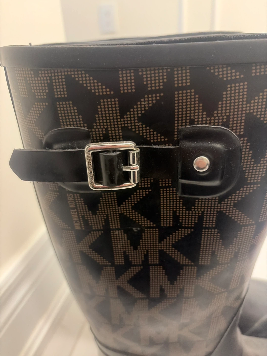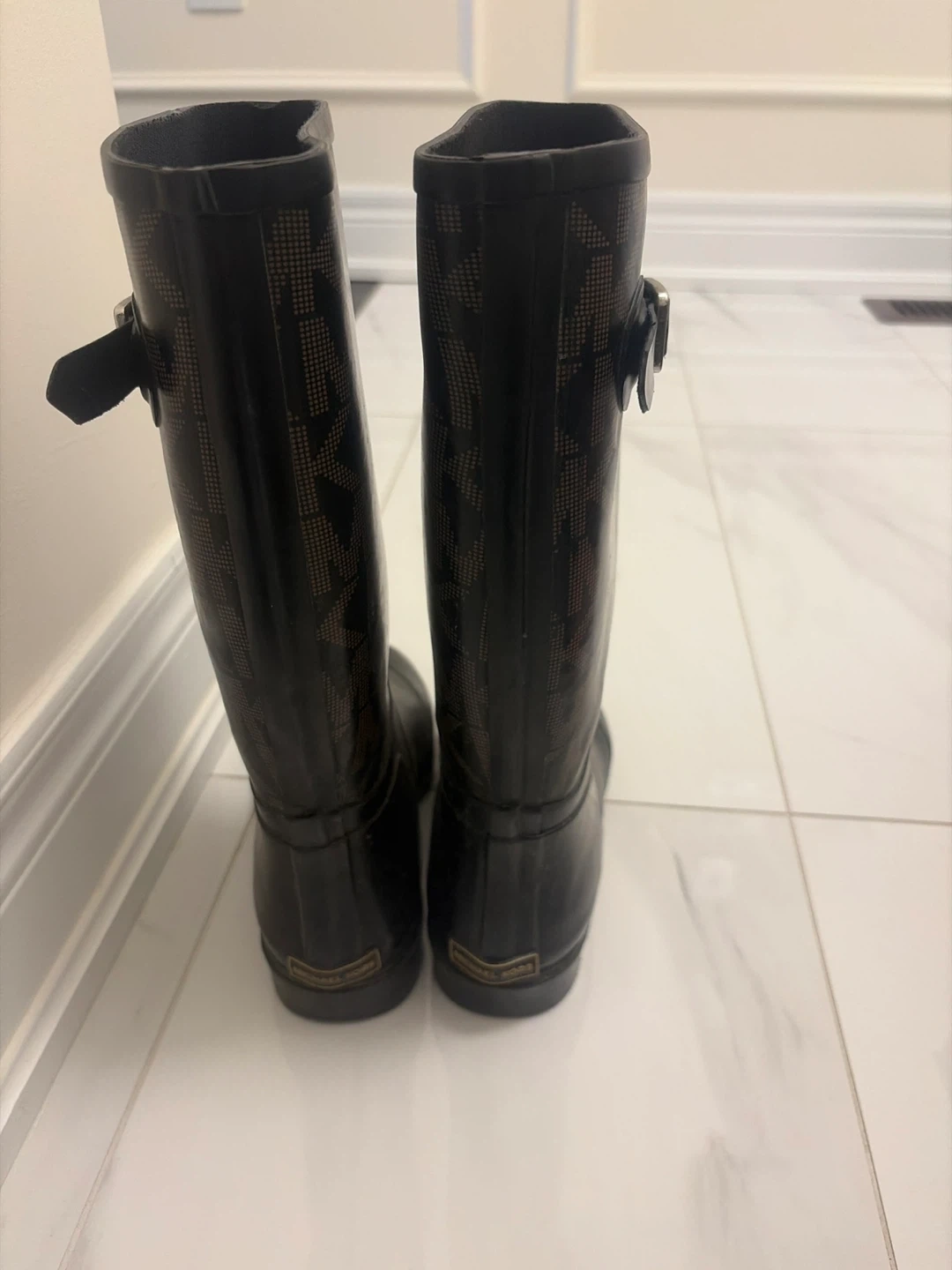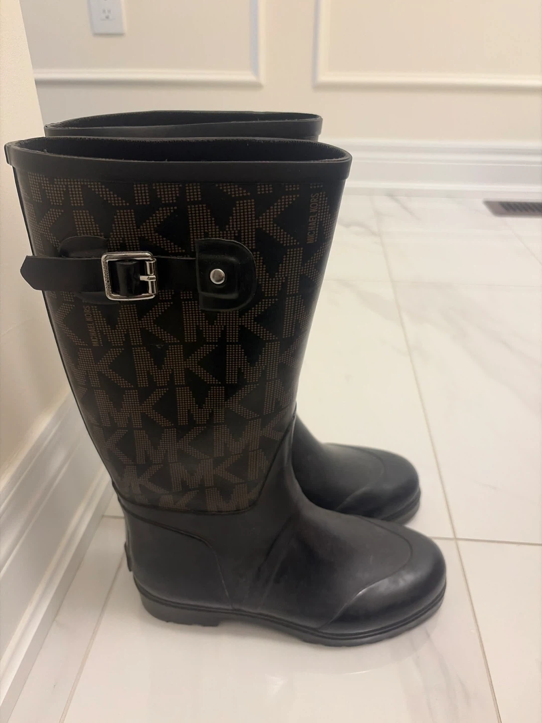 Selling a pair of Michael Kors rain boots. They're in great condition and perfect for those rainy days! They feature the iconic MK logo pattern.
