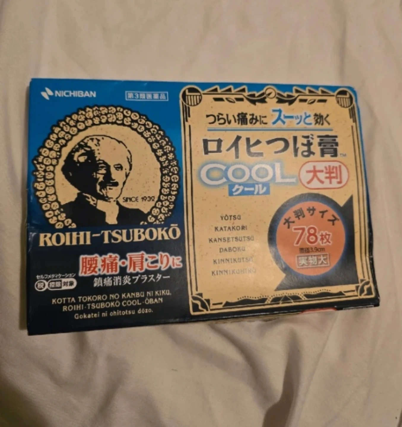 Selling a New box of Roihi Tsuboko Cool pain relief patches. It contains 78 patches. Expiry date is 2028 January