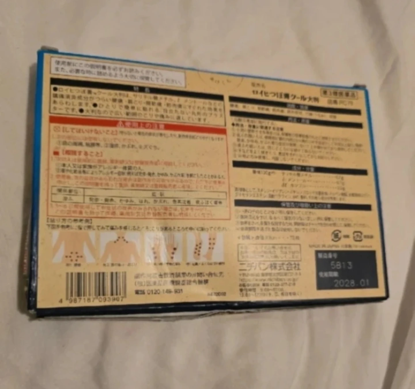 This is a box of Nichiban Roihi-Tsuboko Cool large-sized pain relief patches.
