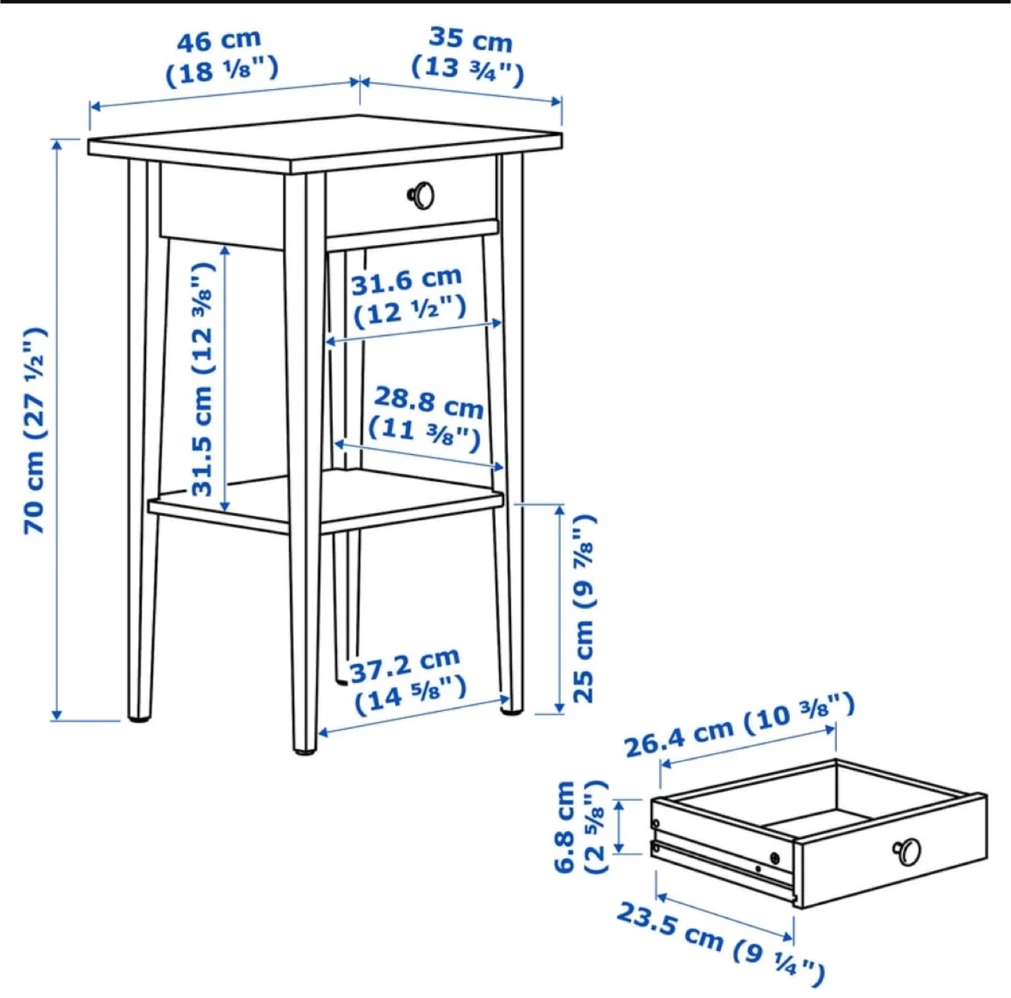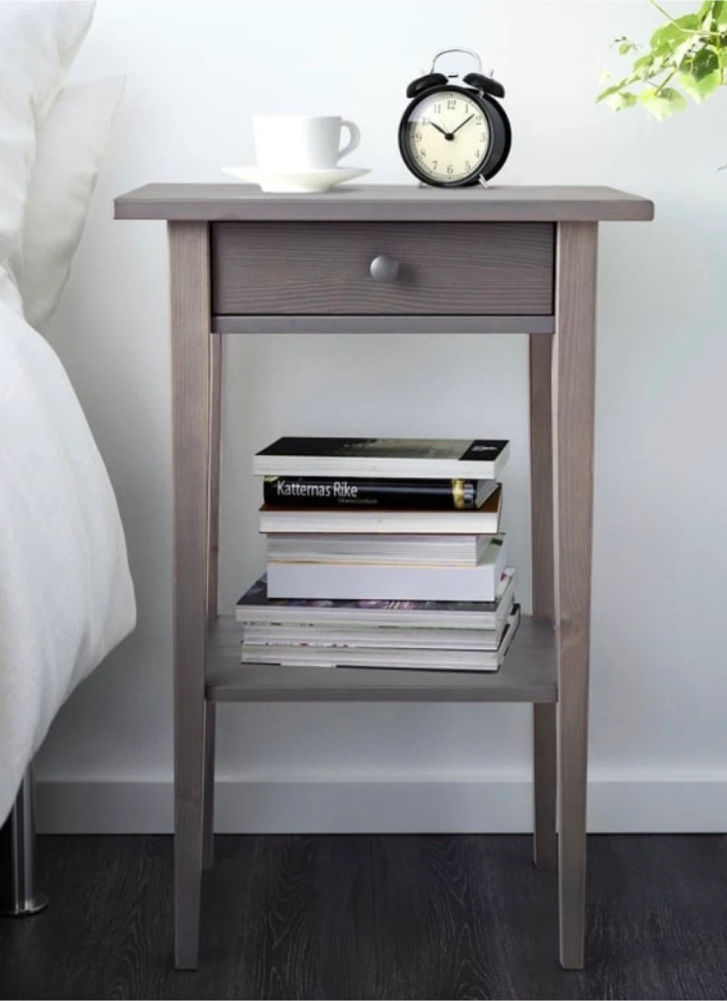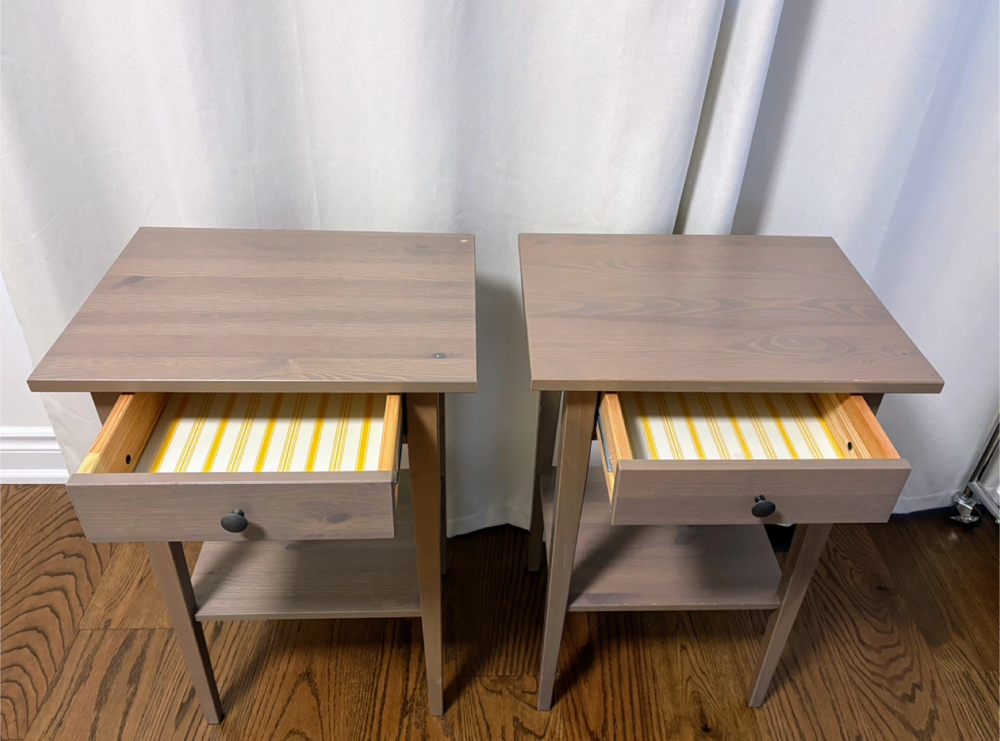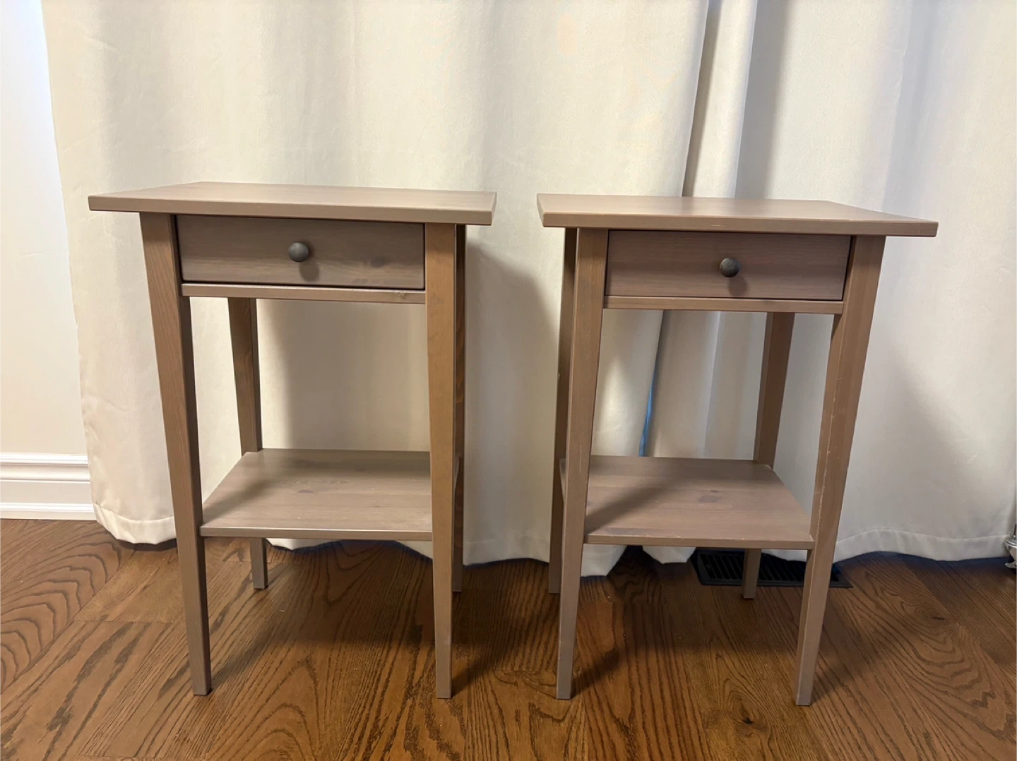 Set of two IKEA Hemnes nightstands in Dark Grey stain colour. Some minor paint chips as seen in pics, reflected in the asking price. Measurements are in the pics.