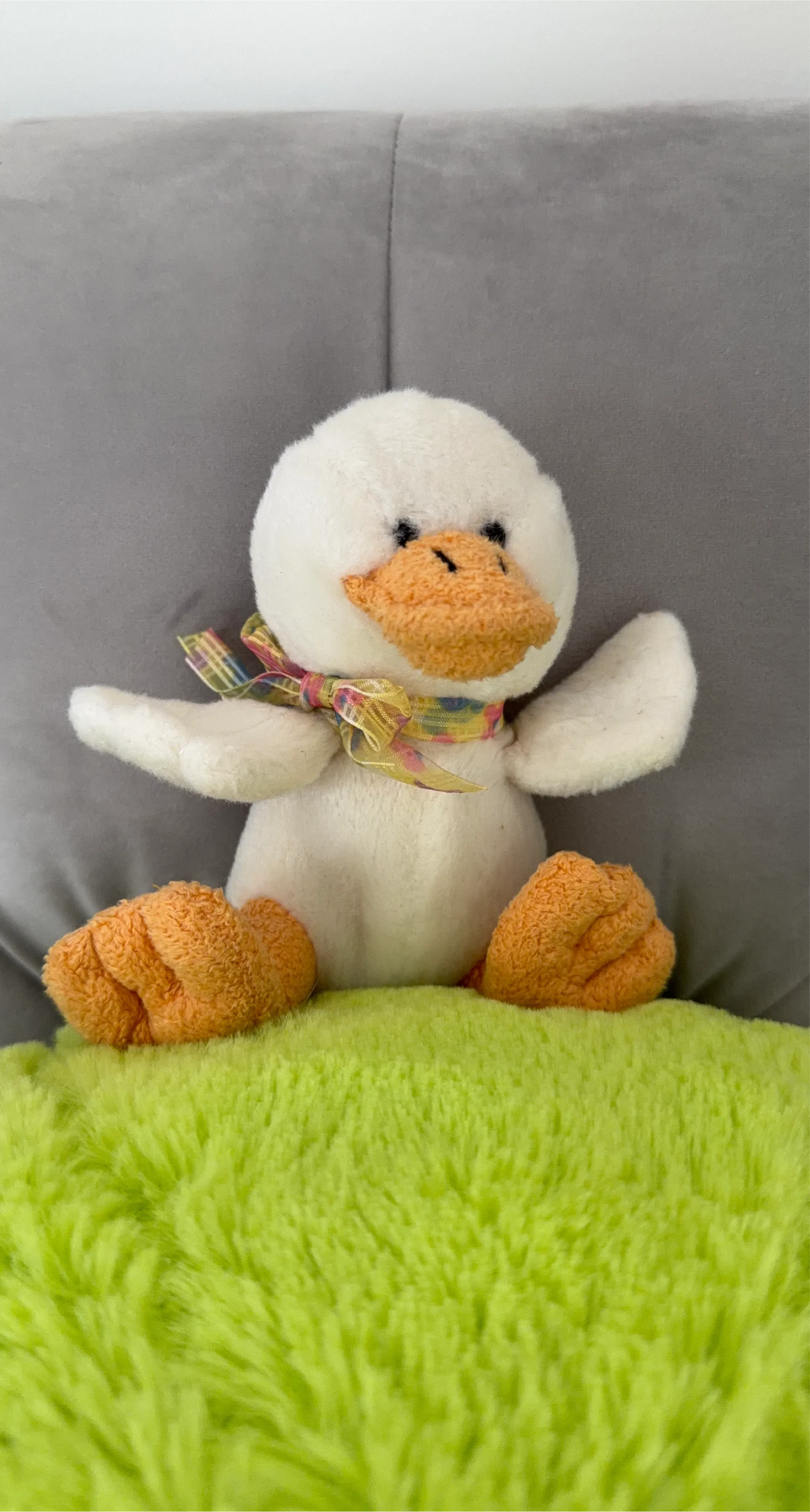 Here's a cute duck plush toy! It's white with orange feet and beak, and it has a colourful ribbon tied around its neck. It would make a great addition to any plush collection. 5”x4”