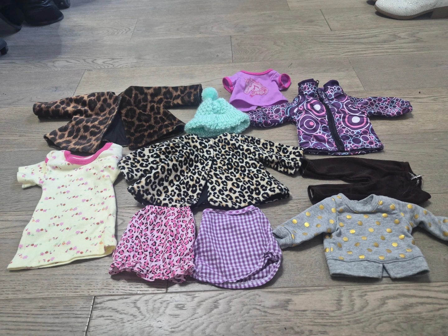 Selling a bundle of doll clothes! There's a variety of styles and patterns, including leopard print, floral, and checkered designs. Perfect for dressing up your favourite doll!