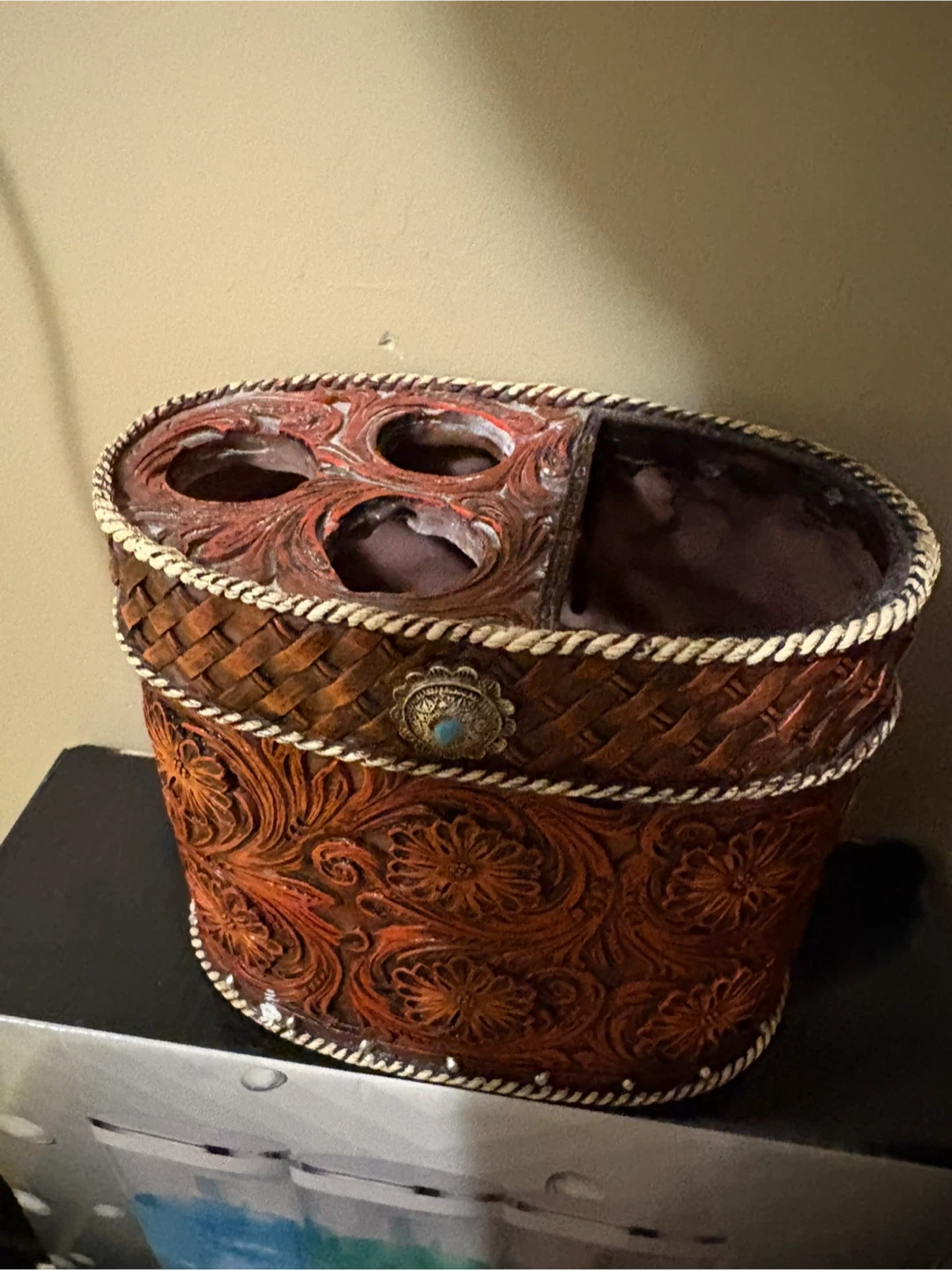 This is a rustic-style bathroom organizer with a woven texture and decorative floral pattern. It has compartments for toothbrushes and other bathroom essentials. It's in great condition and would add a touch of country charm to any bathroom