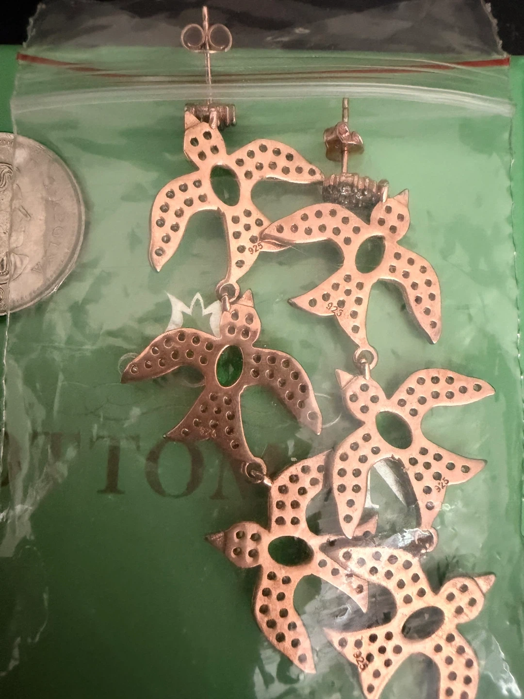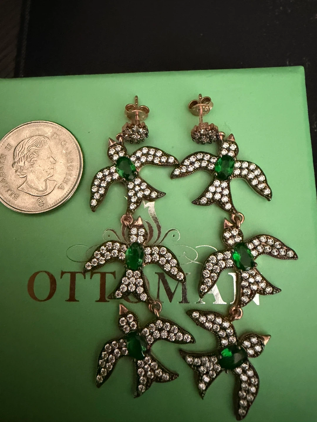 These are a pair of beautiful Ottoman Hands dangle earrings! They feature a bird design with green and clear stones. They are made of 925 silver.
