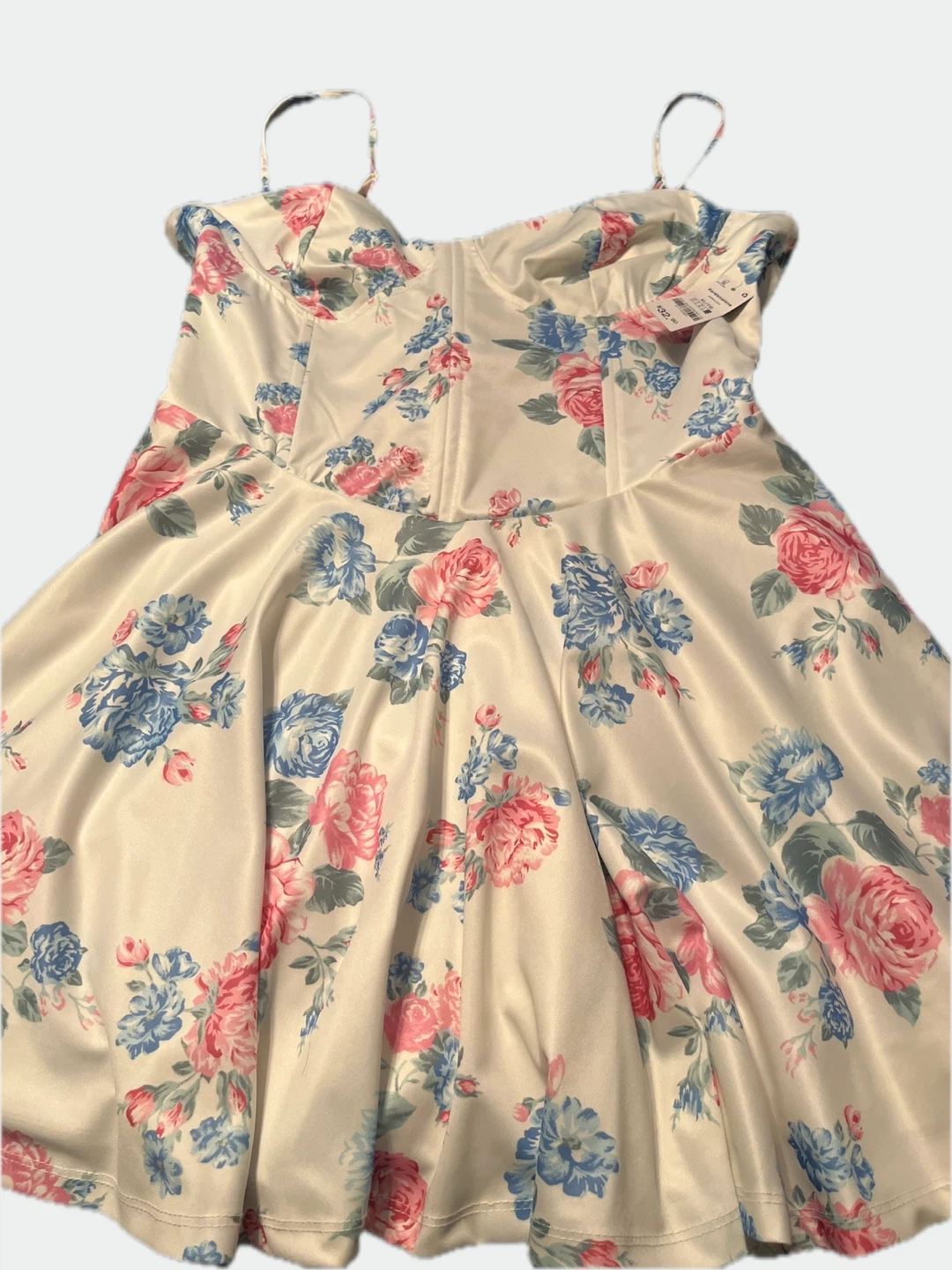 This is a beautiful dress with a floral pattern. It's in new condition and ready for a new owner! The dress features a corset-style top and a full skirt. Perfect for a special occasion or a night out