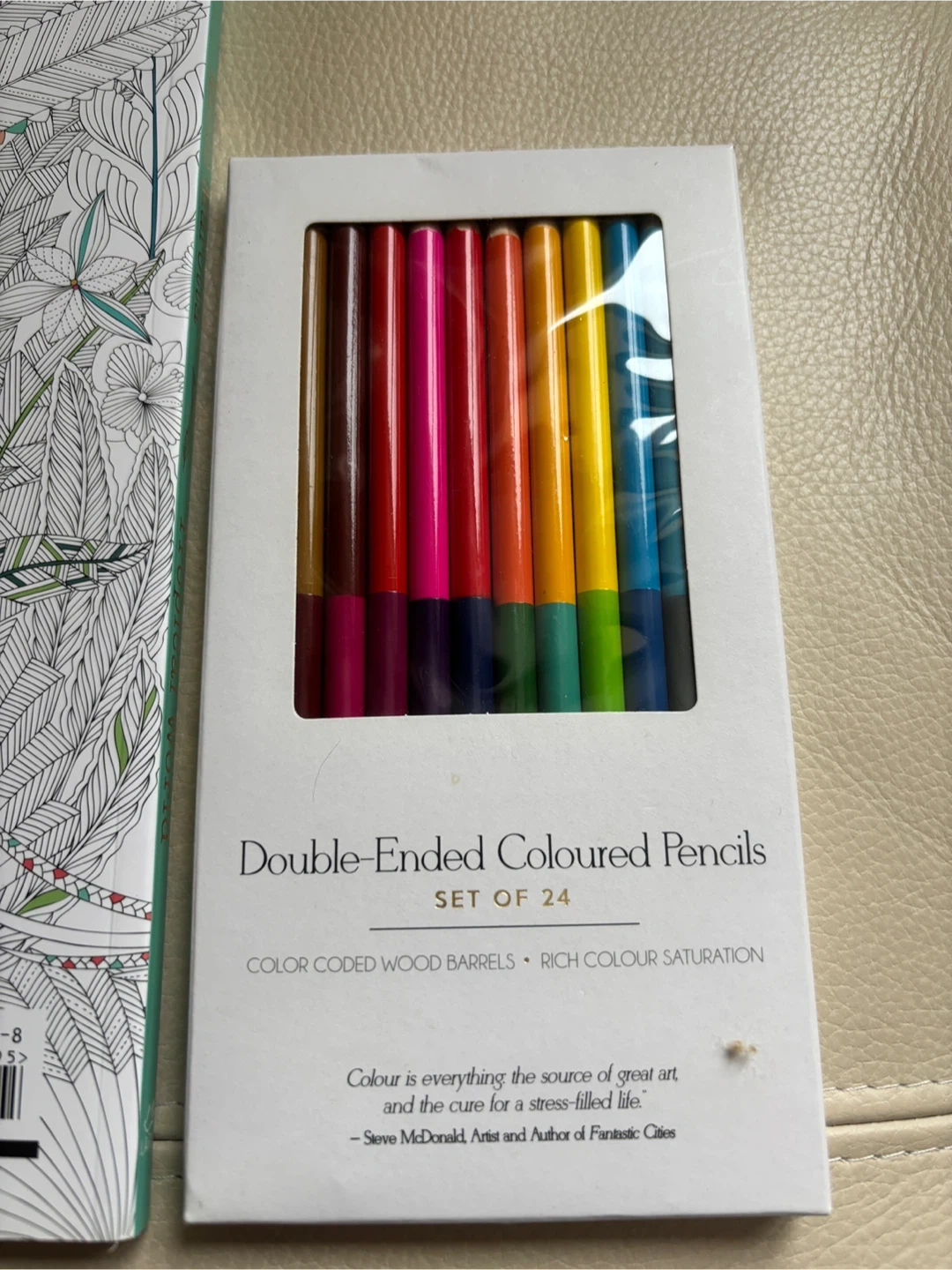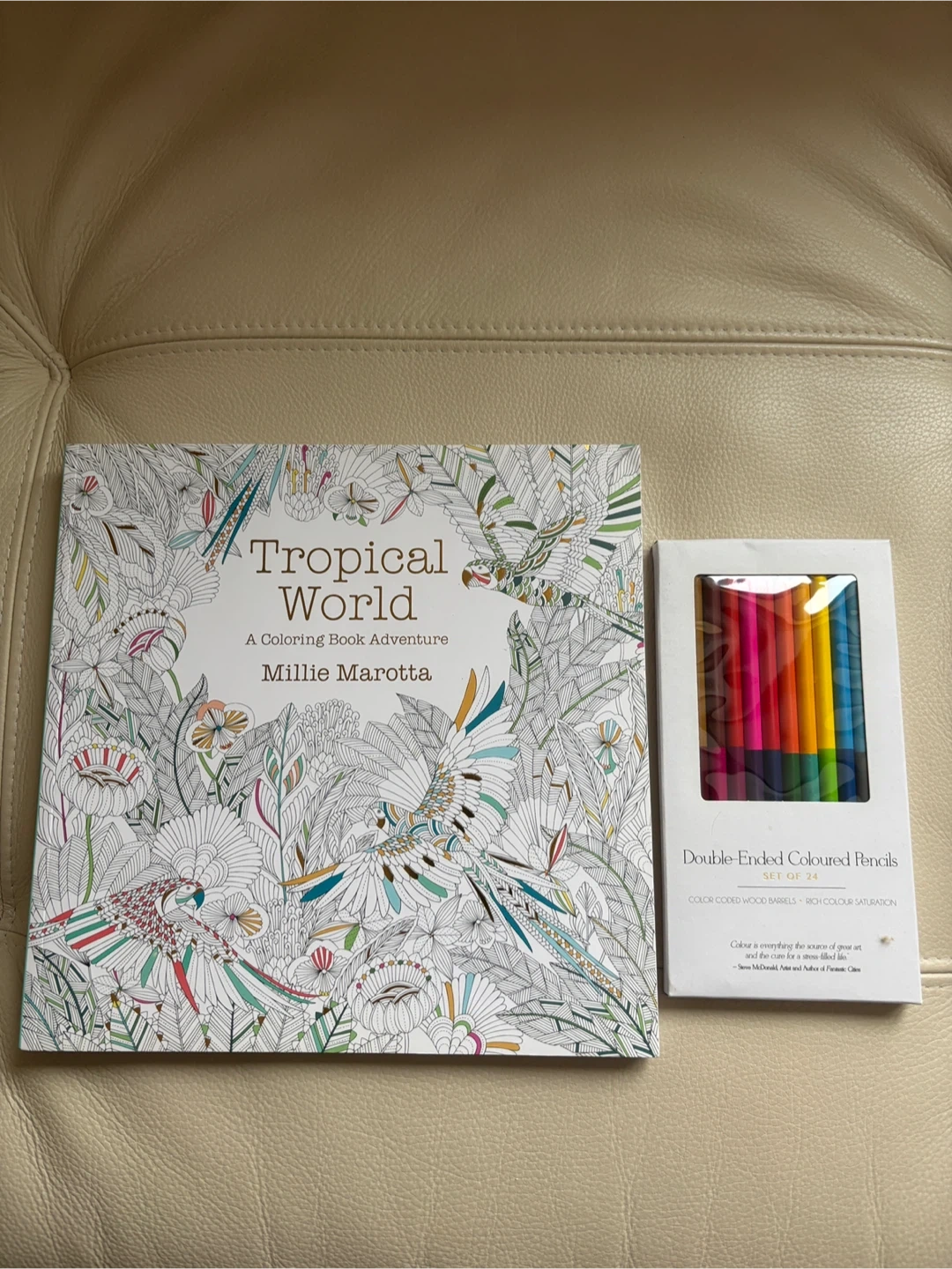 Selling a Colouring book by Millie Marietta entitled Tropical World. Includes a book of 24 double ended colouring pencils. The book and pencils are brand new.