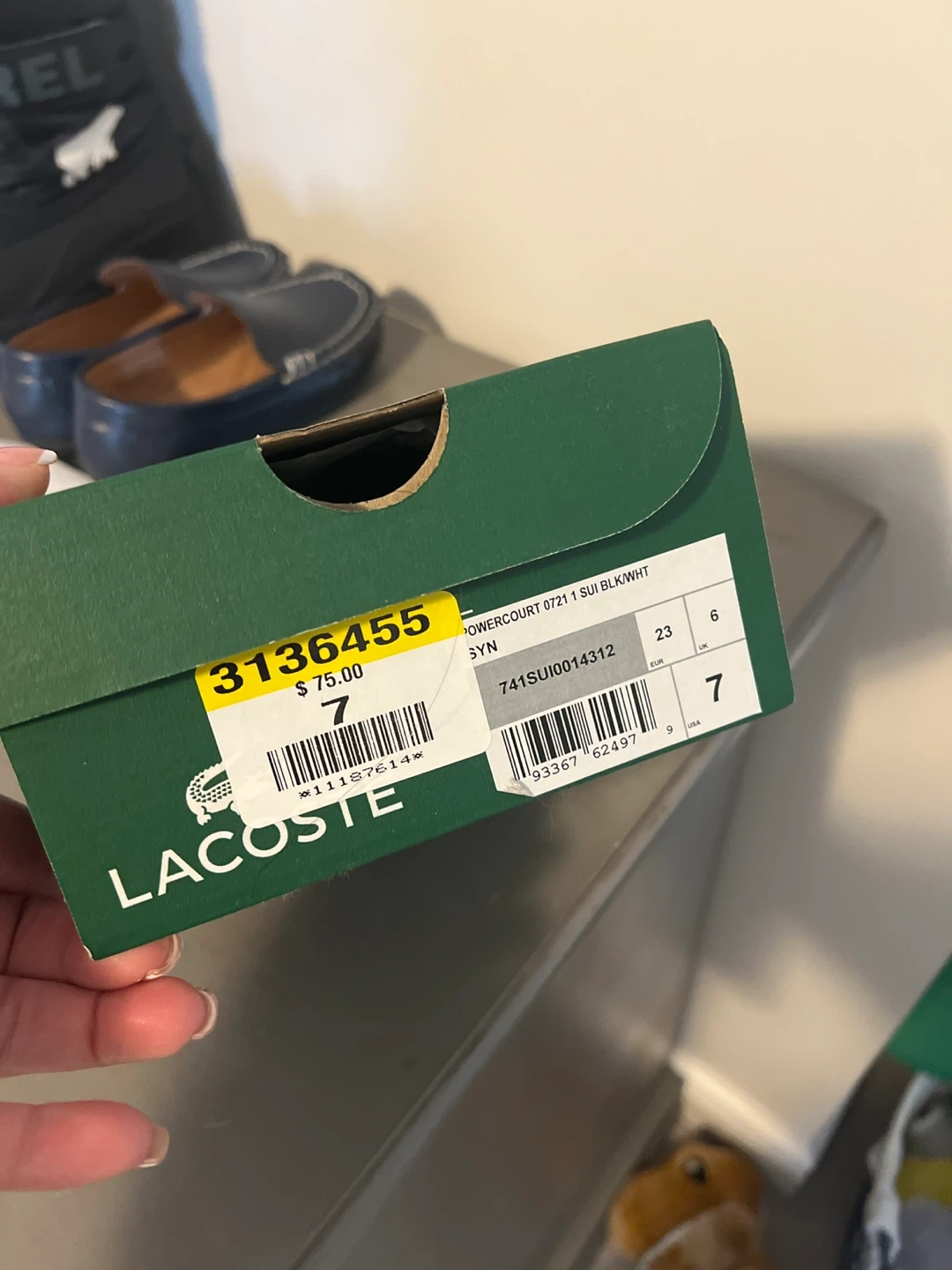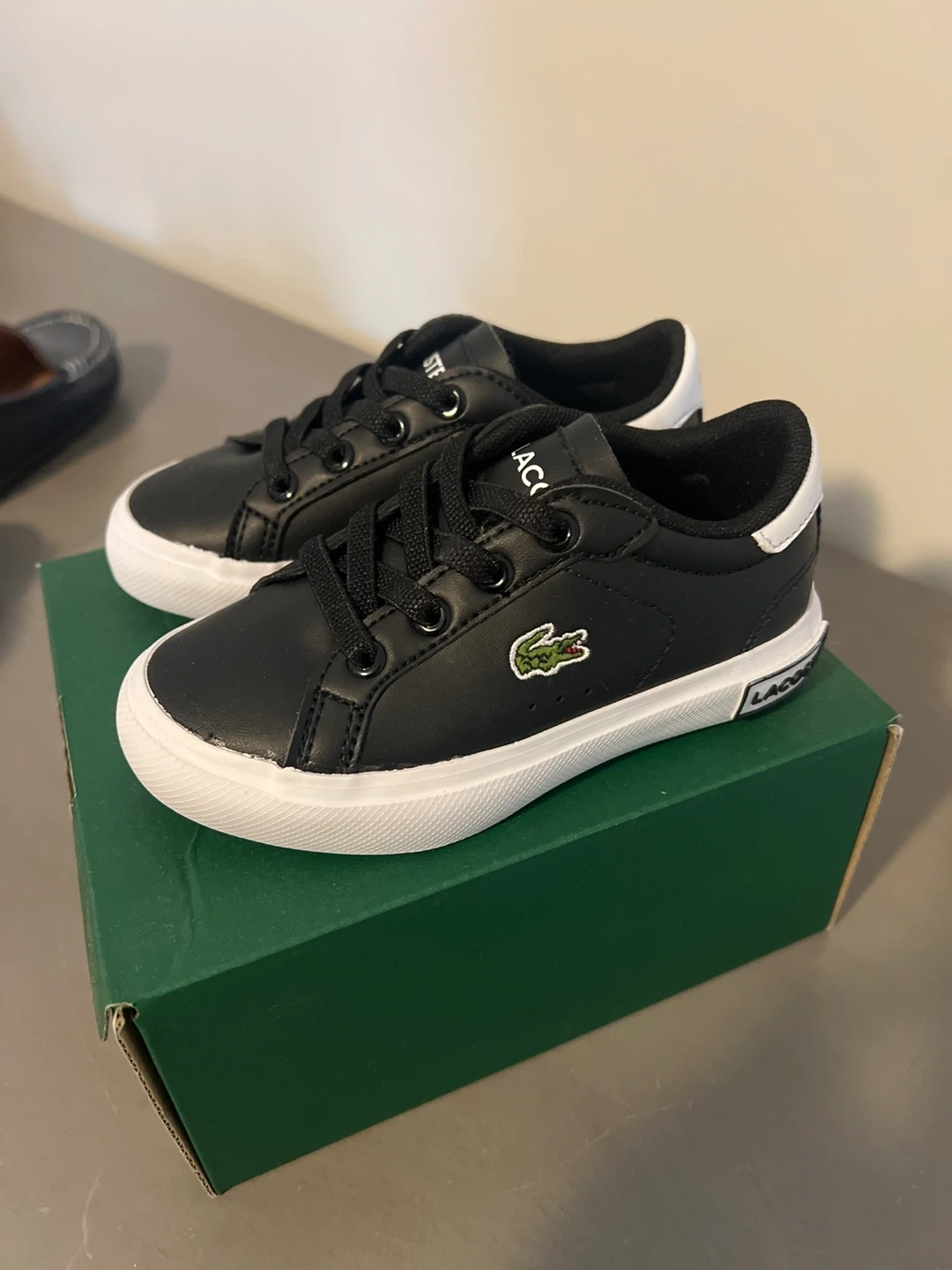 Selling a pair of Lacoste Powercourt shoes in black and white! They're a size 7 and come with the original box. These stylish sneakers are perfect for everyday wear and have that classic Lacoste look! Brand new, never worn.