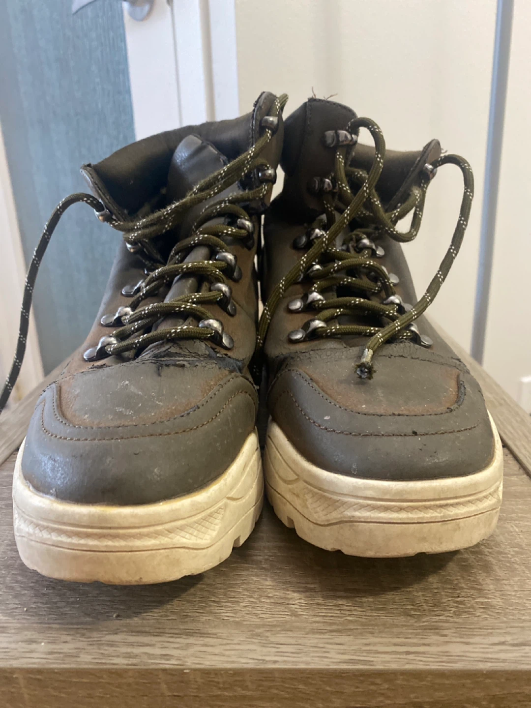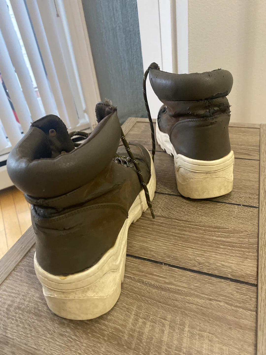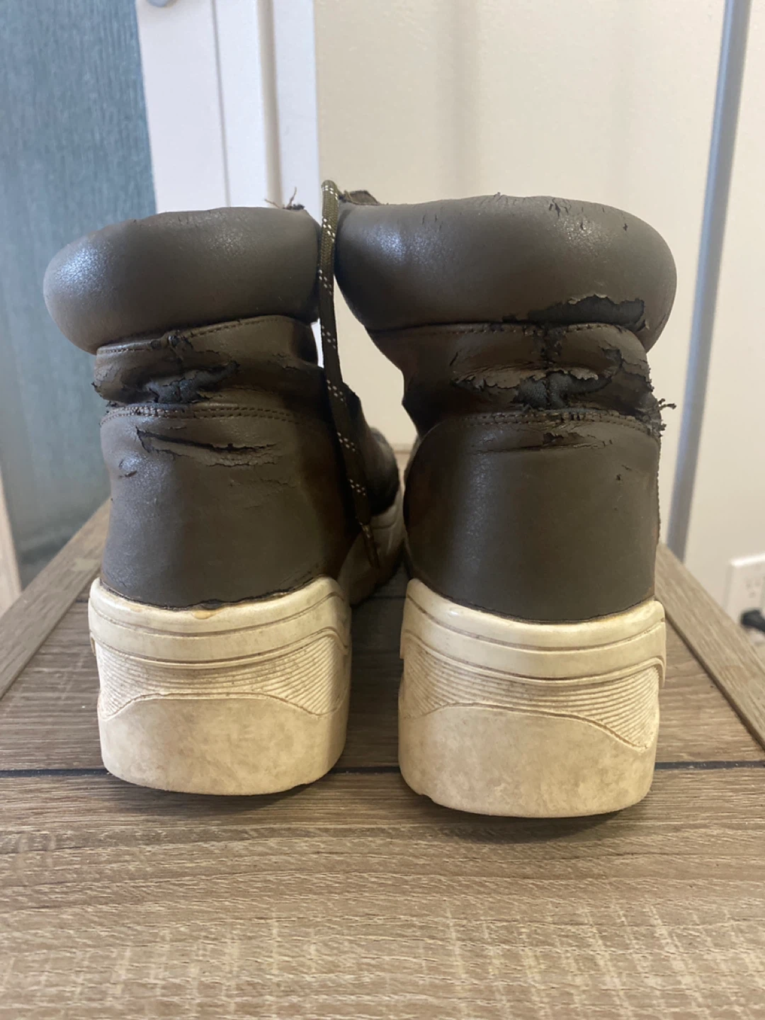 These are a pair of brown leather boots. They show signs of wear, but they're still functional and have a unique look. Please see photos for details on the condition.