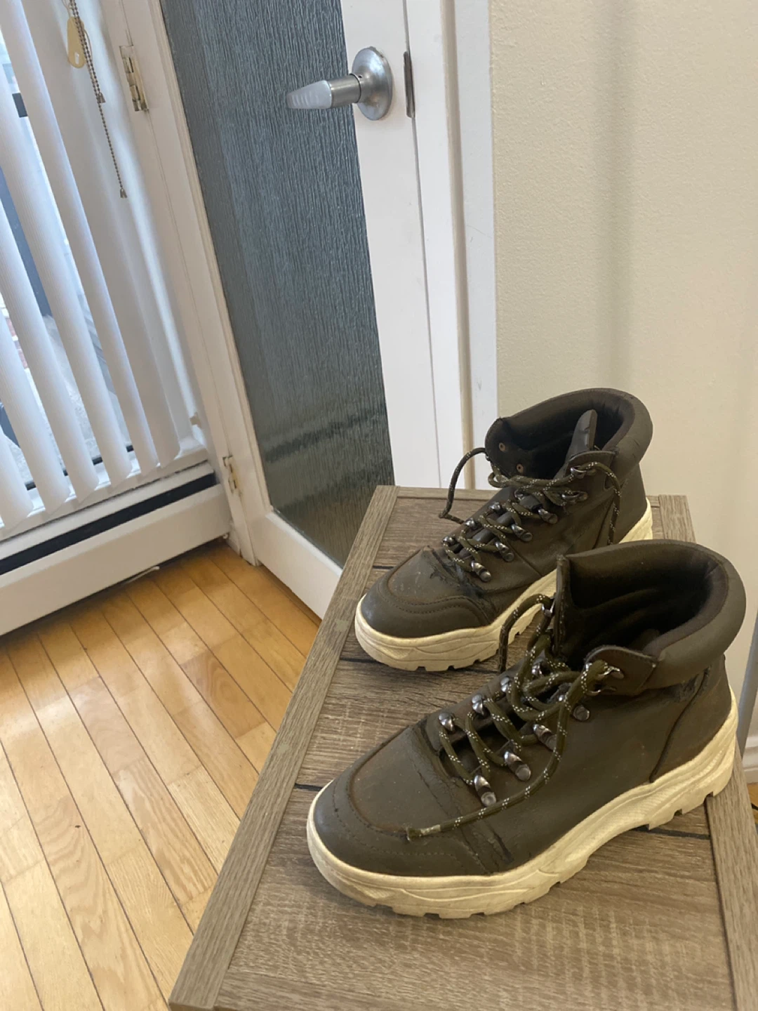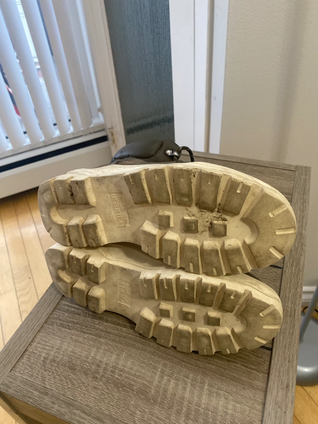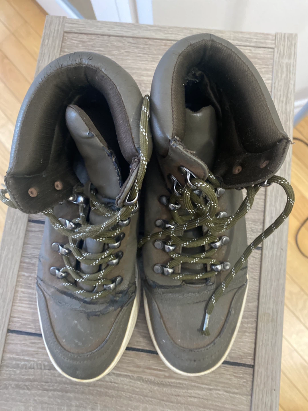 These are a pair of brown leather boots. They show signs of wear, but they're still functional and have a unique look. Please see photos for details on the condition.
