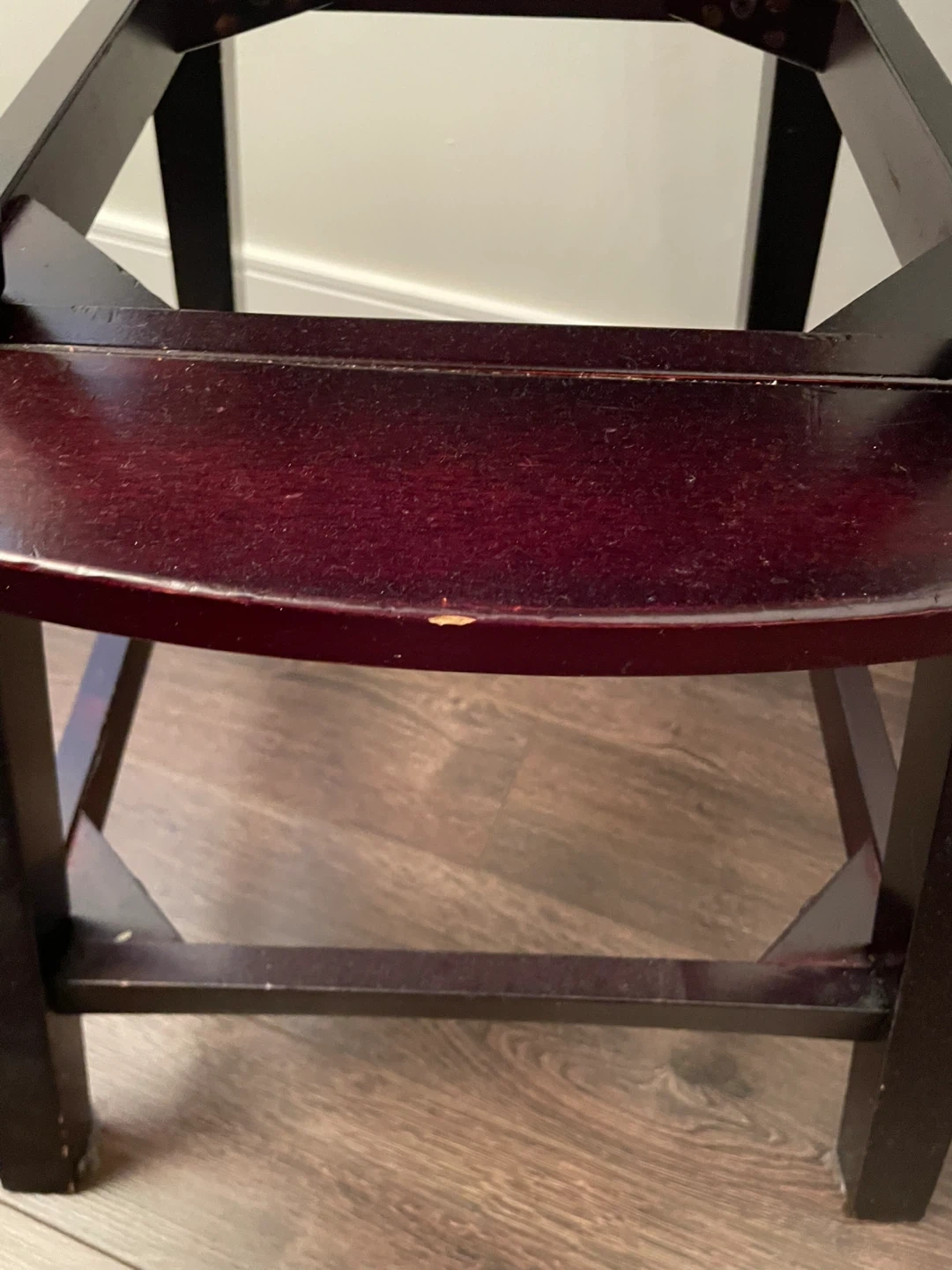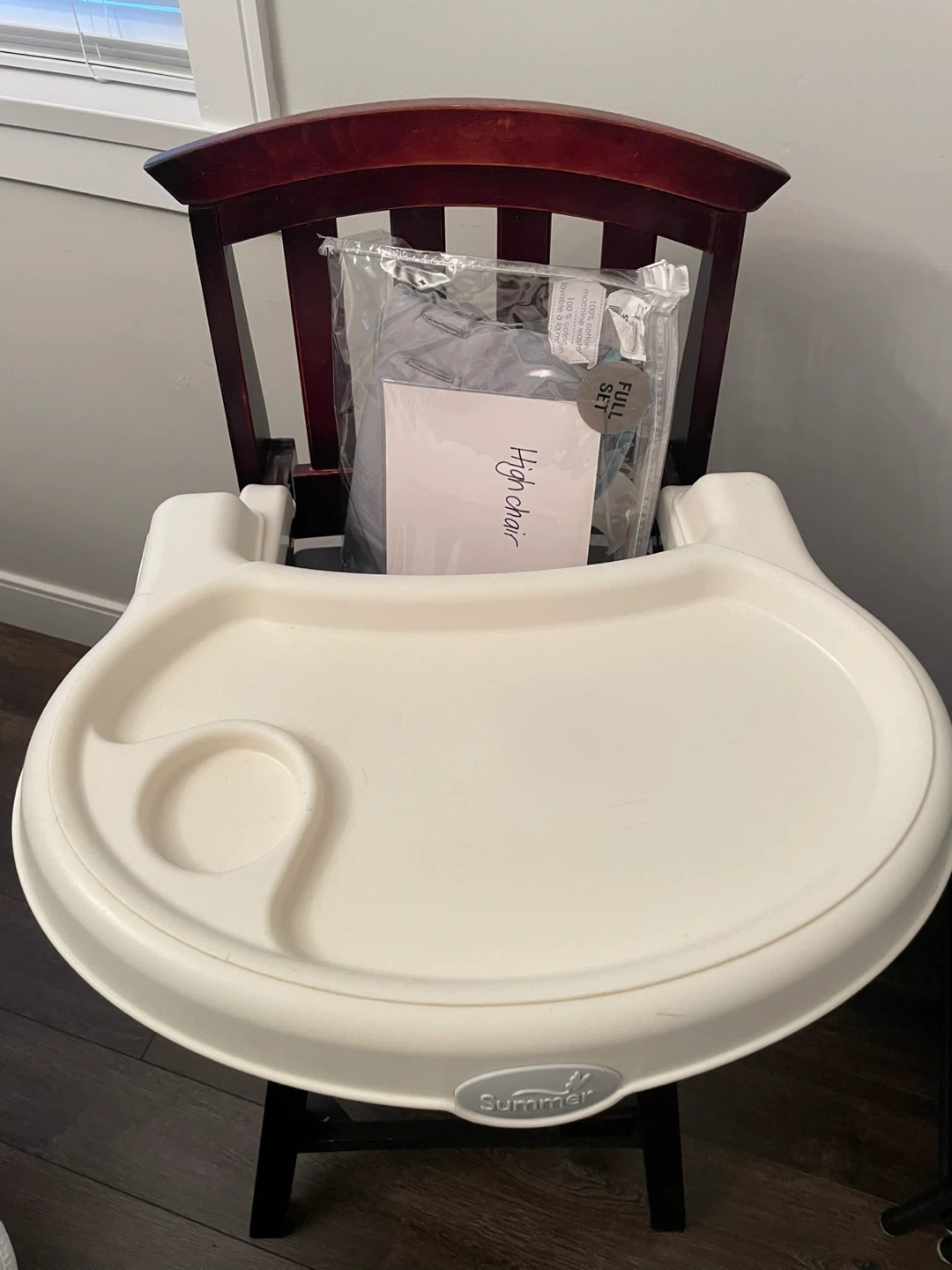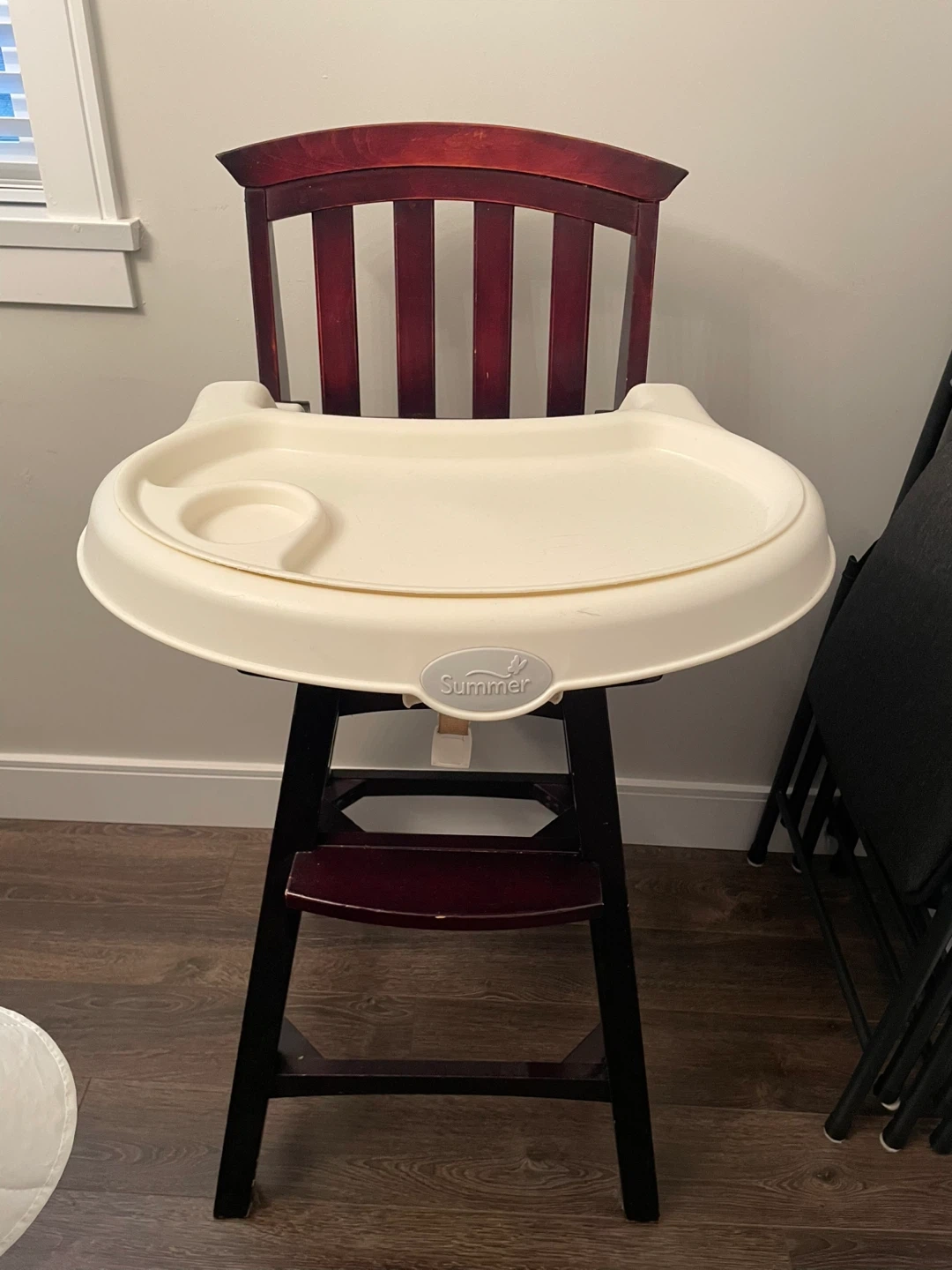 Summer Infant high chair with a dark wood finish. There are some visible scratches on the wood, but the chair is still sturdy and functional. It comes with a full seat set. Tray is removable for easy cleaning. Chair also reclines. Smoke free and pet free home.