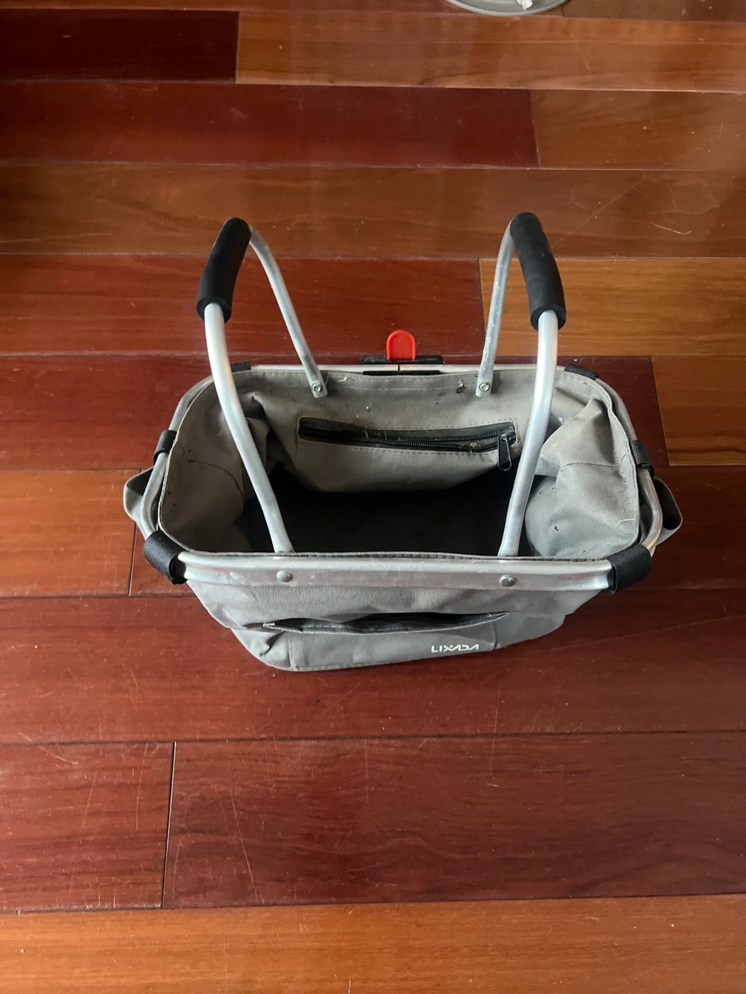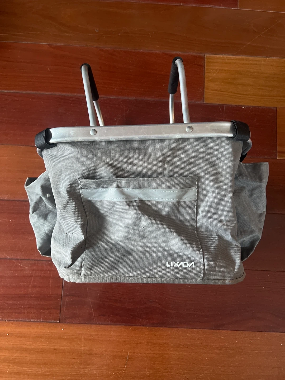 Lixada foldable bike basket in grey. It's perfect for carrying your groceries or other items while cycling. The basket is in good condition. Two drink pockets on the side.