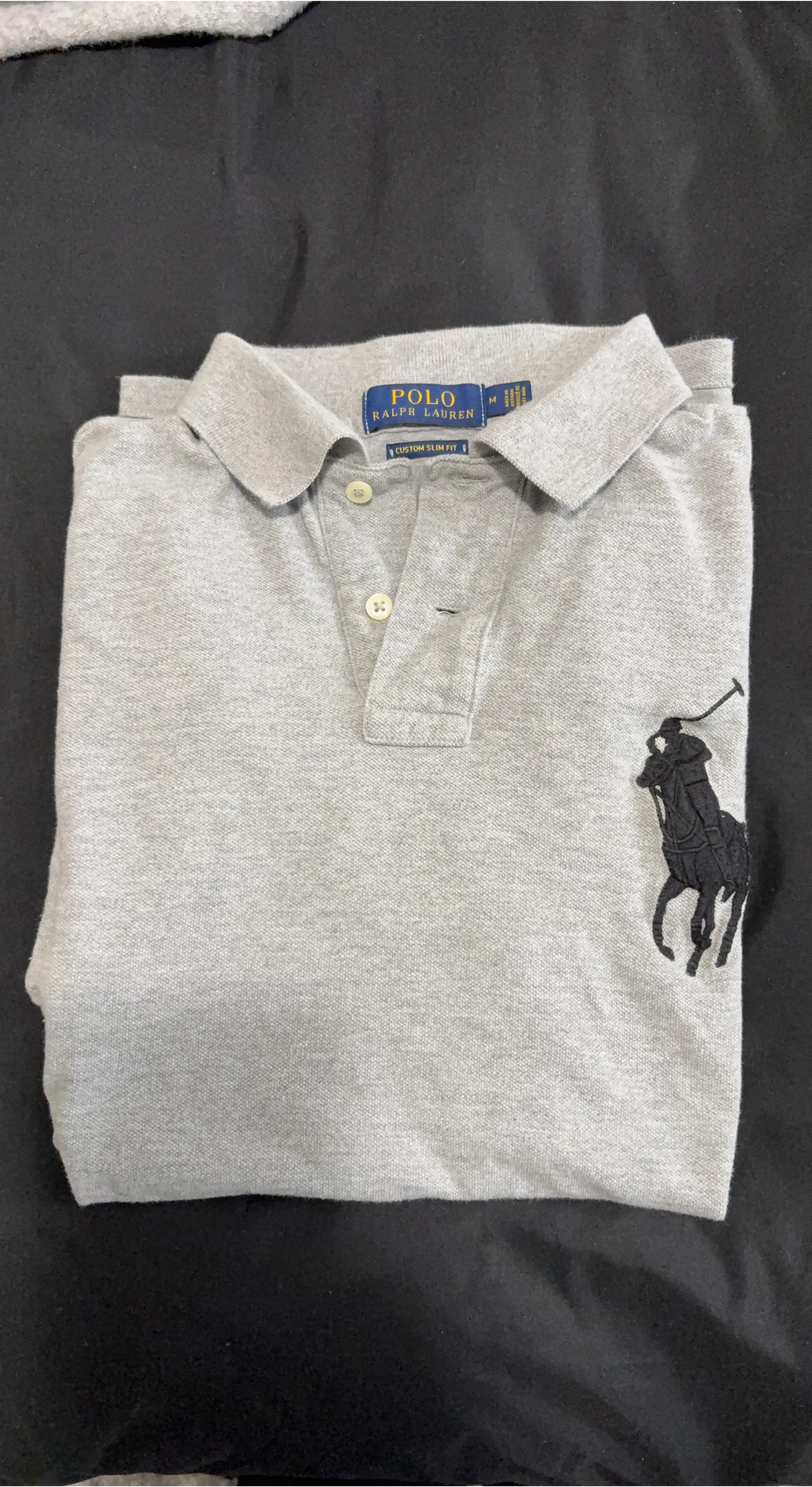 Selling a Polo Ralph Lauren polo shirt in size medium. It's a custom slim fit and in a light grey colour. The iconic Polo logo is embroidered on the chest. In great condition!