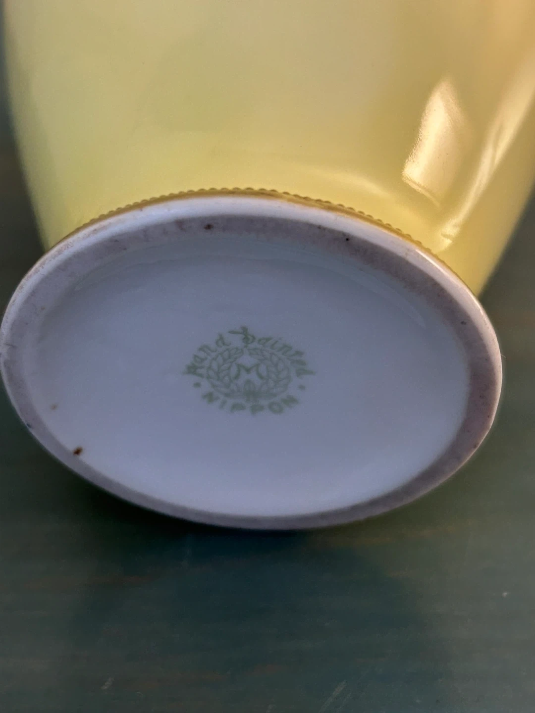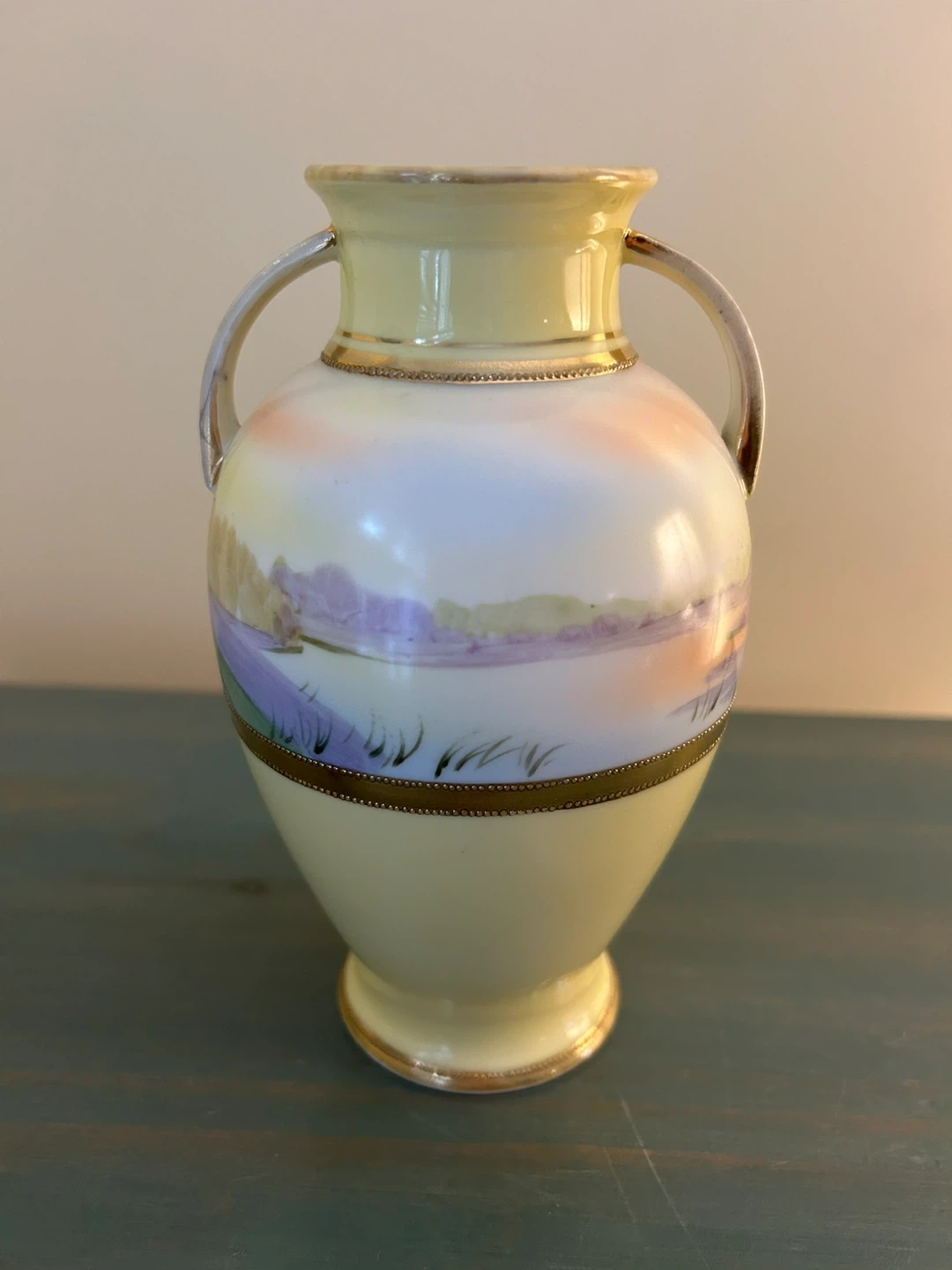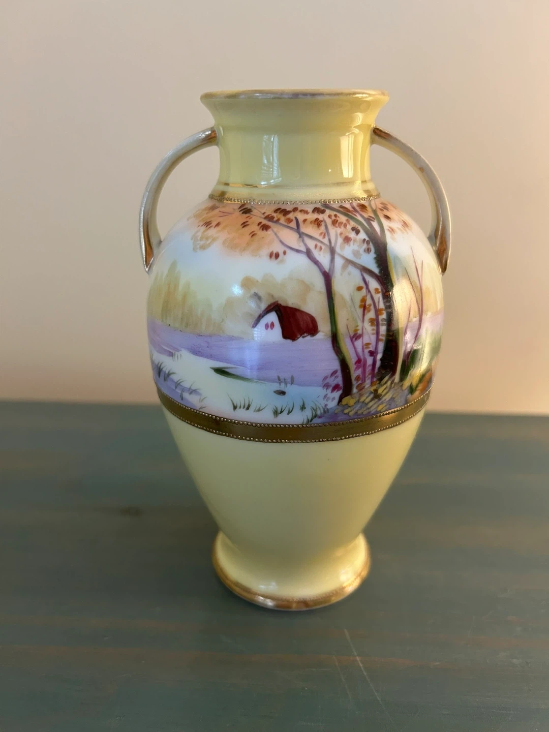 Vintage Hand painted Nippon/Noritake Porcelain Vase , pretty landscape scene with houses and trees. 61/2 “ high x 2” (top) x 21/2 “ (bottom) excellent condition.