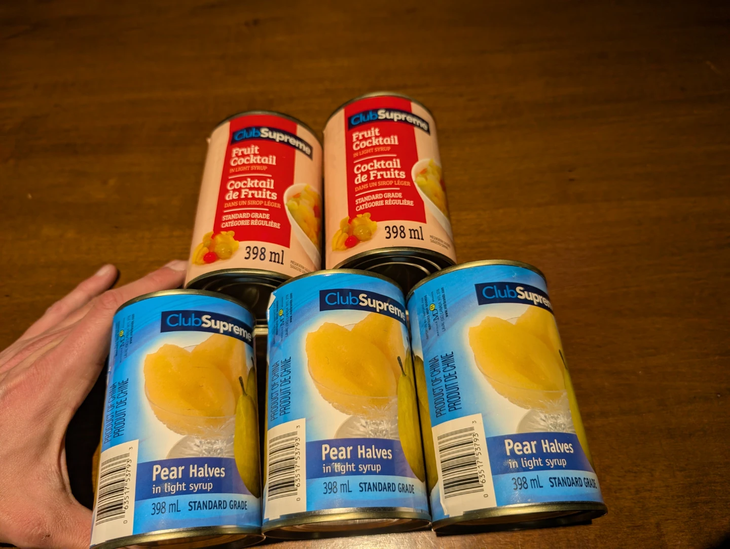 Mix of Club Supreme canned fruits! There are two cans of Fruit Cocktail in light syrup and three cans of Pear Halves in light syrup. Each can is 398 mL. Expiry date of May 10, 2026