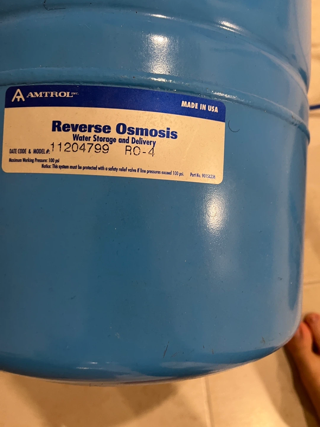 Selling an Amtrol Reverse Osmosis water storage and delivery tank. The model number is RO-4. It has a maximum working pressure of 100 psi.