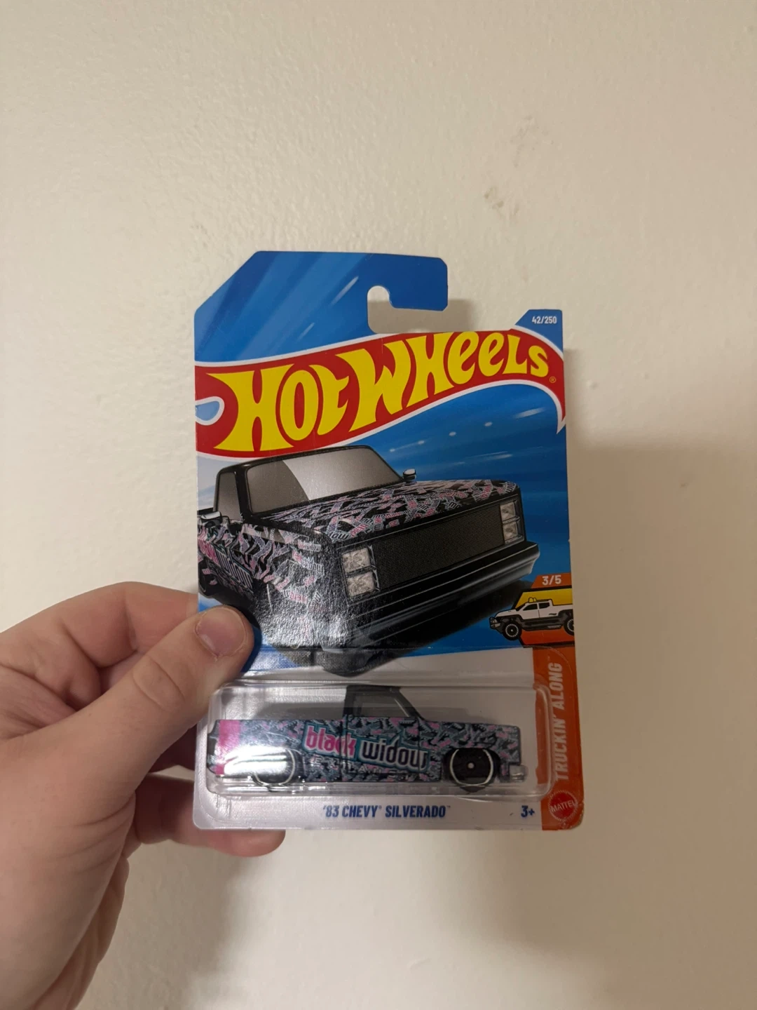 Selling a Hot Wheels '83 Chevy Silverado truck with a Black Widow design! This is part of the Truckin' Along series. It's still in its original packaging and ready for a new collection