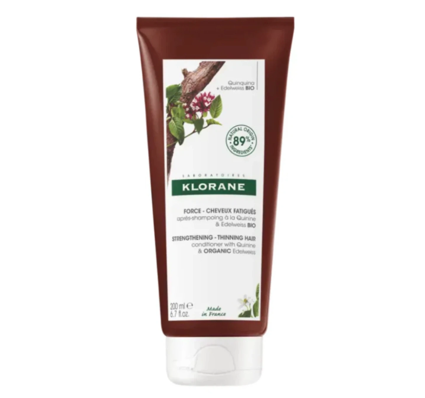 I'm selling a Klorane Strengthening - Thinning Hair Conditioner with Quinine & Organic Edelweiss. This conditioner is for force-cheveux fatigués (tired hair). It contains 89% natural origin ingredients and is made in France. It comes in a 200ml (6.7 fl.oz) bottle only used once