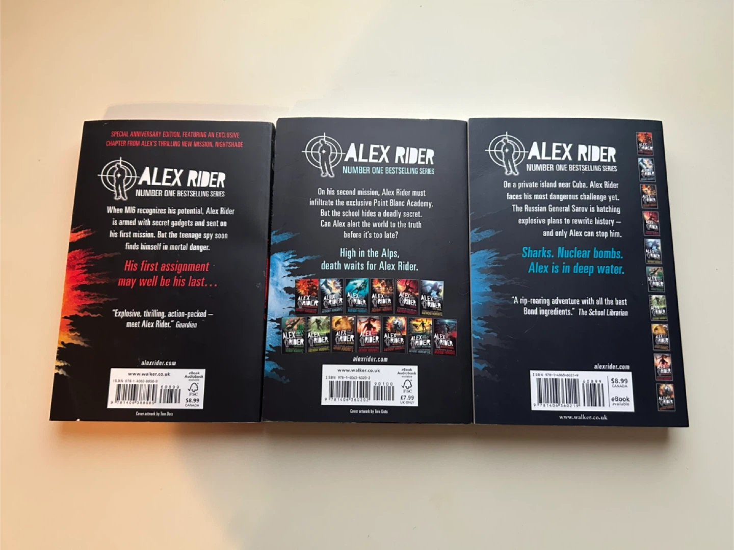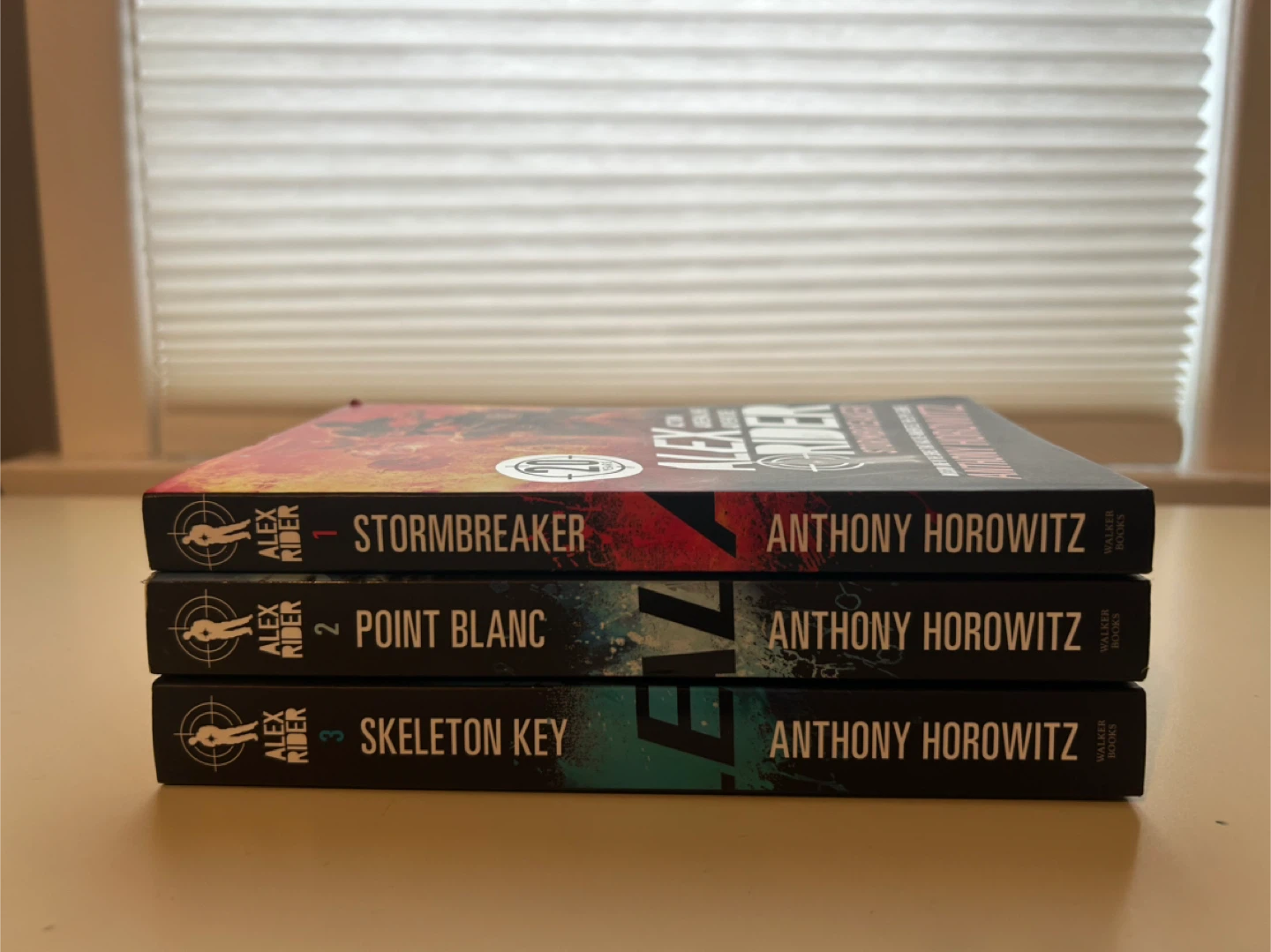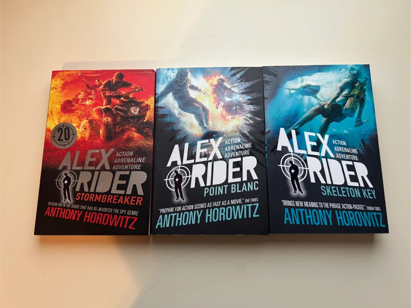 Selling the first three books from the Alex Rider series by Anthony Horowitz: Stormbreaker, Point Blanc, and Skeleton Key. They are action-adventure books. Perfect for a thrilling read!