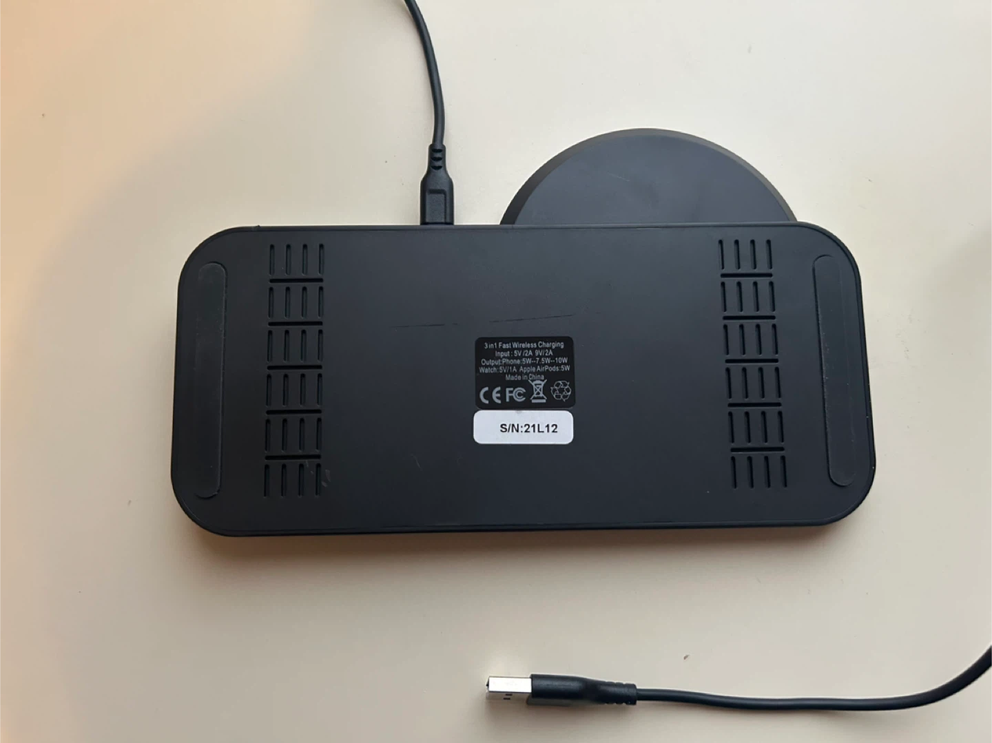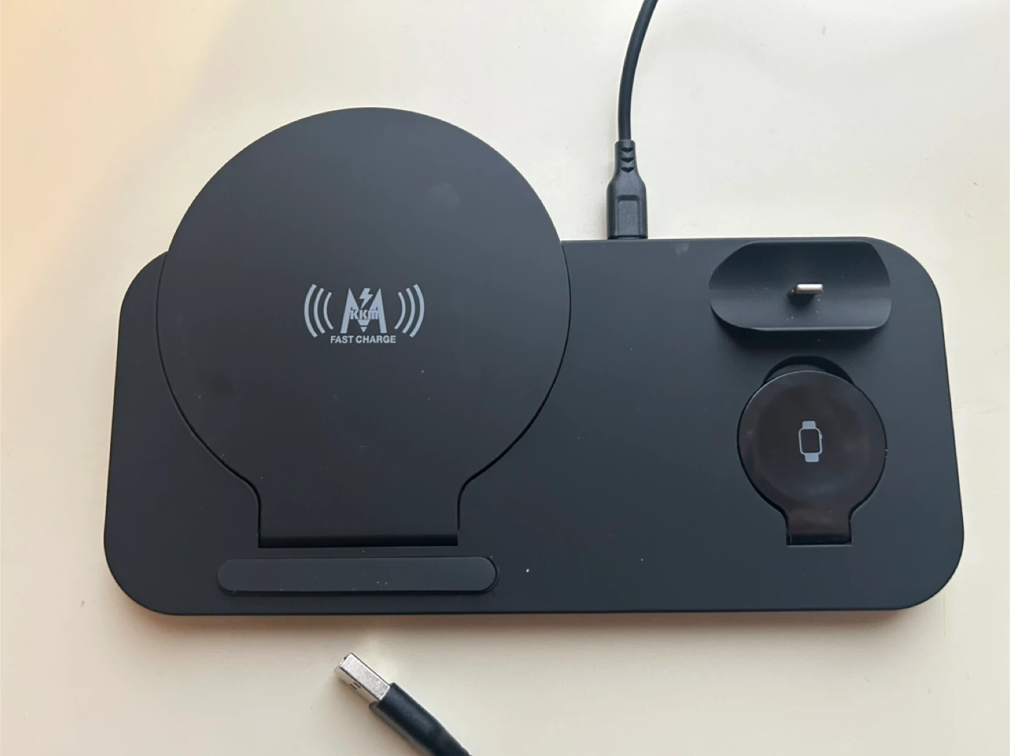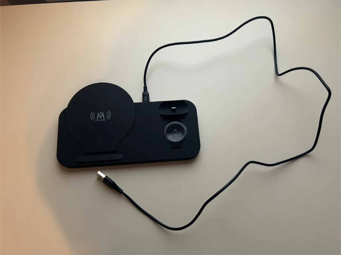Selling a 3-in-1 wireless charging station in black. It can charge your phone, watch, and earbuds all at once! It supports fast charging and has an output of 5W-7.5W-10W for phones. Comes with the charging cable.