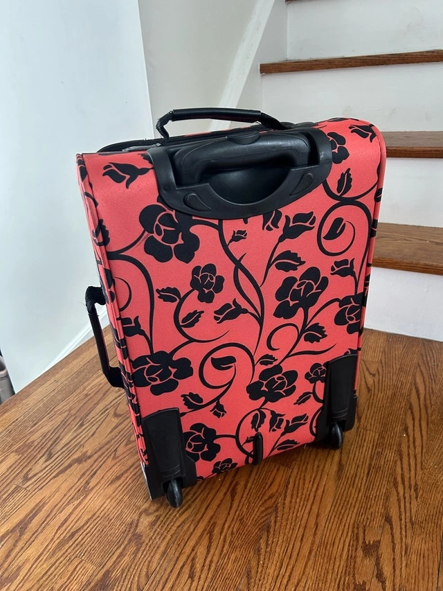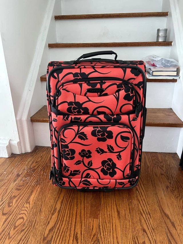 This Tracker carry-on luggage, adorned with a vibrant orange and black floral design, is perfect for your travel needs. Its compact size adheres to most airline carry-on restrictions, making it ideal for short trips. Used twice
