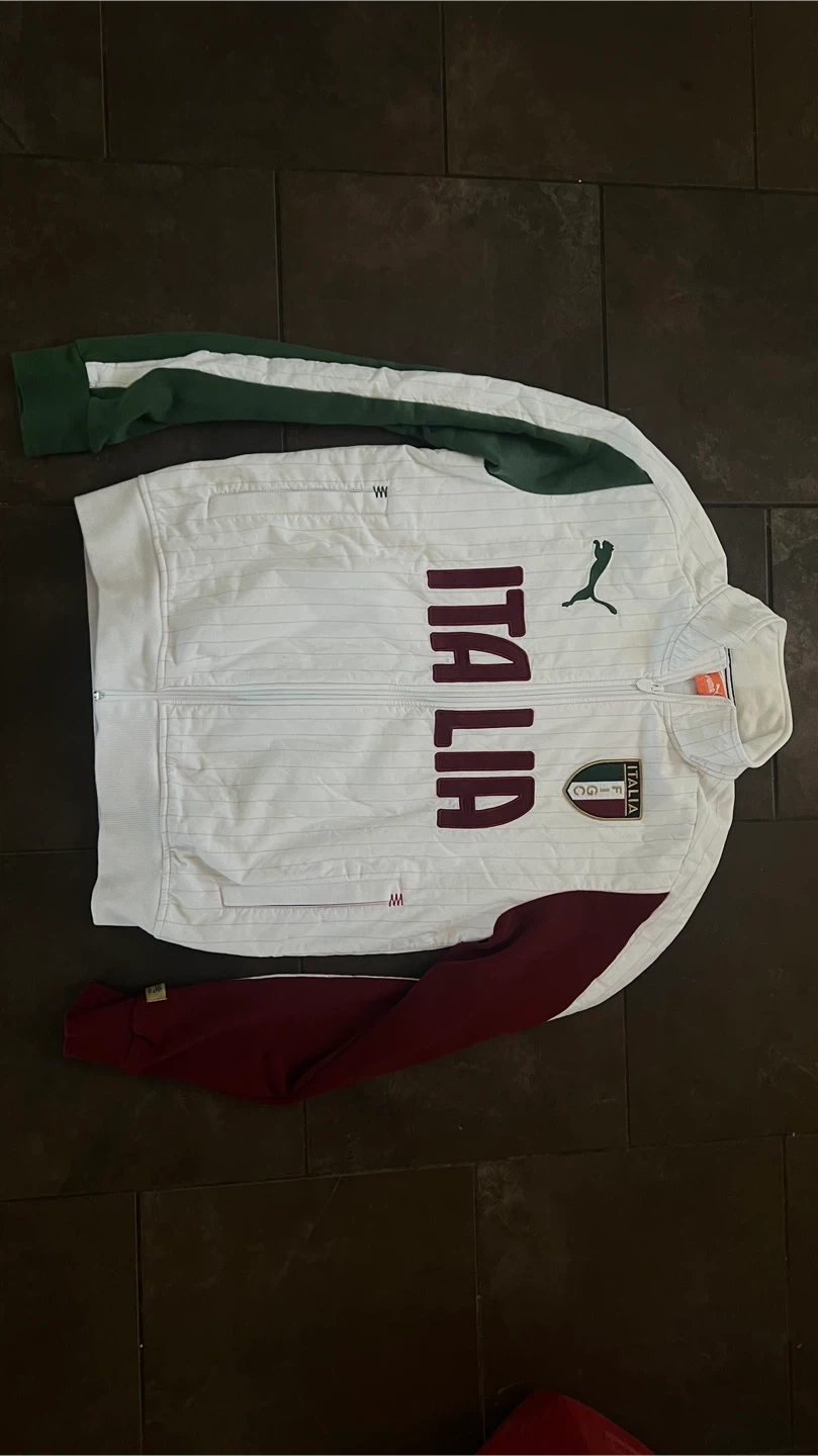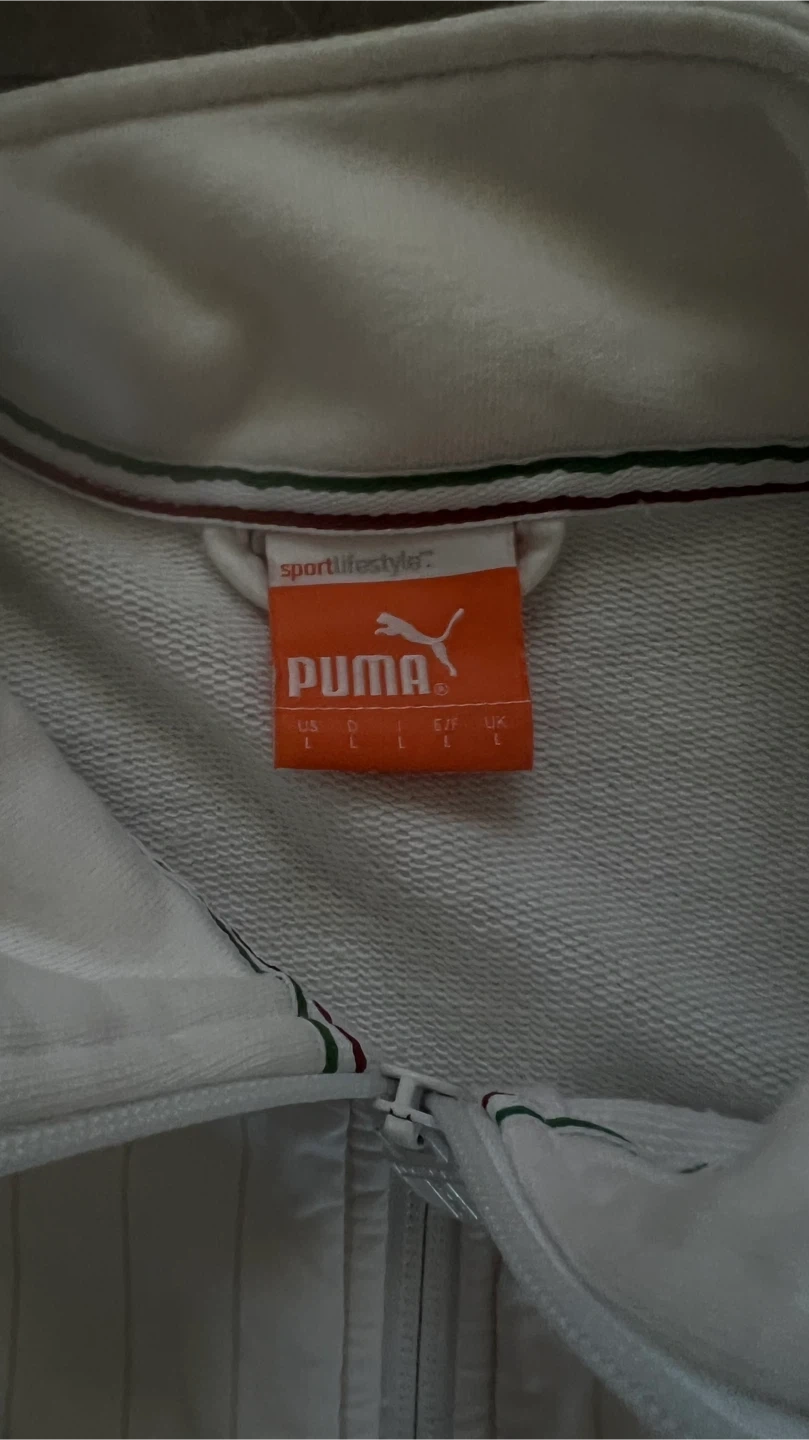 Selling a Puma Italia track jacket. It's white with green and burgundy sleeves and features the Italia logo on the front. The size tag indicates a size L.
