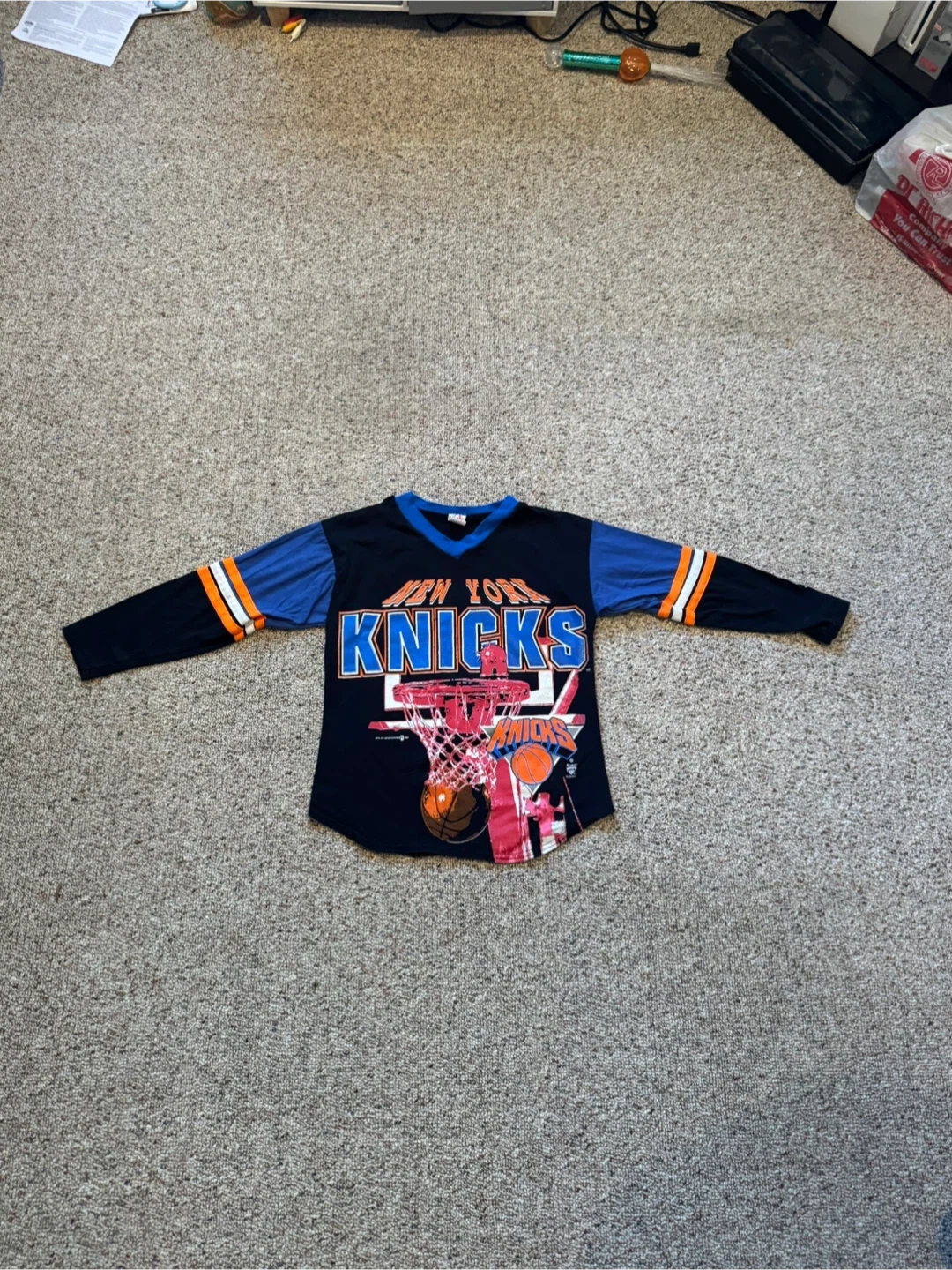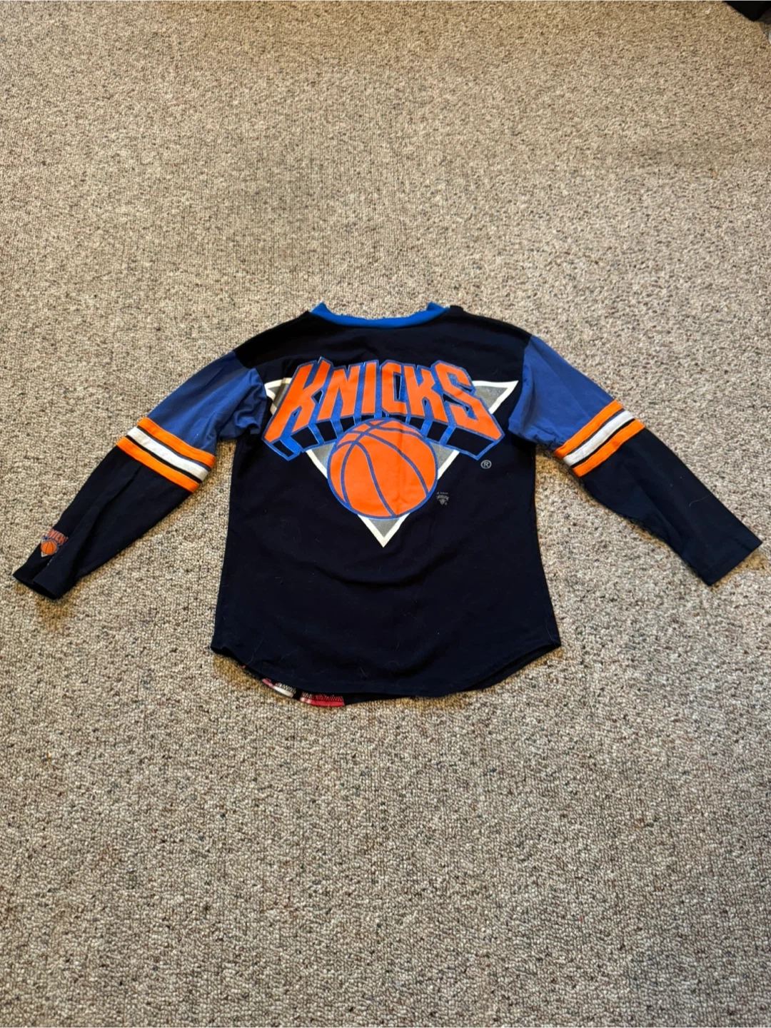 Support the Knicks with this vibrant long sleeve tee. Features bold team graphics. Perfect for young fans. Size Medium 8/10. There are 2 small tears that look easy to sew (last 2 photos)