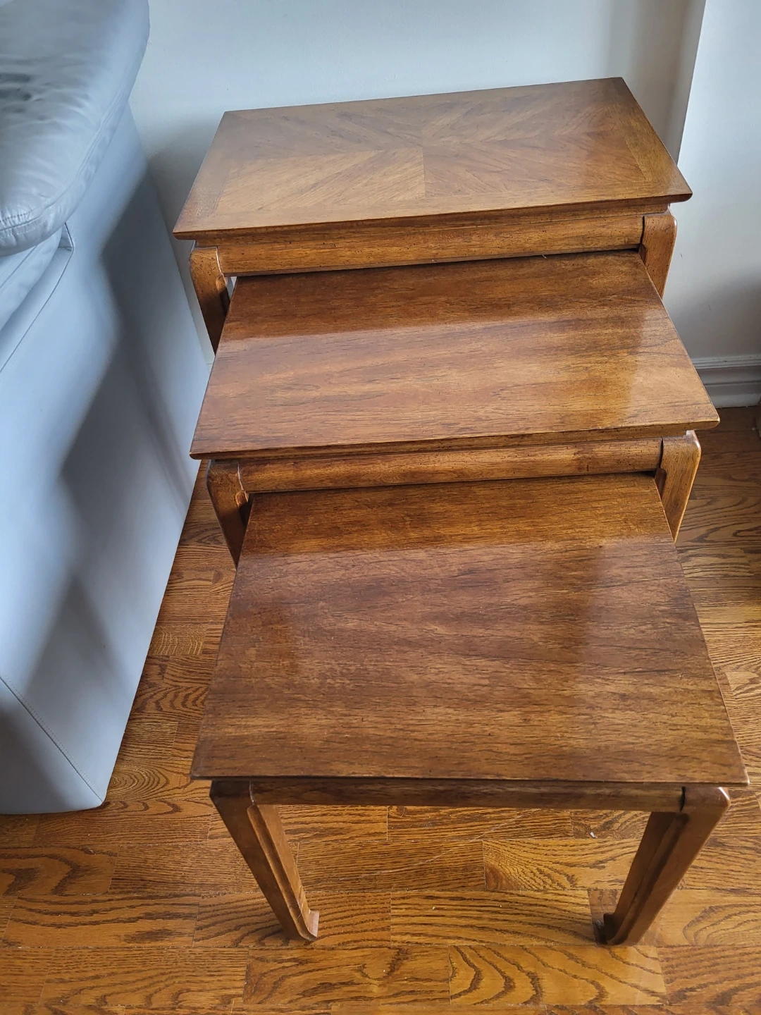 Here's a set of three wood nesting tables! They're perfect for adding a touch of elegance to your living space. These tables are in excellent condition and ready to be used in your home