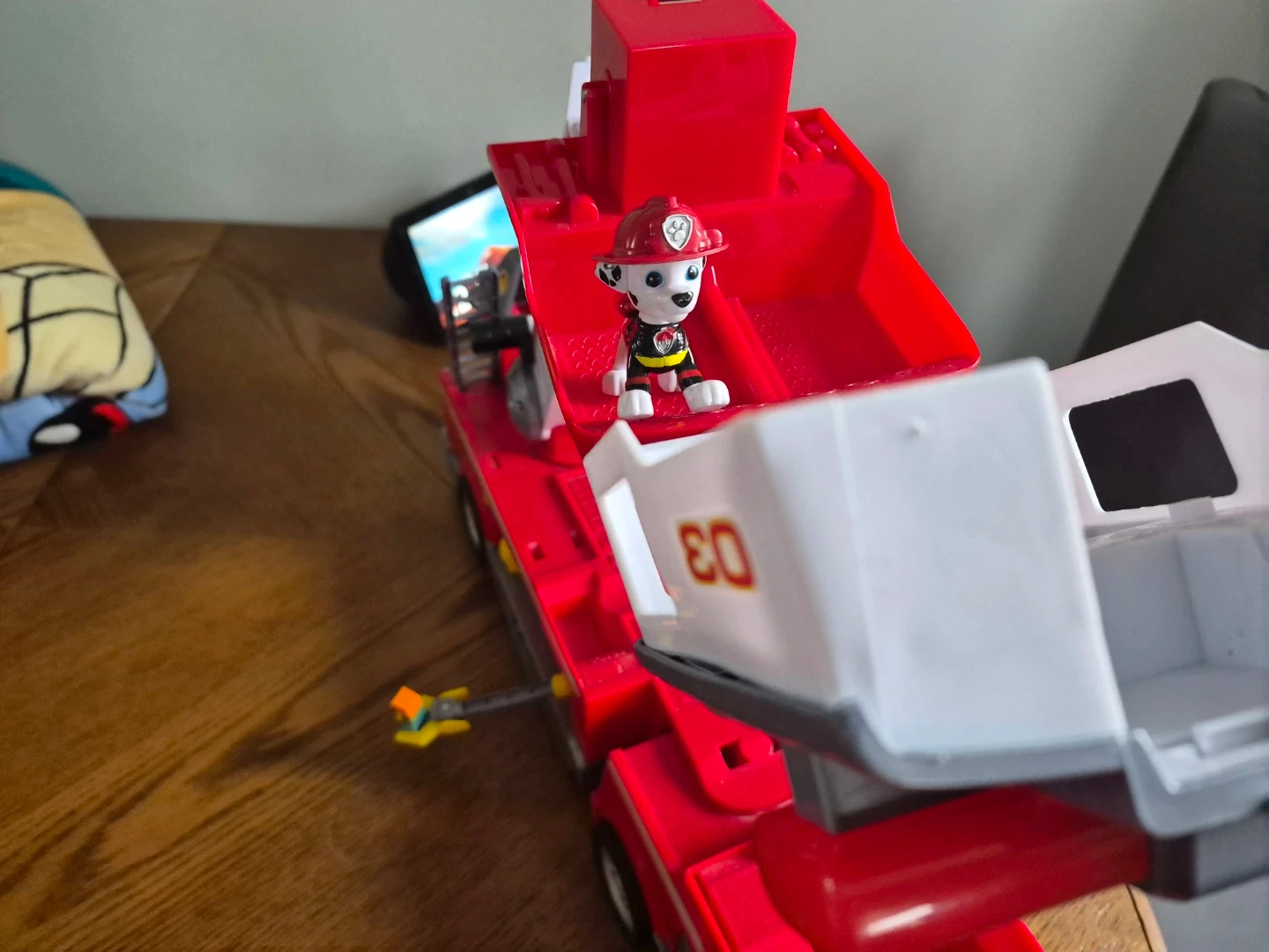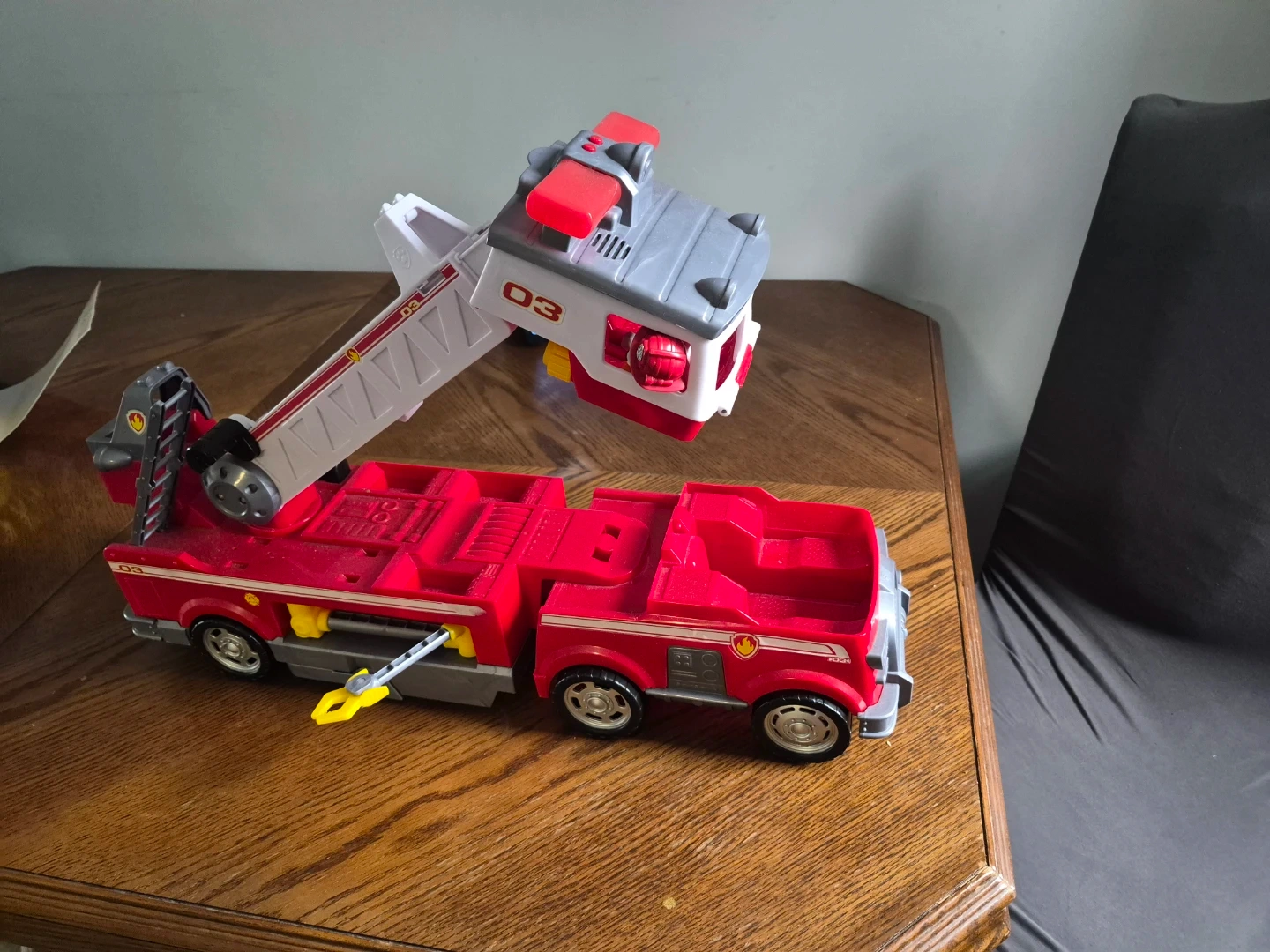 Selling a Paw Patrol Marshall's Transforming Fire Truck! It's a fun toy for kids who love Paw Patrol and fire trucks. The toy is in good condition and ready for a new home. It features Marshall, the fire dog, and a transforming fire truck with a ladder and other cool details