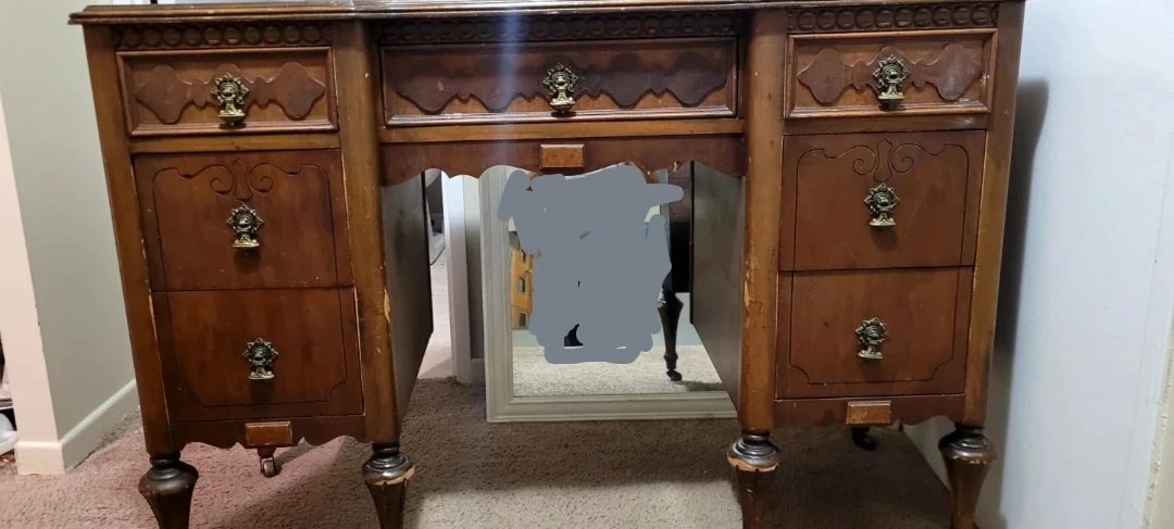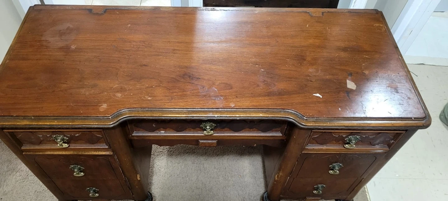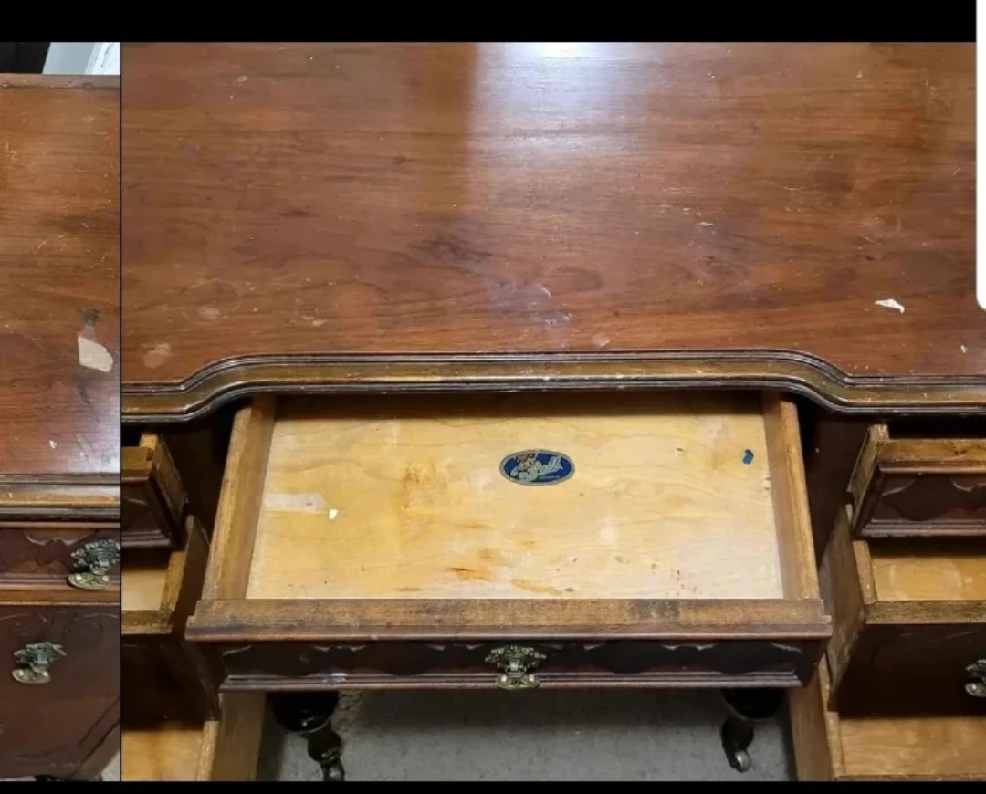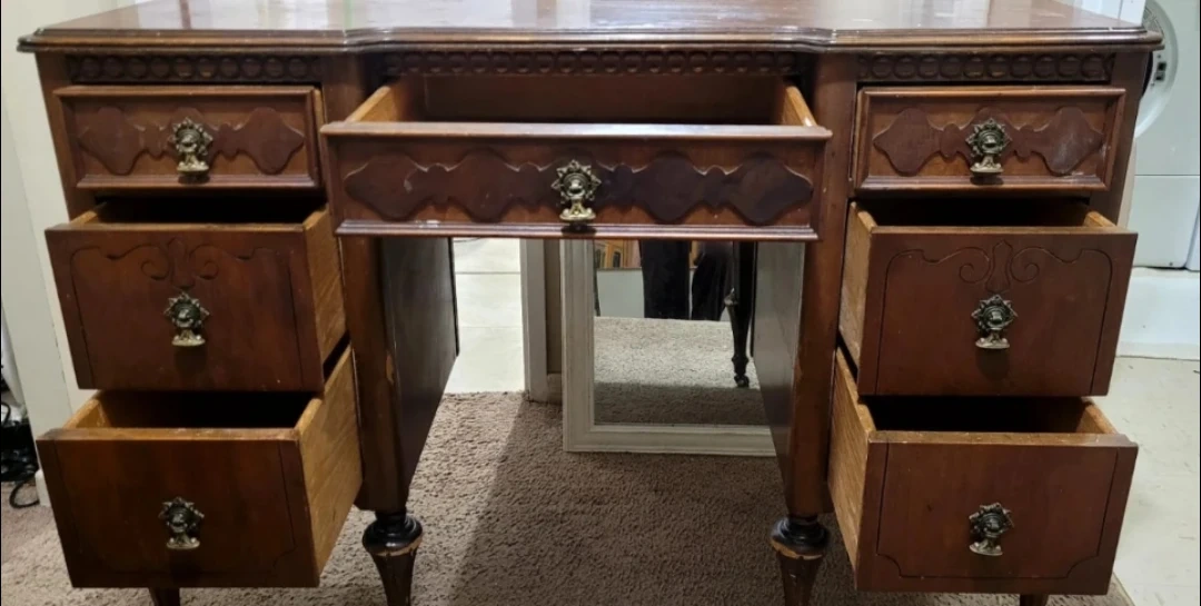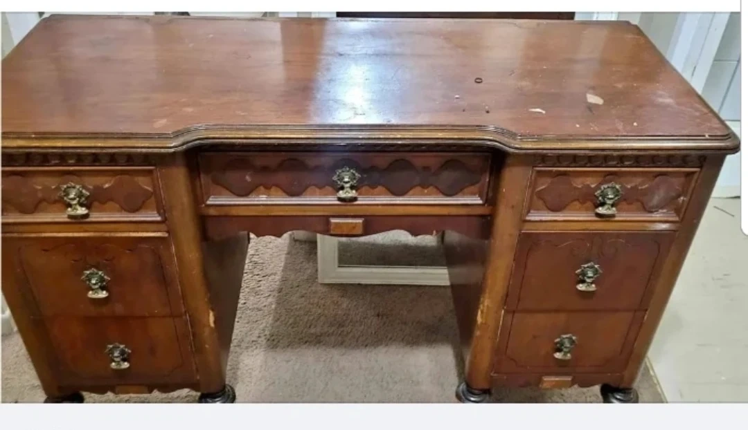 Selling an antique wooden desk. It has some signs of wear and tear, as shown in the photos. It features multiple drawers for storage and a unique, ornate design.