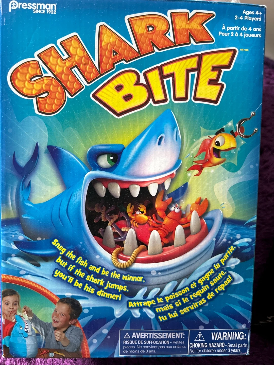 Selling a Shark Bite game by Pressman! It's suitable for ages 4+ and for 2-4 players. Snag the fish and be the winner, but if the shark jumps, you'll be his dinner!