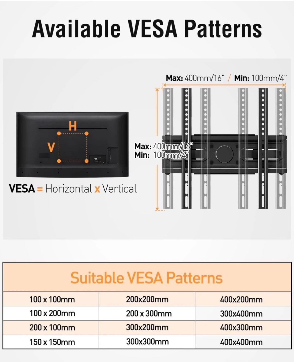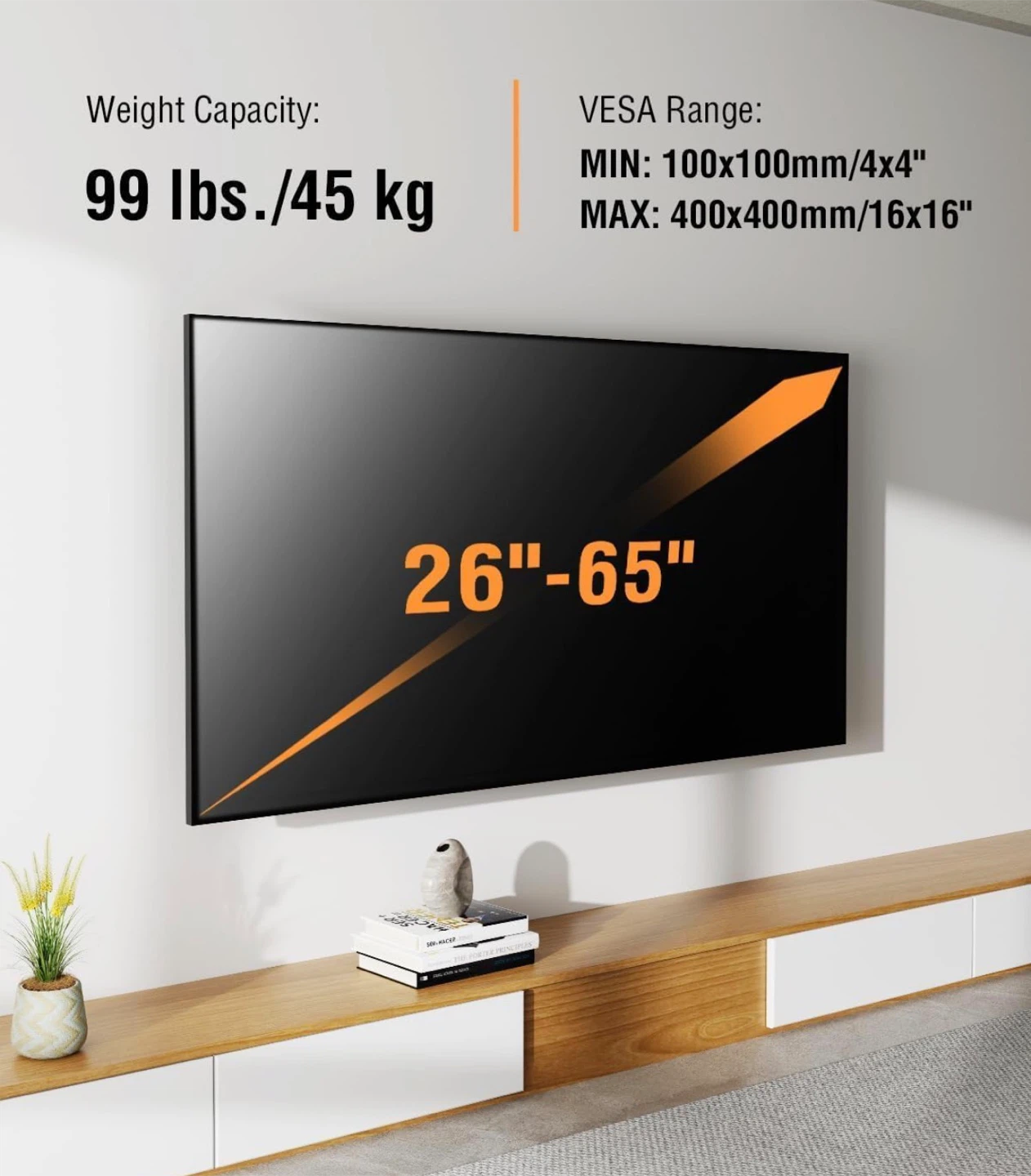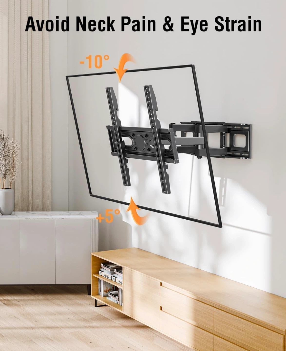 Selling a tilt swivel TV wall mount, perfect for TVs ranging from 26 to 65 inches! It can hold up to 99 lbs (45 kg). The VESA range is MIN: 100x100mm/4x4" and MAX: 400x400mm/16x16". This mount helps you avoid neck pain and eye strain with its -10° to +5° tilt. It also comes with the box and all the necessary components for installation