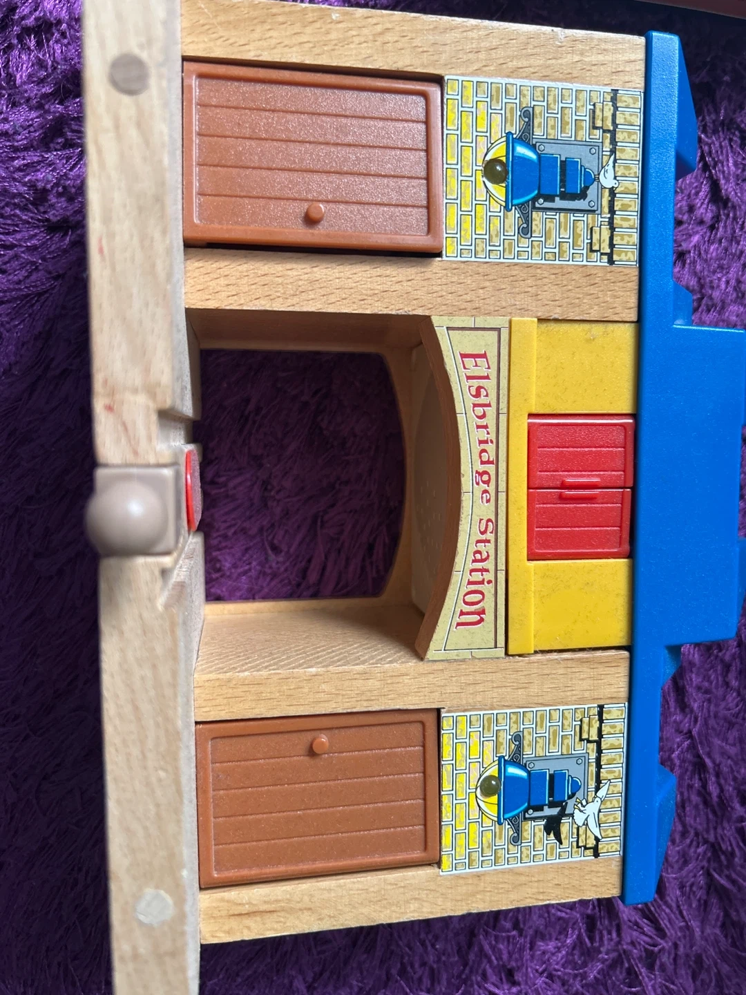Wooden train station with working garage doors. It's in good condition and ready for a new adventure!