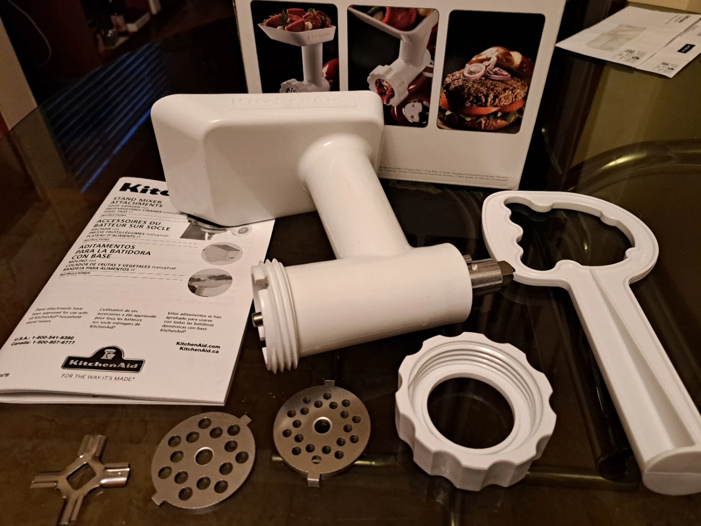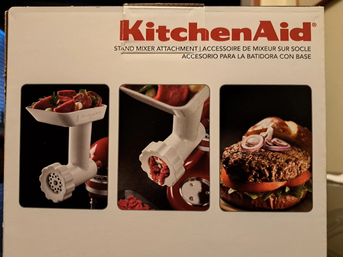 Selling a brand new KitchenAid food grinder attachment for your stand mixer. Never used, in original box with manual and all components. This attachment lets you grind meat, vegetables, and cheese.