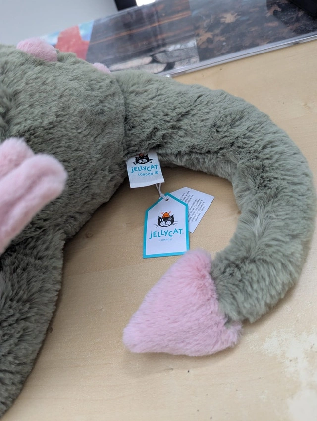 This is an authentic Jellycat Malachy (Macha) Dragon, brand new with original tags attached, preserved in pristine condition.
