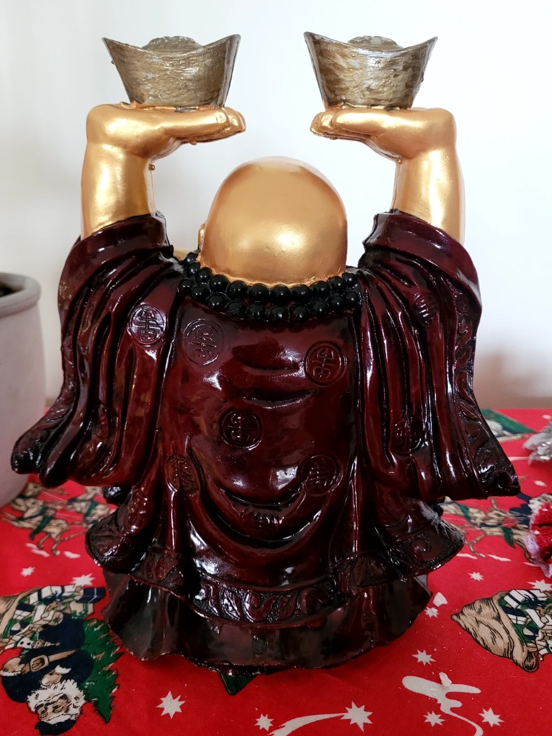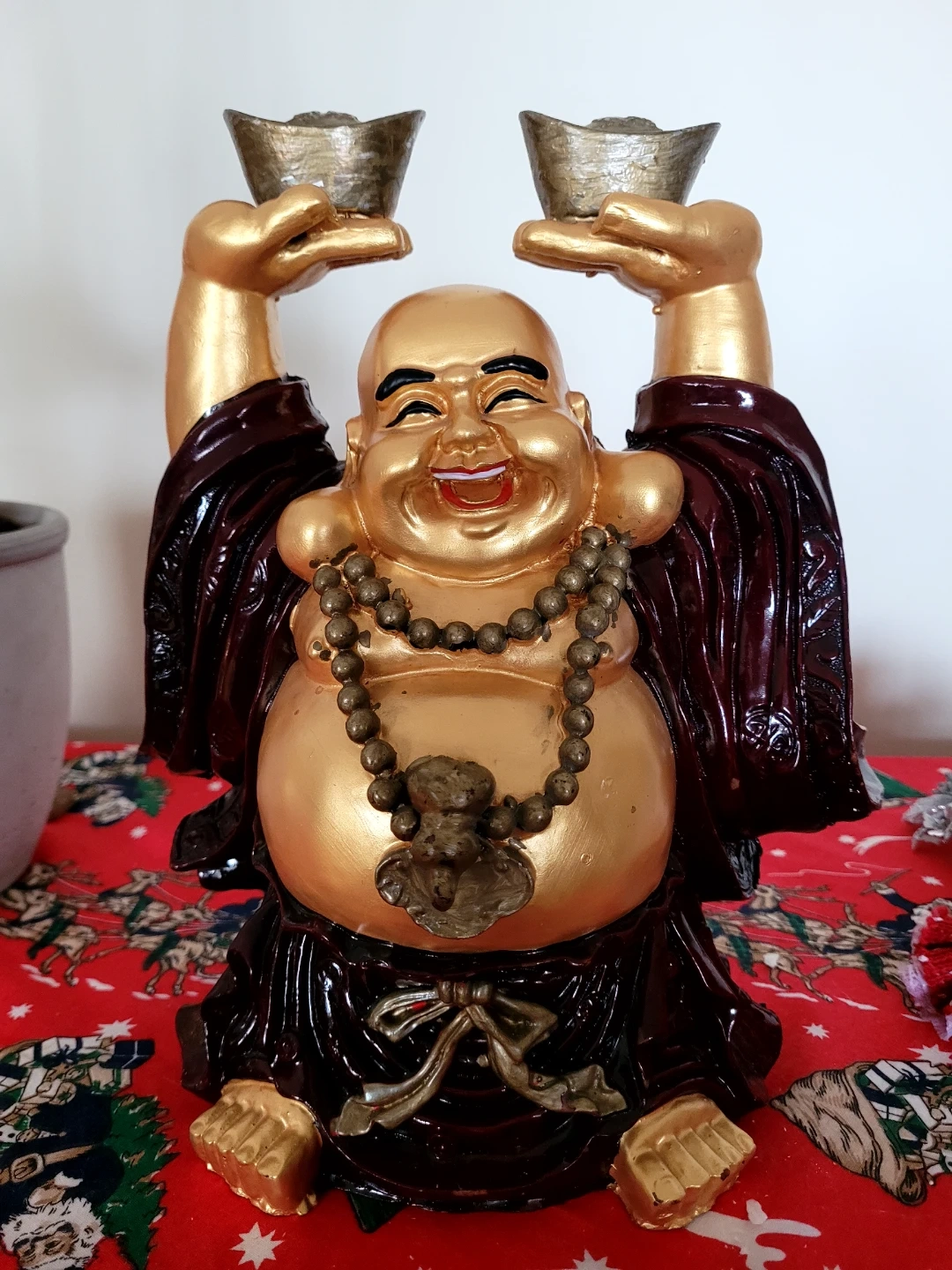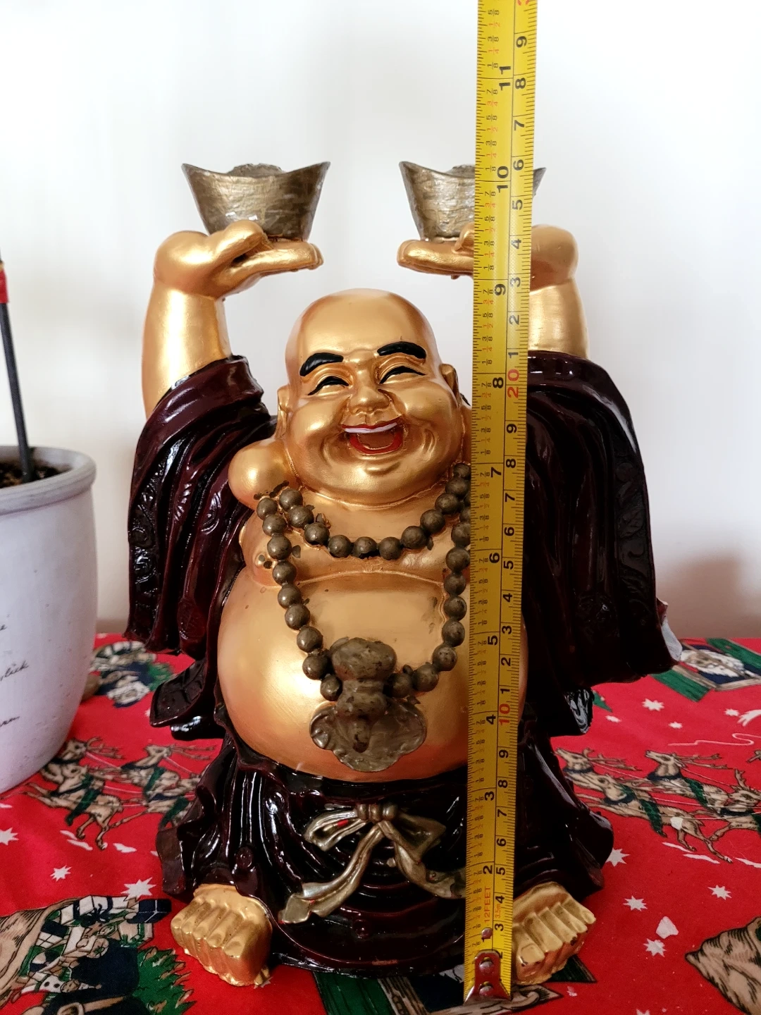 A beautiful Laughing Buddha statue for your home decor. It stands approximately 11 inches tall and features a golden finish with a dark robe and beaded necklace. A great addition to any room!
